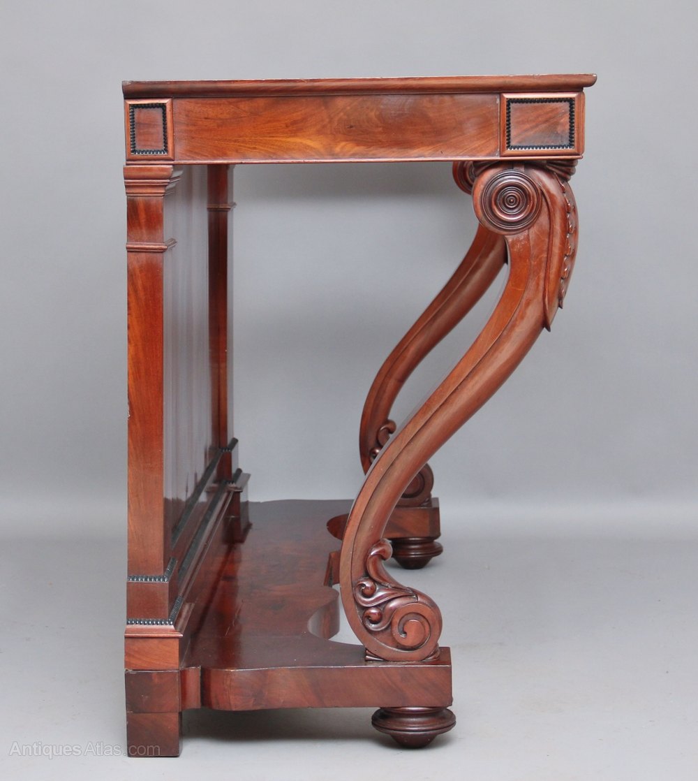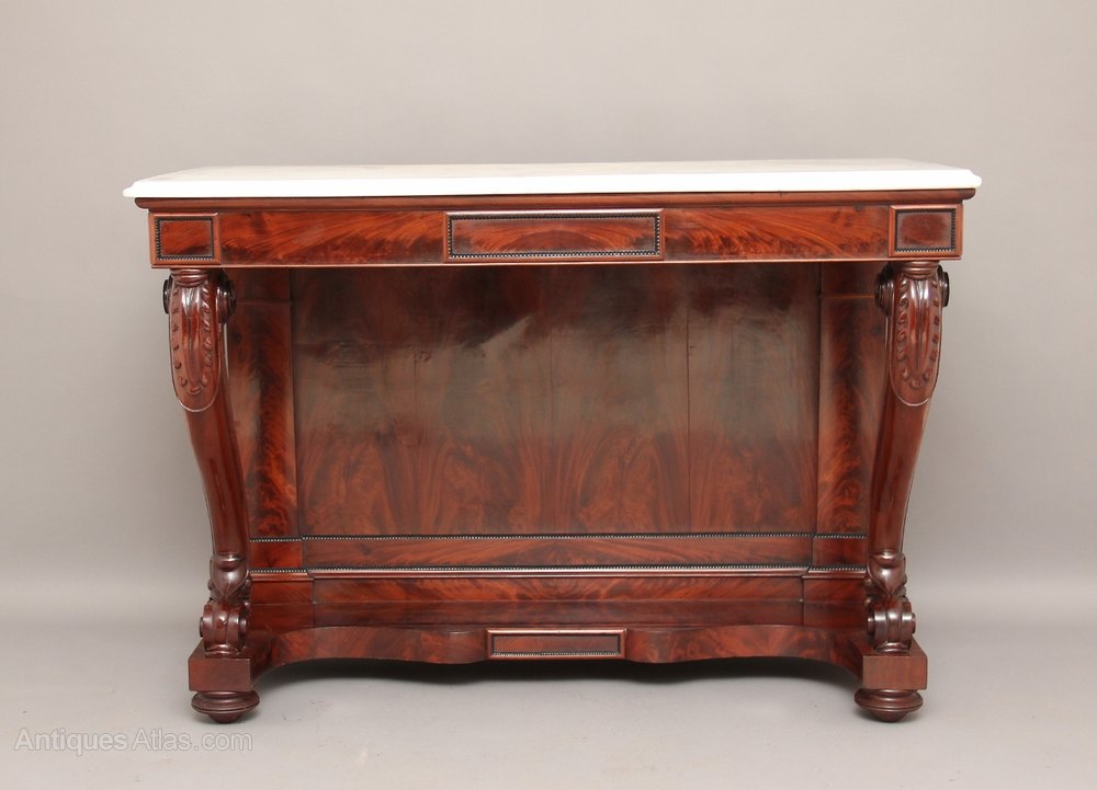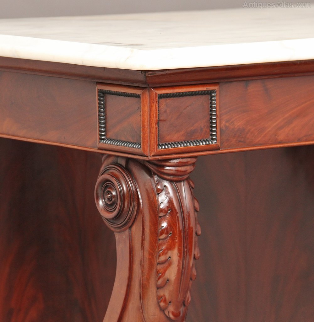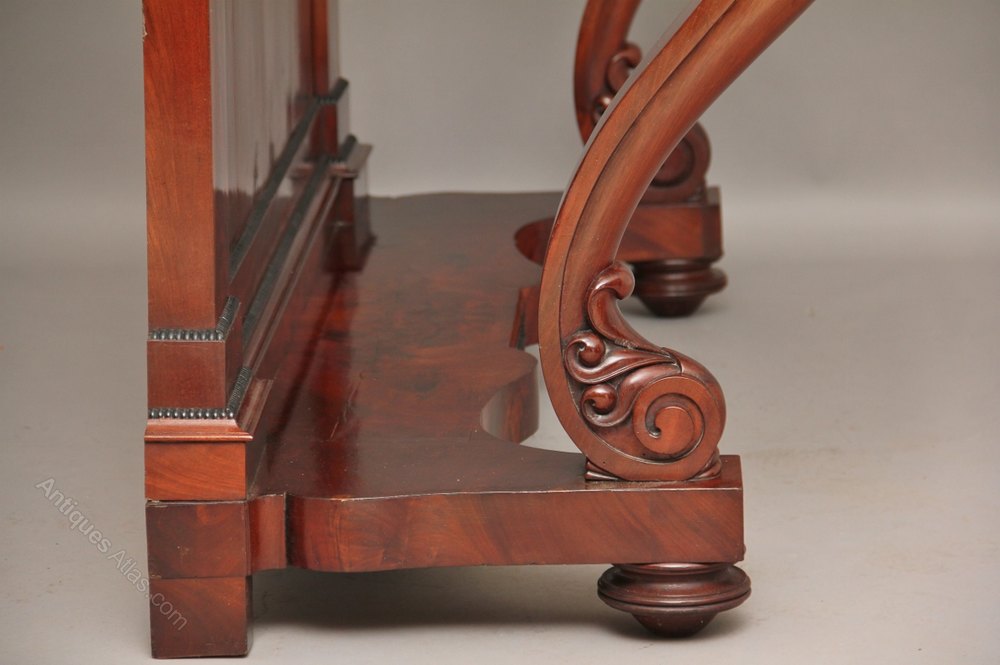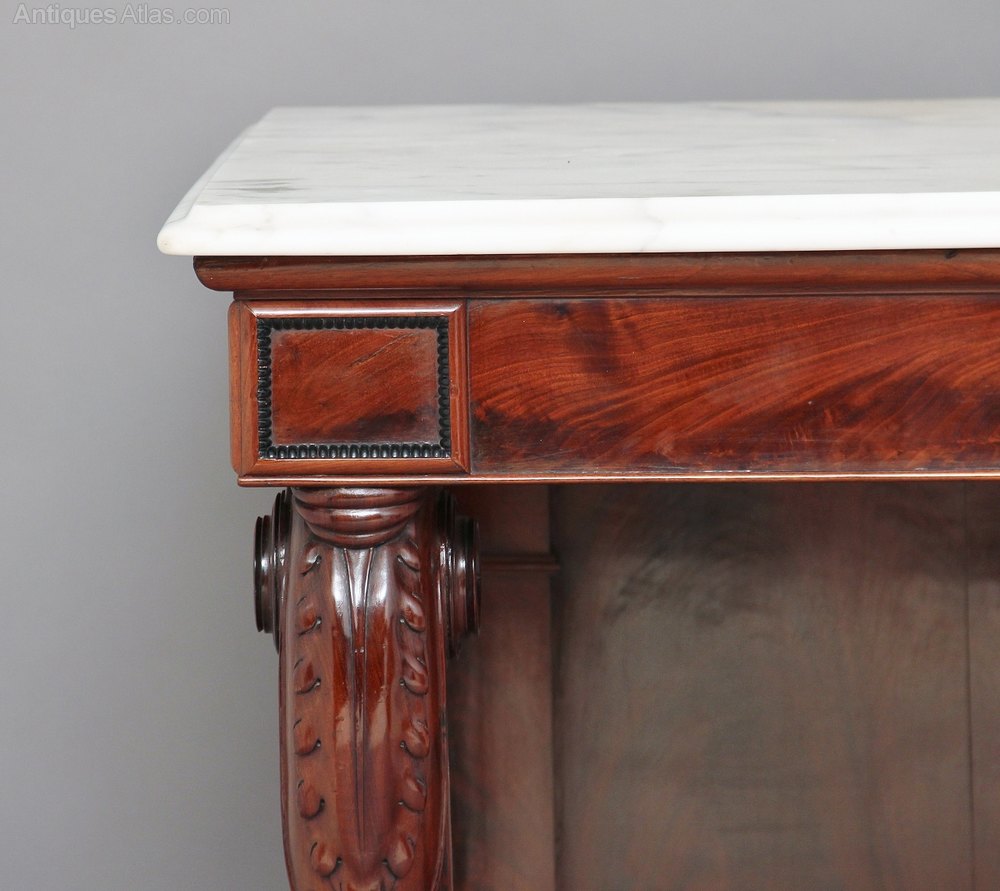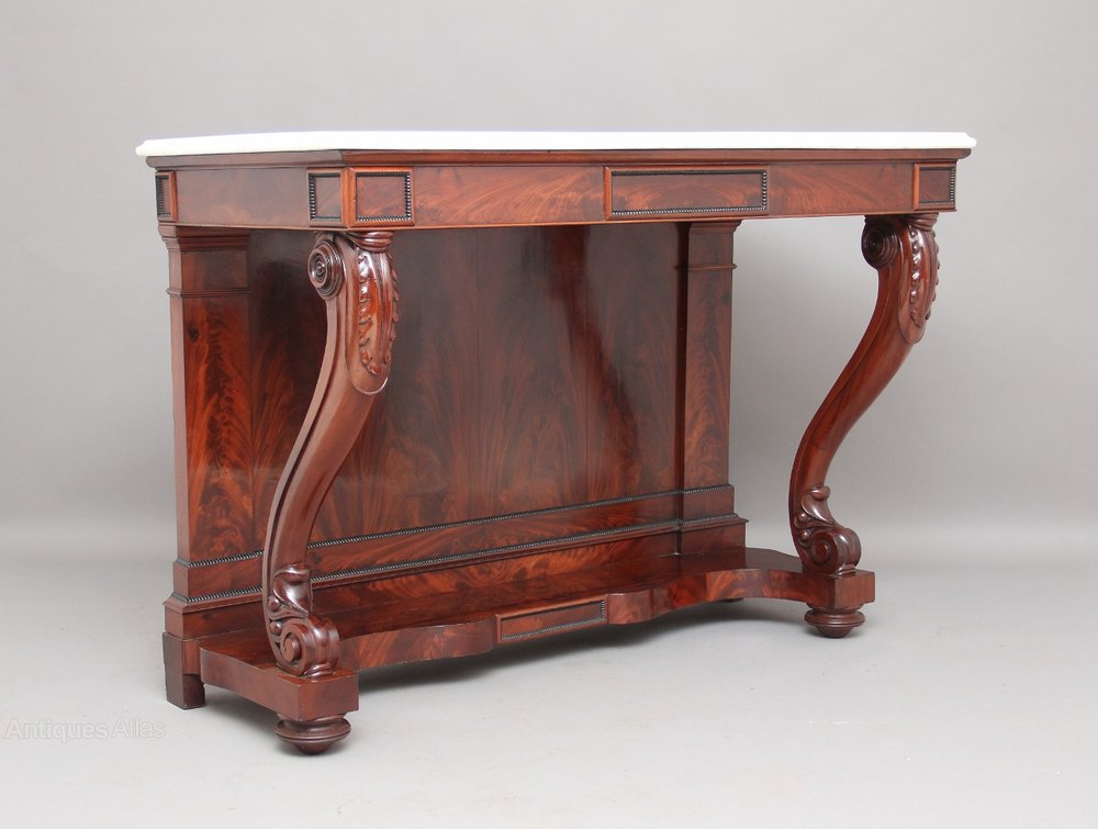 19th Century flame mahogany consul table with a moulded edge white marble top, the frieze below having carved moulded sections decorated with ebonised bead inside, supported on carved bold cabriole front supports terminating on a nice shaped plinth, resting on turned bun feet.