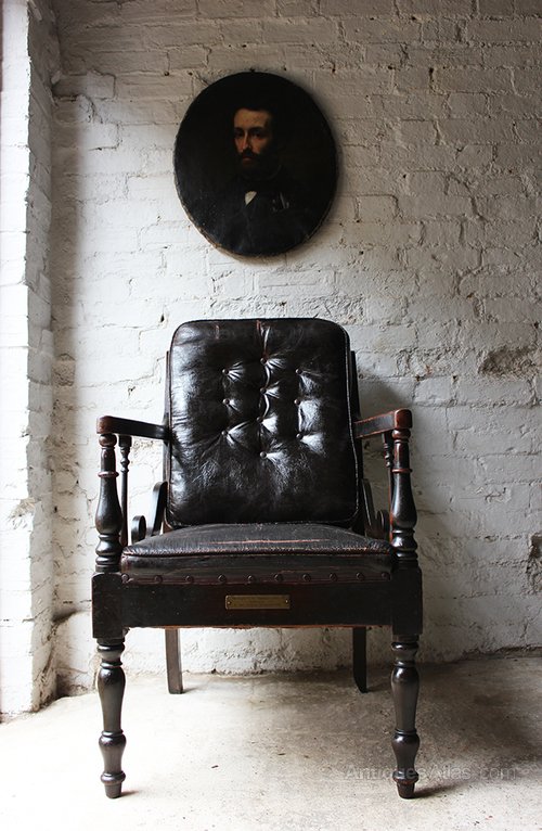 The chair is a super example of lodge antique furniture and has a lovely original untouched feel, making it hugely appealing. The rexine is worn but appealingly so, now more supple to the touch, with no tears or losses to note. The front legs would probably have once bore castors which are lacking and there is some loss to the rear right foot. The oak and stained beech is in good order throughout with only minor scuffs and an outstanding patina and colour especially to the front turnings and arms. It proves a comfortable chair indeed, perfect for lounging, reading or watching. The chair has a faint arts and crafts influence and also something of the plantation chair about it but its proportions are heavier and essentially it is a unique, commission design.
