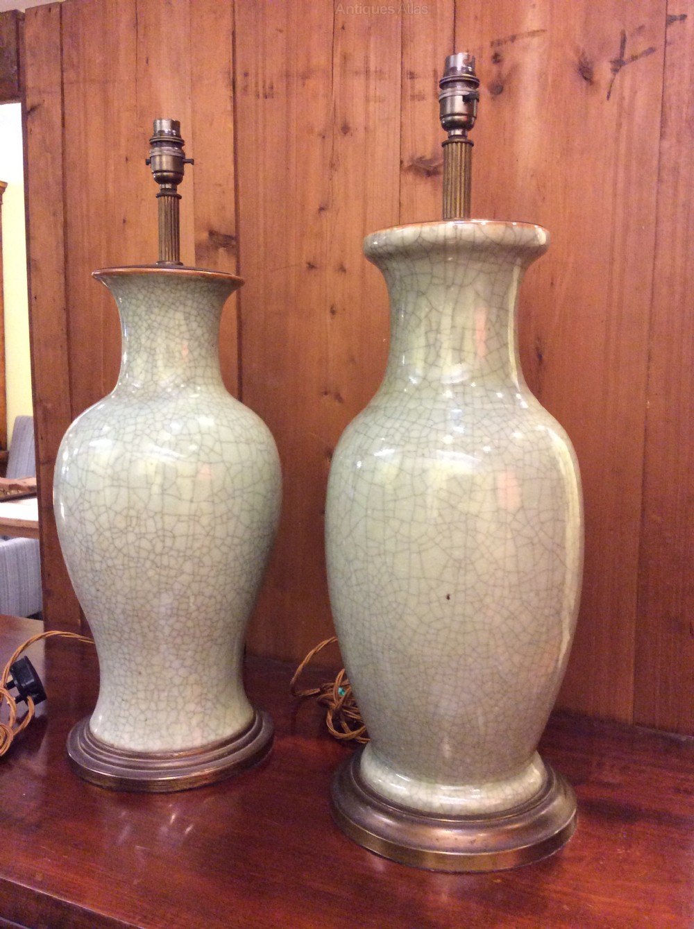 A near pair of Celadon crackle glazed large table lamps, c.1920. Rewired and PAT tested. One lamp is slightly shorter 59.5cm