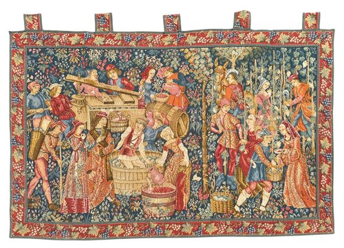 This beautifully woven tapestry depicts a lively medieval grape harvest and winemaking scene, inspired by 15th–16th century Flemish and French originals. The design shows peasants and nobles together in the vineyard: grape-picking, treading grapes in vats, filling barrels, and sharing wine. The scene is rich with color and detail, framed by a border of grapevines and leaves.