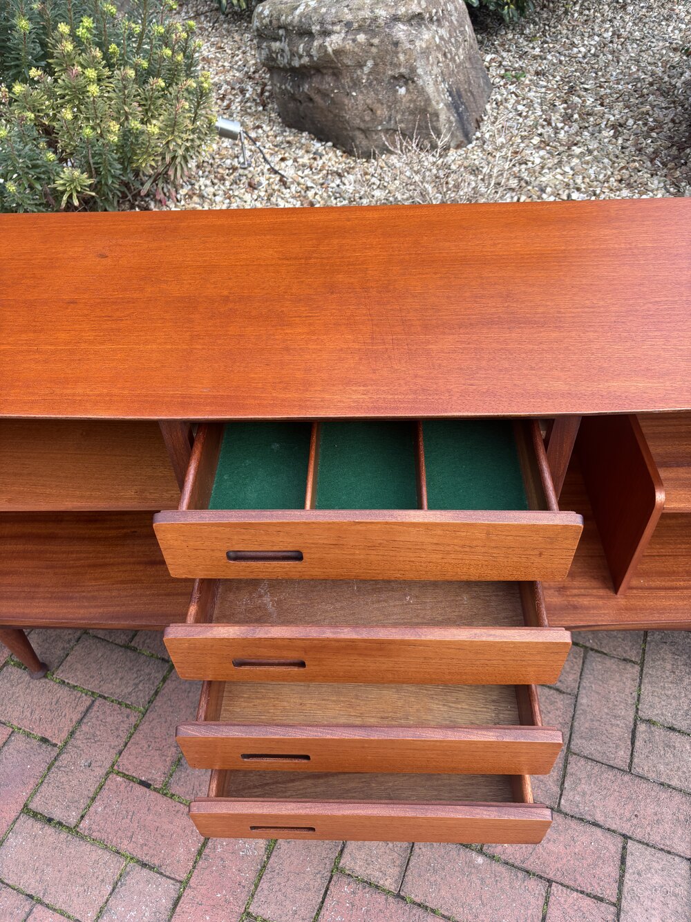 A stylish mid century teak sideboard by Meredew c1960's. The sideboard design is slightly bowed, two cupboard doors on either side having a curved notched top, inset handles and shelved interiors. A central set of four sculpted drawers, again with inset handles, original green baize with three divides to the top drawer, and stands on tapering legs.