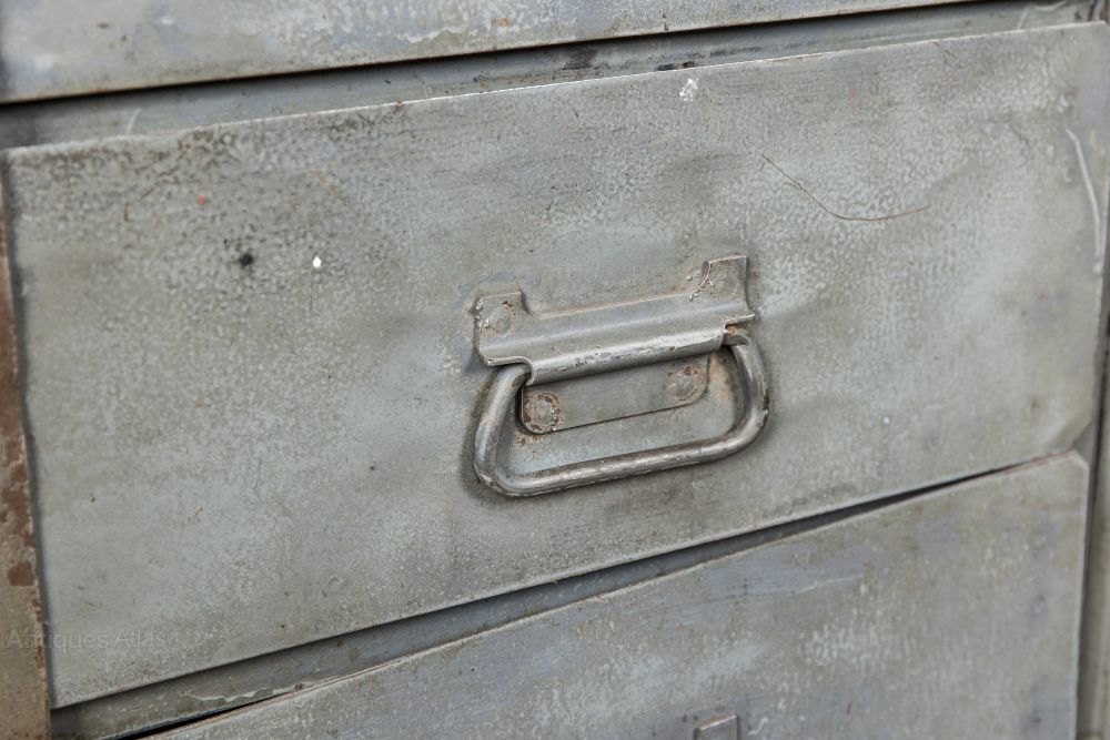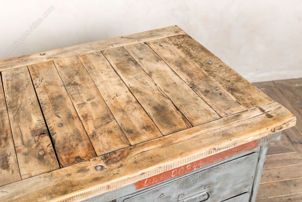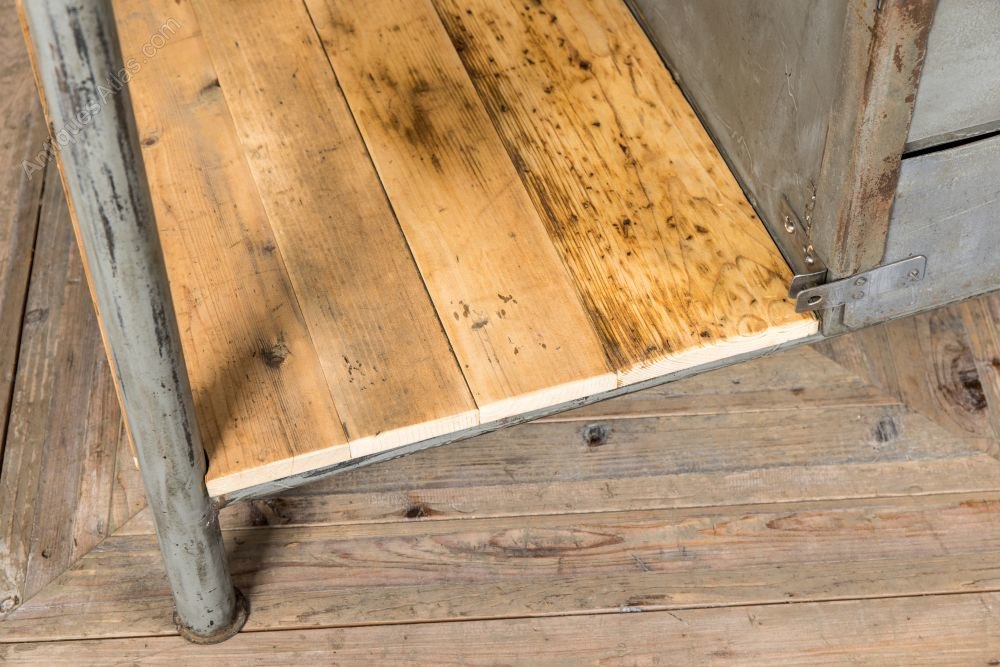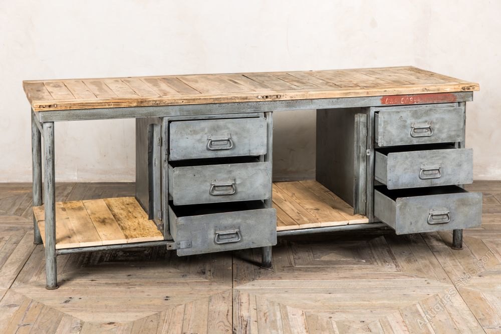 Rescued from an abandoned garage in Germany, this Vintage Metal Sideboard has lots of industrial style. The sideboard would work in a large, urban inspired kitchen or commercial facility, this sideboard has plenty of space to keep bits and pieces, with six pull out metal drawers, two shelves to the bottom and a wooden, rustic, textured top.