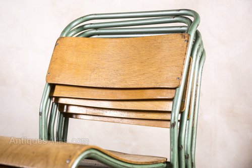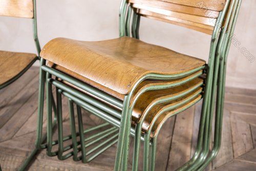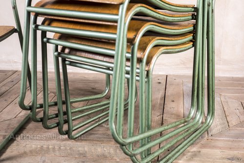 These industrial stacking chairs feature a tubular steel frame with aged, metallic green paintwork and a plywood seat.