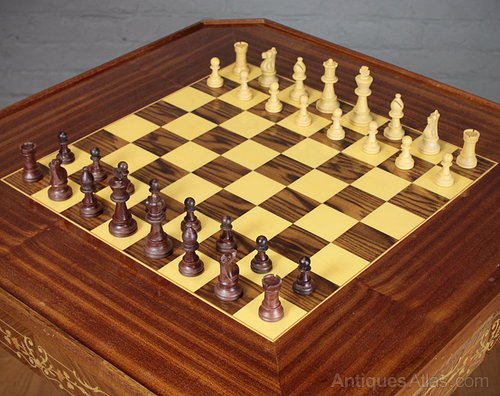 Remarkable 1960′s Italian games table. Flip the ostentatiously inlaid top for a chess board, underneath which is a second top with a backgammon board on one side and green baize for cards on the other. Below that is a roulette table which slides apart to reveal the wheel, chips, chess and chequers pieces etc.