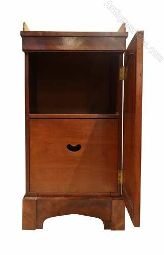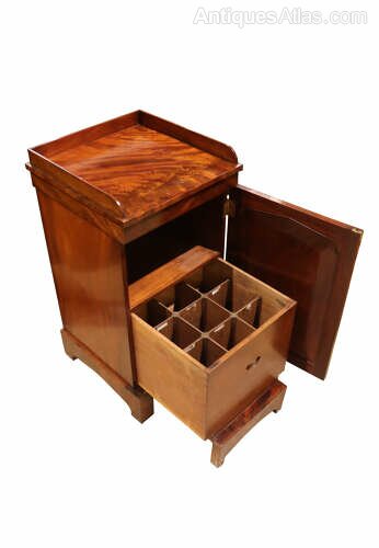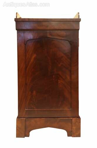 A handsome mid-19th century flame mahogany pedestal cupboard, circa 1840. The richly figured flame mahogany exterior features a panelled door and a moulded top with a raised gallery edge. Inside, the cupboard offers practical storage with a fixed shelf above a pull-out drawer fitted with bottle divisions, making it ideal for use as a drinks cabinet or for general storage.