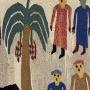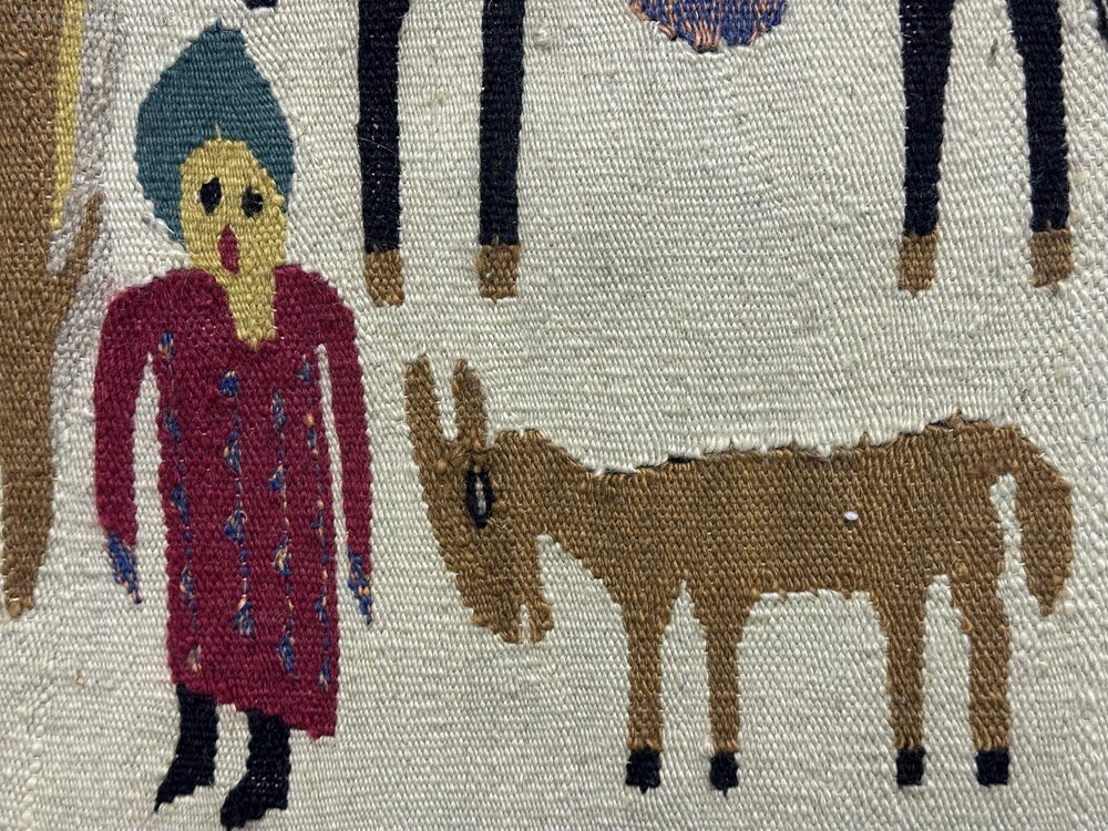 A charming handwoven Egyptian folk tapestry, dating to the mid-20th century, depicting a lively village scene. Figures in brightly coloured traditional robes stand beneath stylised trees, with donkeys laden for travel — a vivid narrative of daily life captured in textile art.