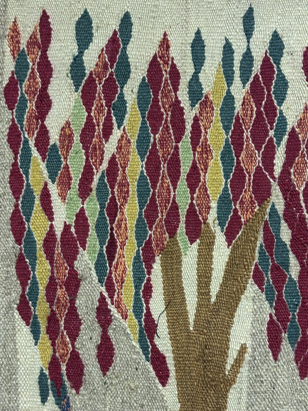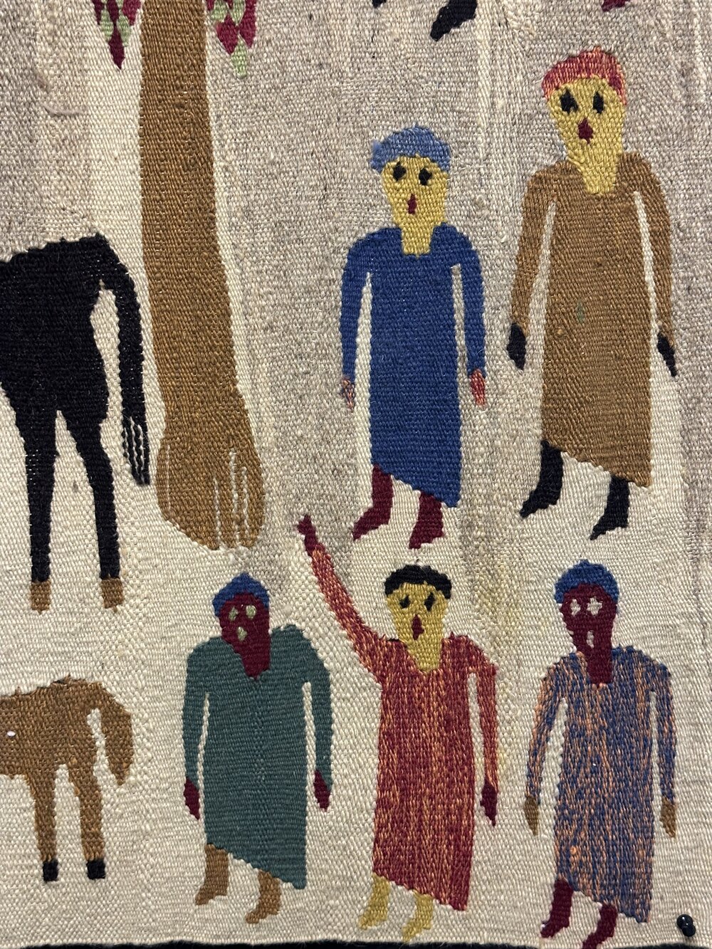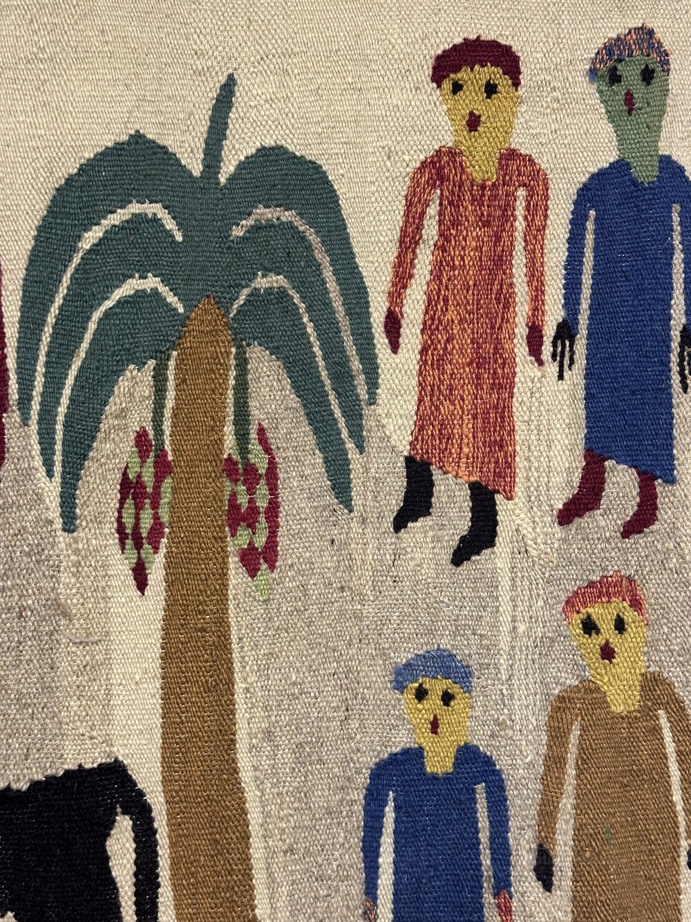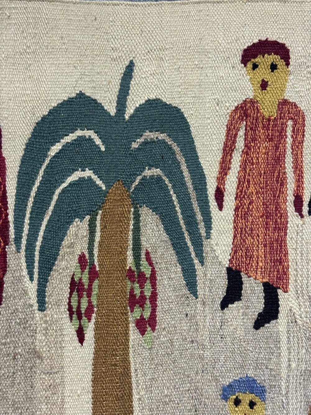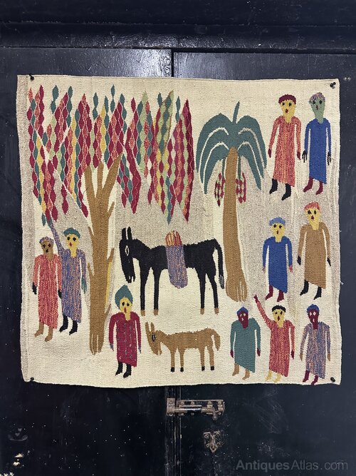 The tapestry is woven in wool with a natural undyed ground, enhanced by bold reds, blues, greens, and ochres. The design reflects the distinctive naïve style associated with Egyptian village weaving, most famously produced at the Ramses Wissa Wassef Art Centre, where artisans created one-of-a-kind pictorial weavings blending folk tradition with modernist expression.Egyptian folk tapestries of this period are increasingly sought after for their originality, colour, and strong sense of narrative. Unlike commercial rugs, each piece was woven individually, with no two ever alike.Good condition overall, with strong colours and only minor signs of age. Edges remain intact and the textile is suitable for hanging display.