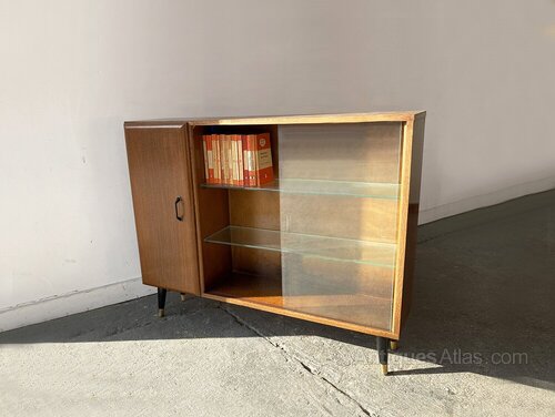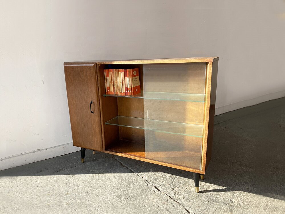 An elegant and compact teak Mid-Century bookcase from English manufacturer Turnidge. Comprises 2 sliding glass doors opening onto 2 glass shelves. Beside this is a single door cupboard compartment. Small faux brass details are the cupboard handle and the tips of the feet. Manufacturer’s label present which reads ‘A Turnidge Product’.