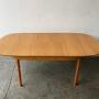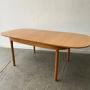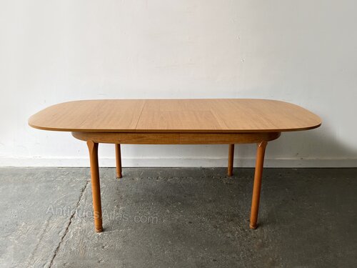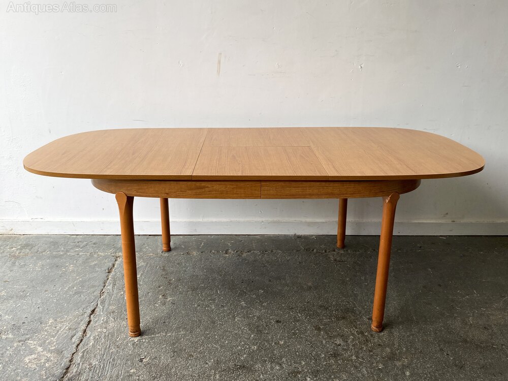 This extending dining table reflects the Schreiber aesthetic, featuring a wood-grain Formica top paired with elegant, solid beech tapering legs.
