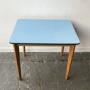 This is a compact Mid-Century dining or kitchen table featuring a rectangular top with rounded corners. The tabletop has a sky blue Formica laminate surface with a black edge band. It stands on four slightly tapered solid Beech legs with a warm tone.