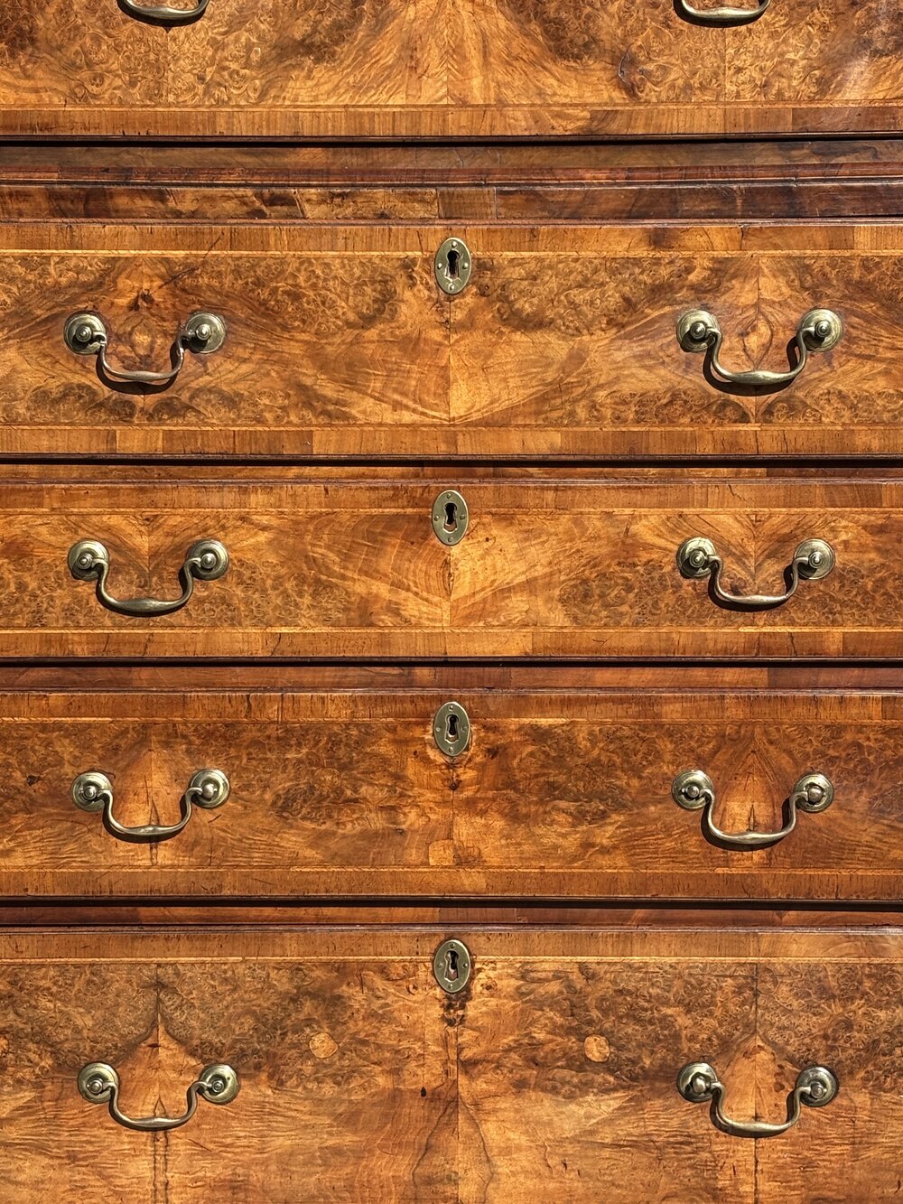 A very fine mid-18th century George II period burr walnut secretaire chest on chest, also known as a Tallboy. This stunning piece of early Georgian antique furniture is cross and featherbanded throughout, showcasing matched veneers of exceptional colour and patina.