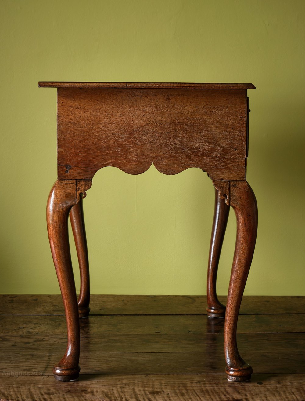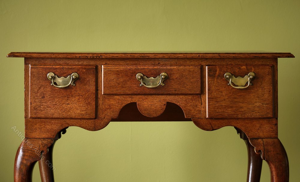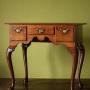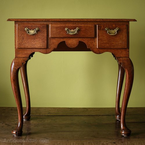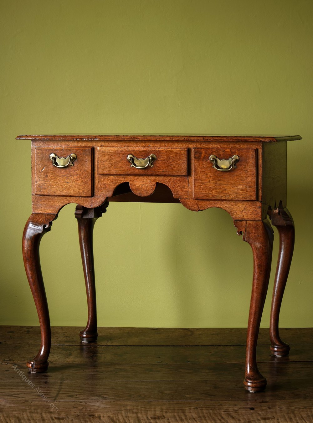 A classic side table or lowboy containing three drawers applied with their original solid plate handles above a boldly undulating frieze.