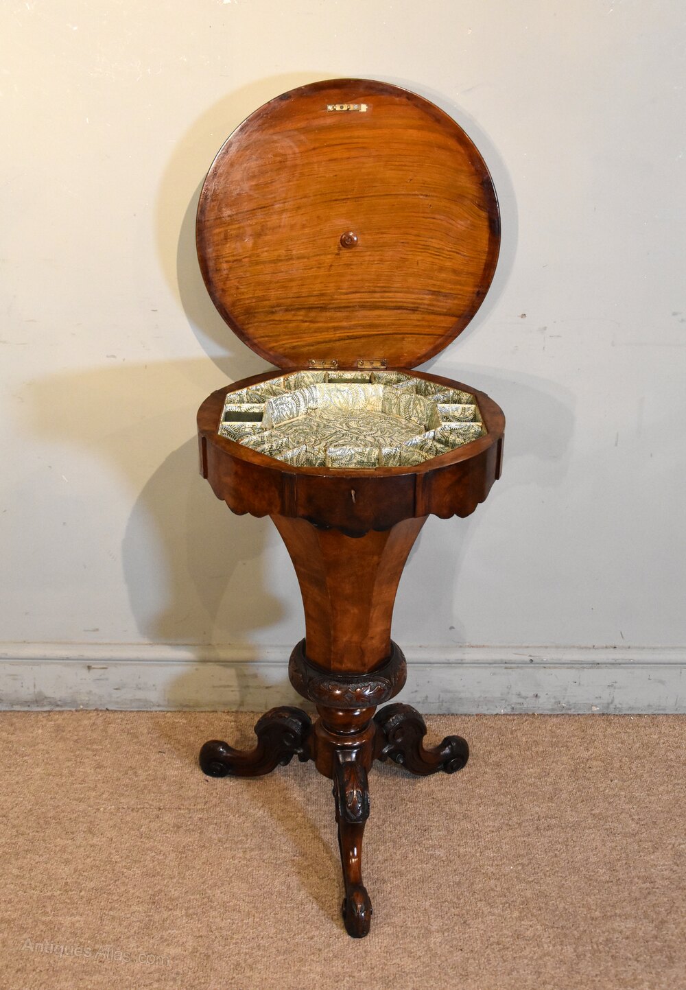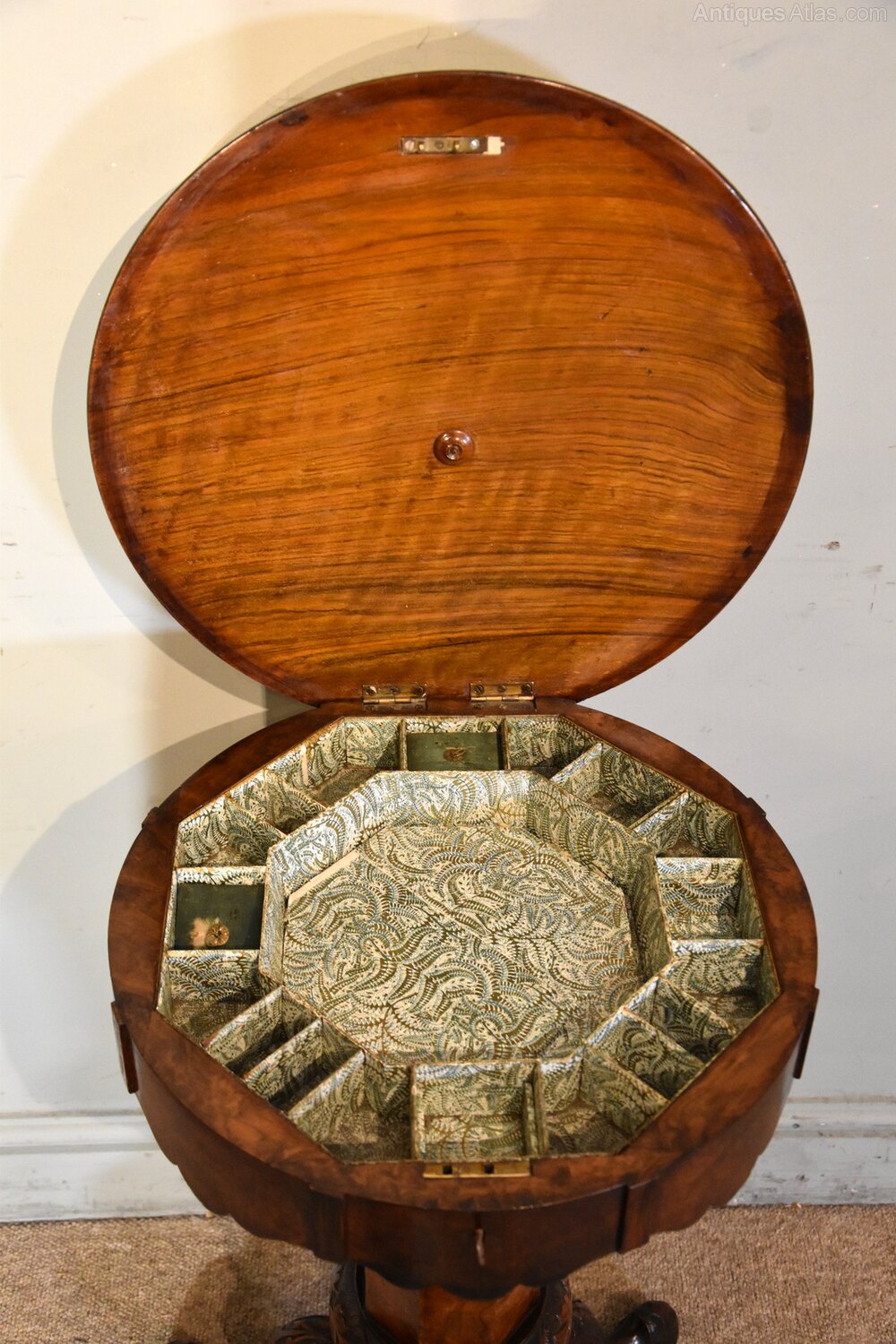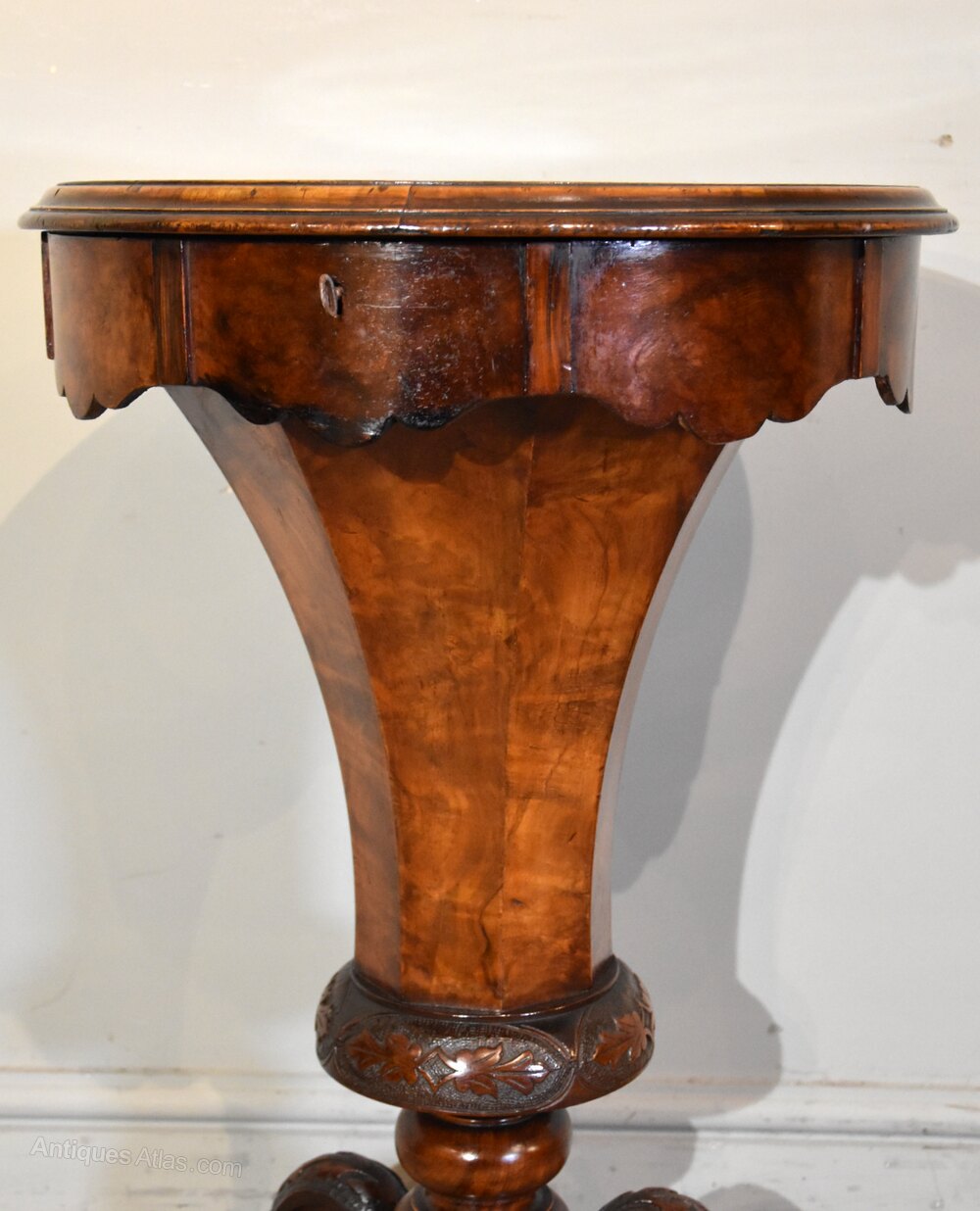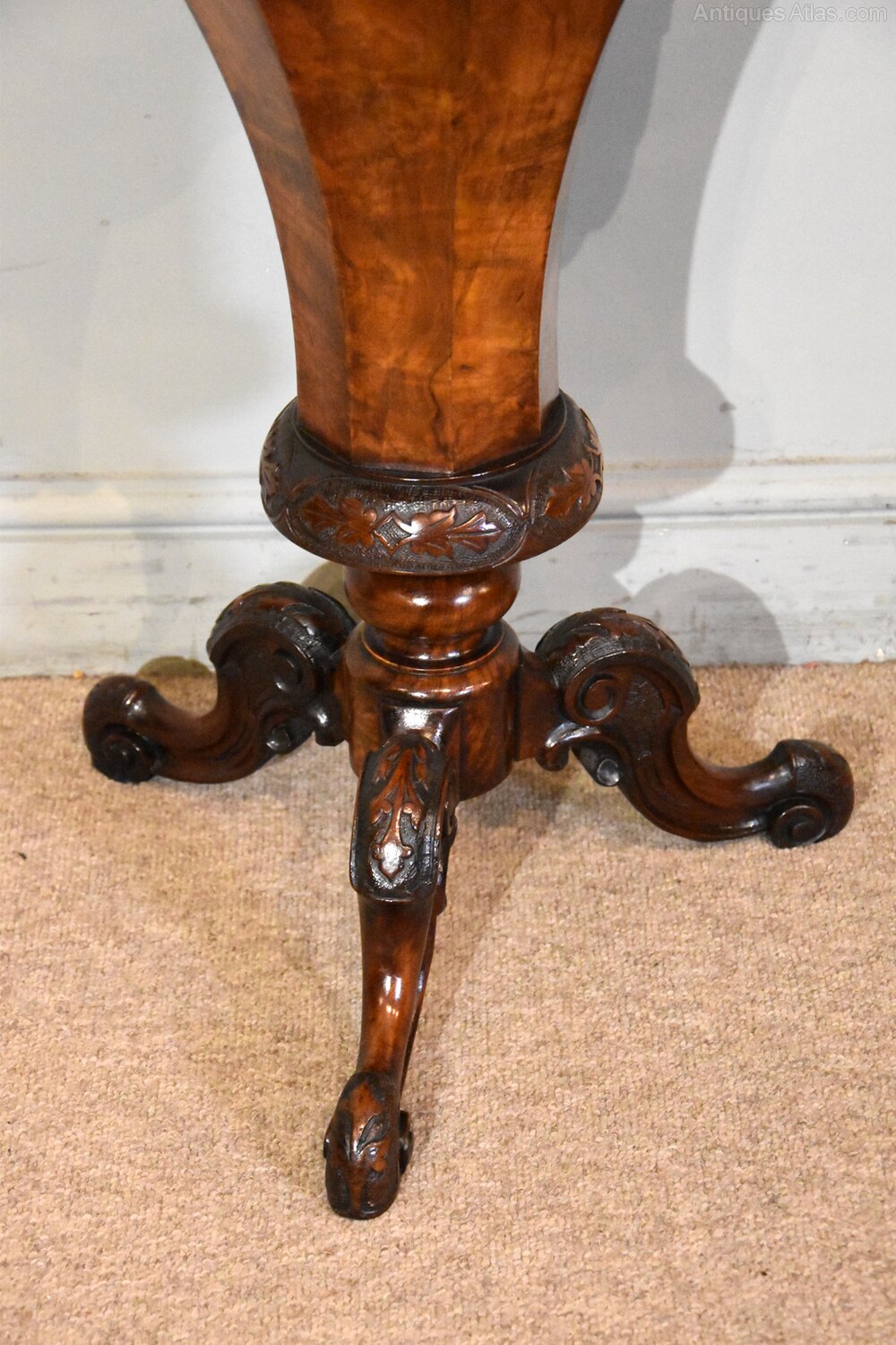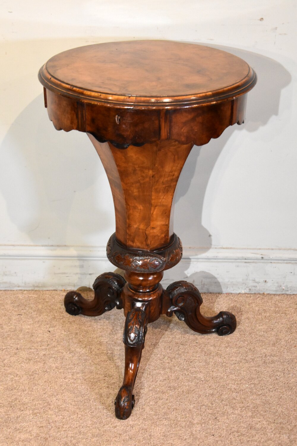 Mid 19th century walnut Trumpet shaped work table with fine interior
