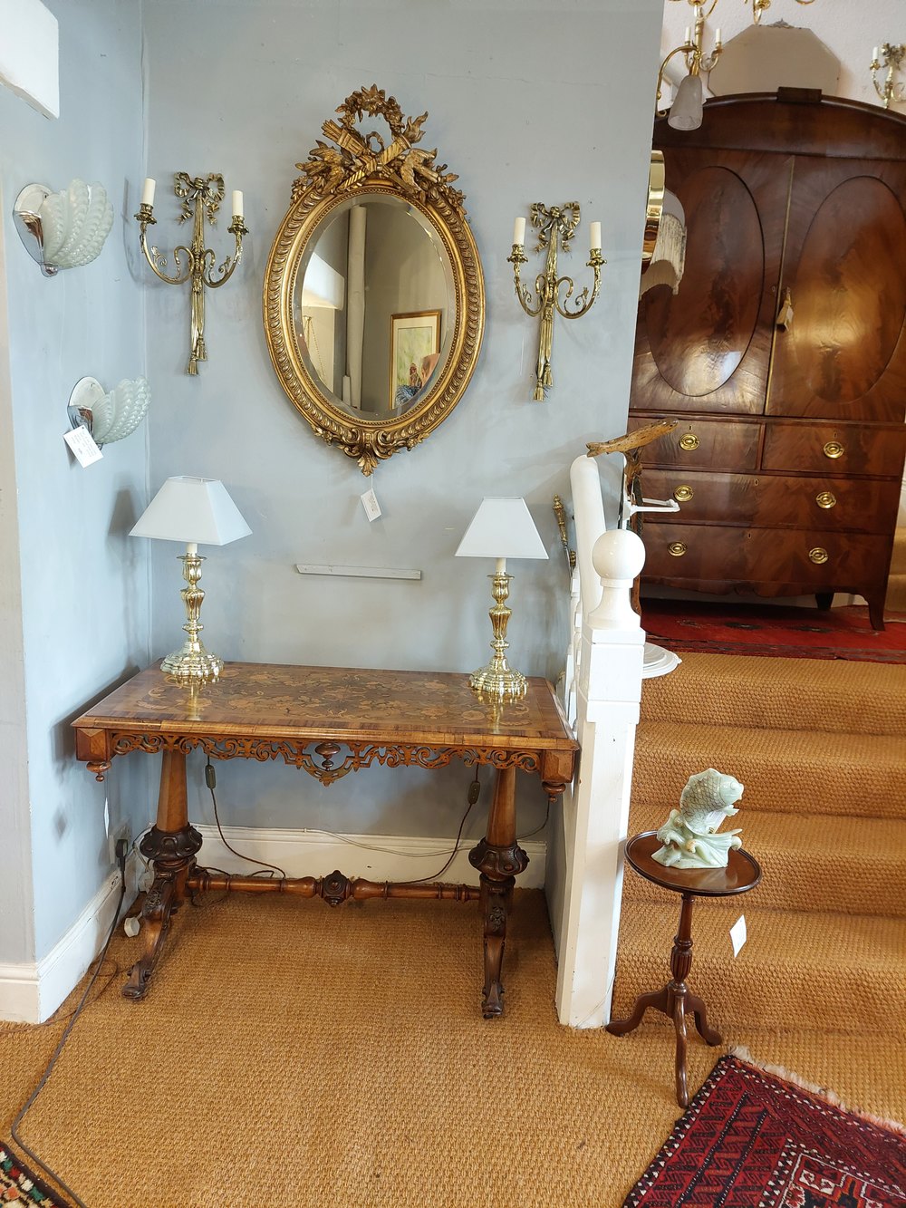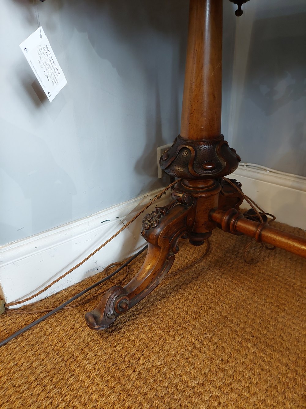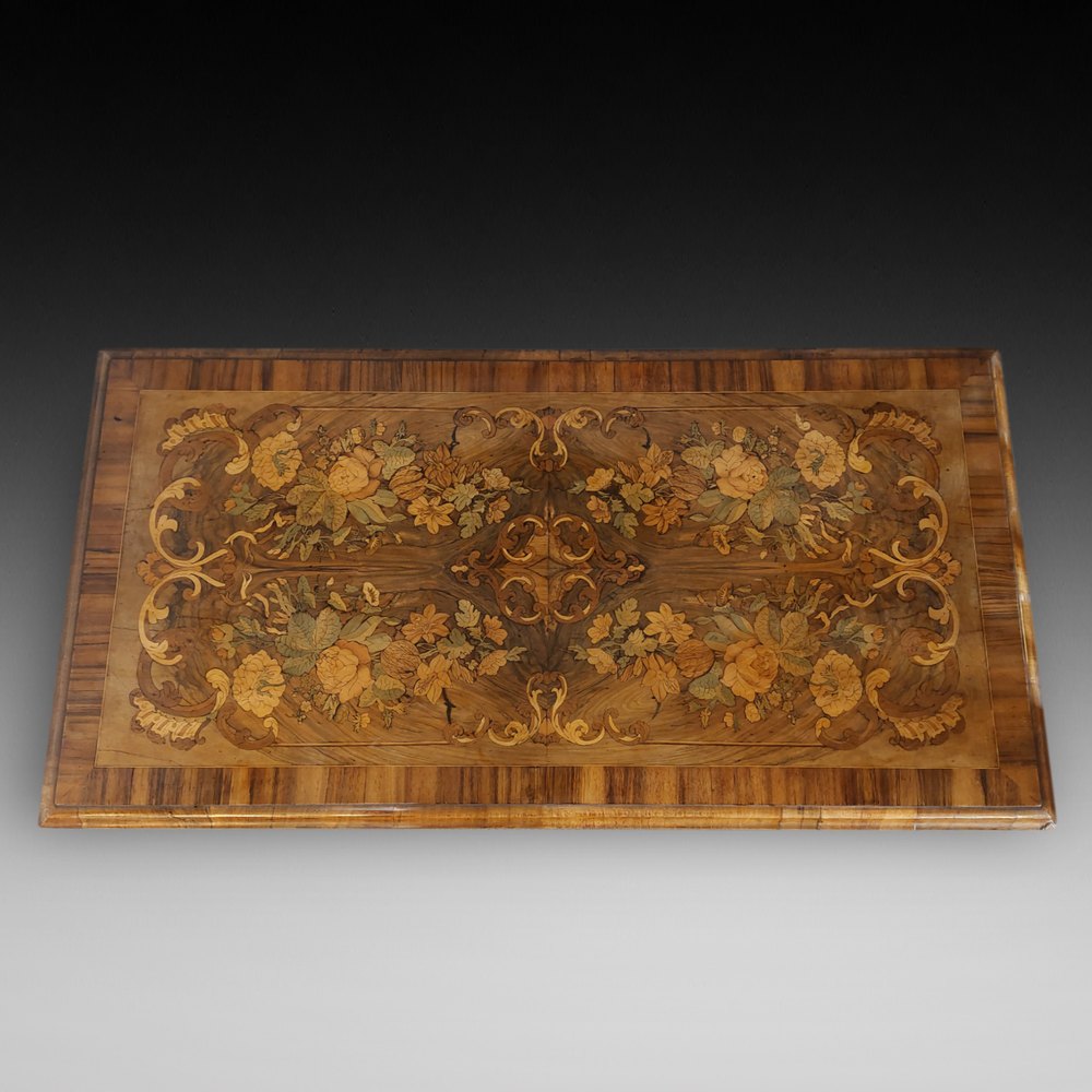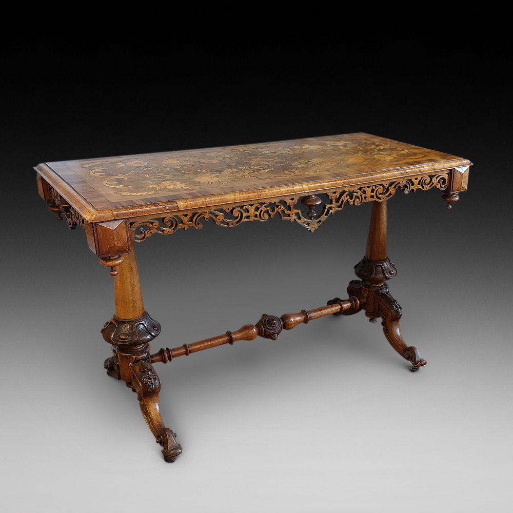 Mid Victorian Walnut Marquetry Centre Table the Top with Profuse Dyed Sycamore Marquetry and Carved Frieze on Turned Turned End Supports and Cabriole Legs 48"w x 24"d x 29"h