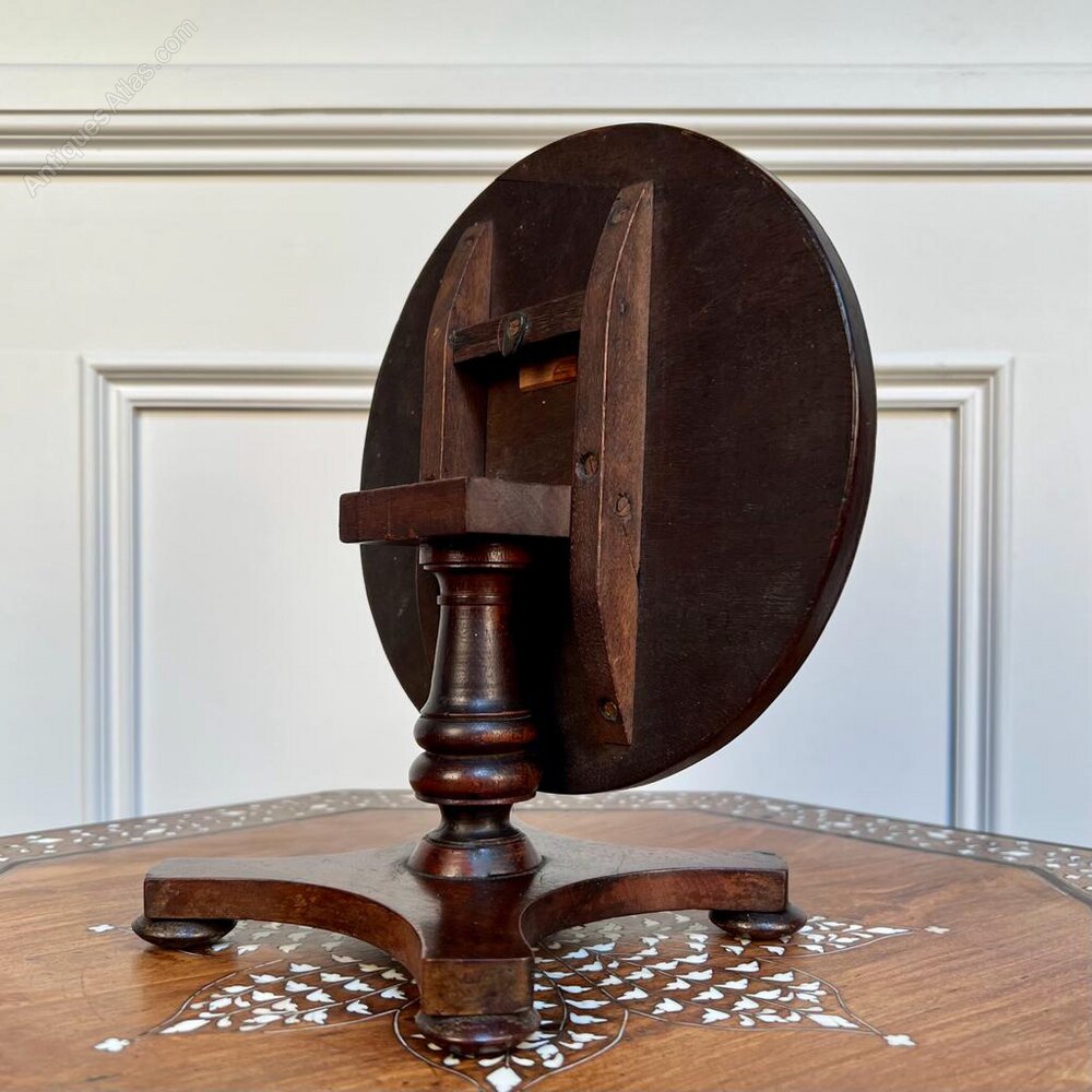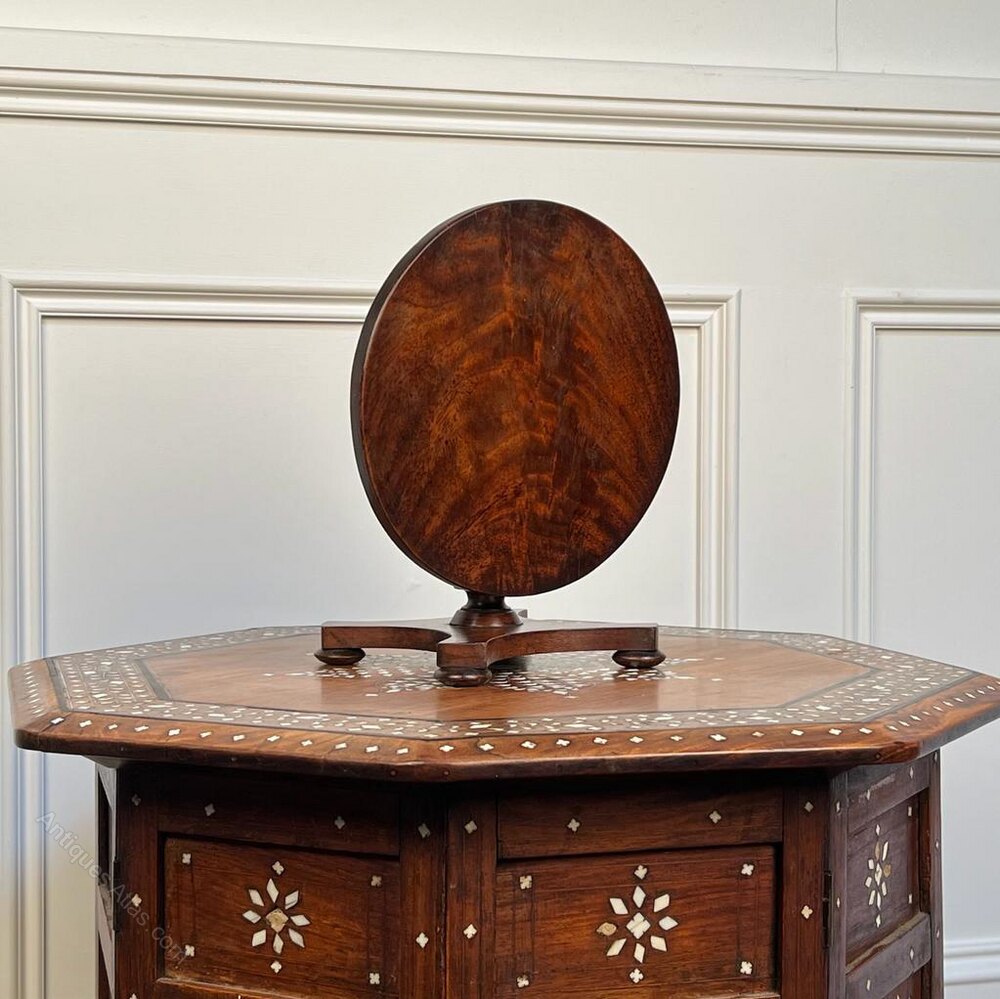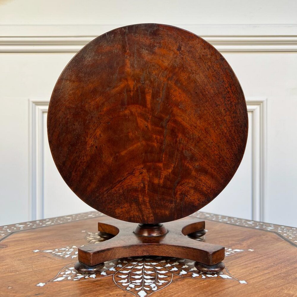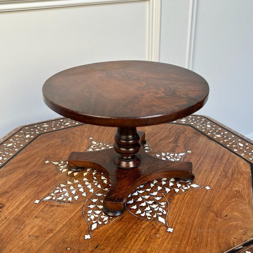 19th century mahogany miniature tilt top table. Having a circular tilting top with flamed mahogany and raised on a tuned column with tri-form base and terminating squat bun feet. Original finish throughout with rich colour and patina. English, Circa 1830.