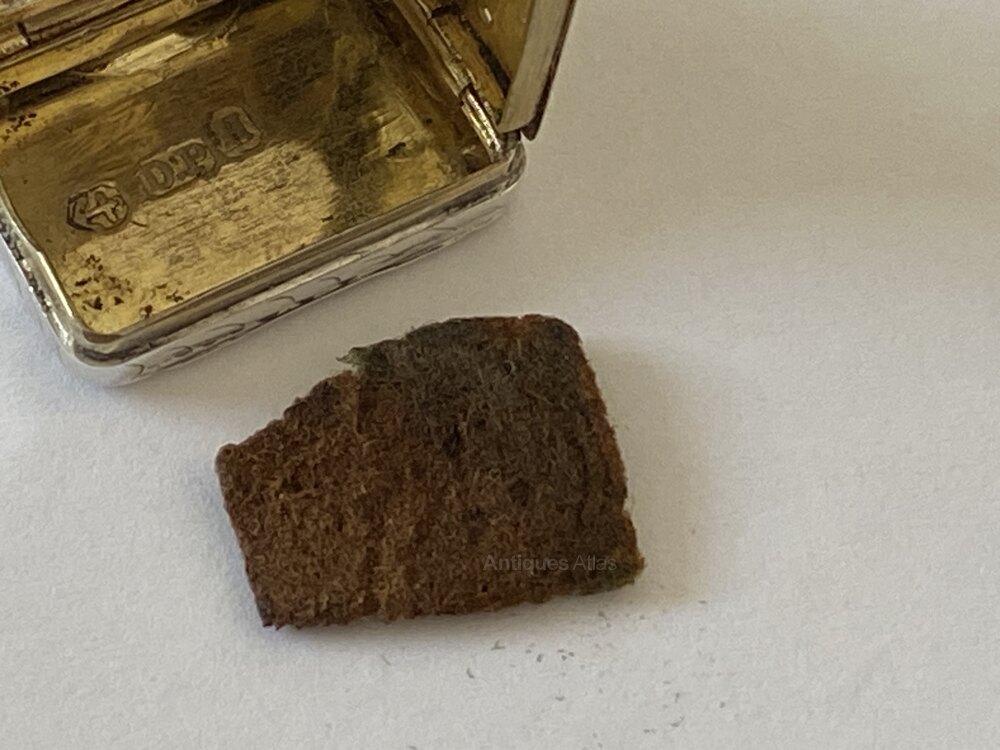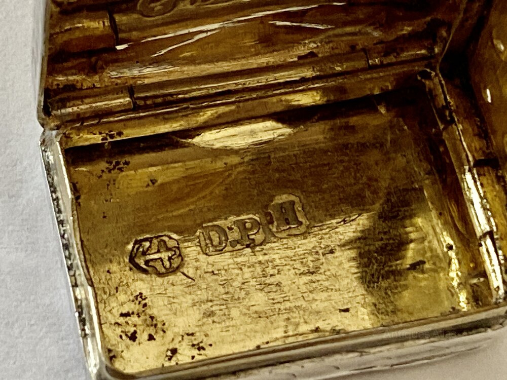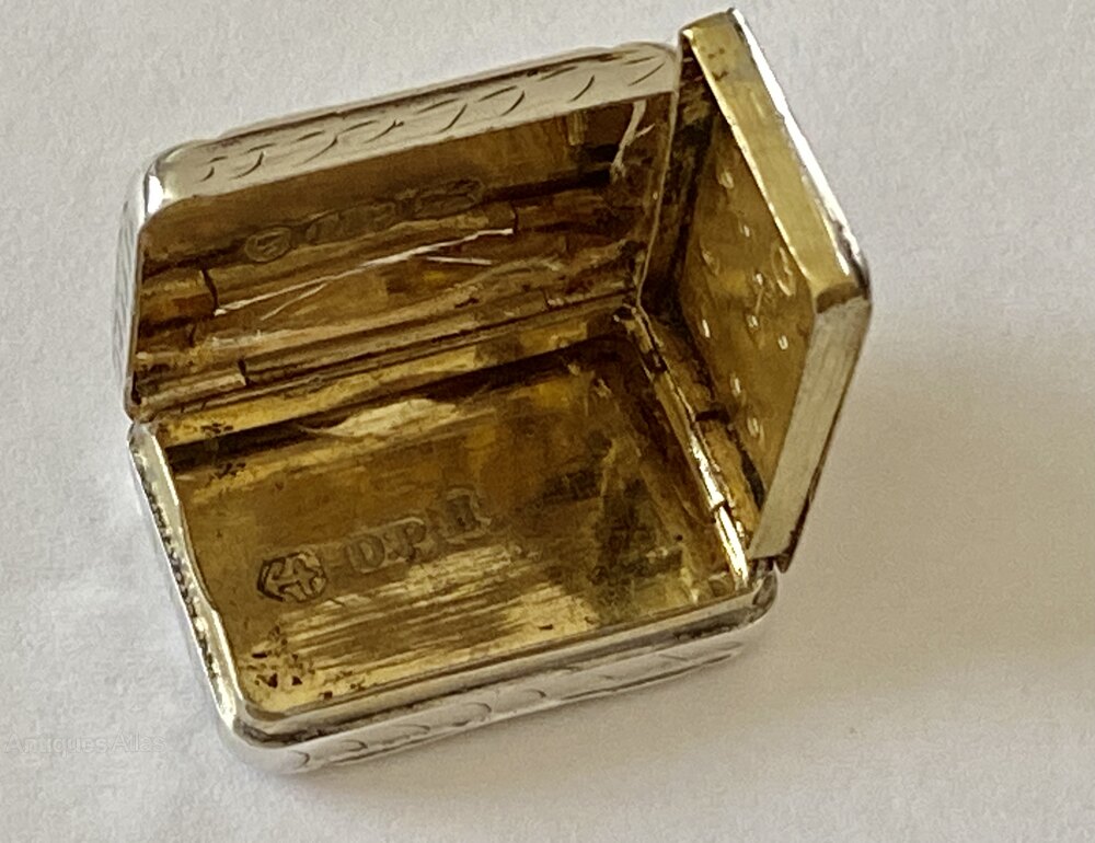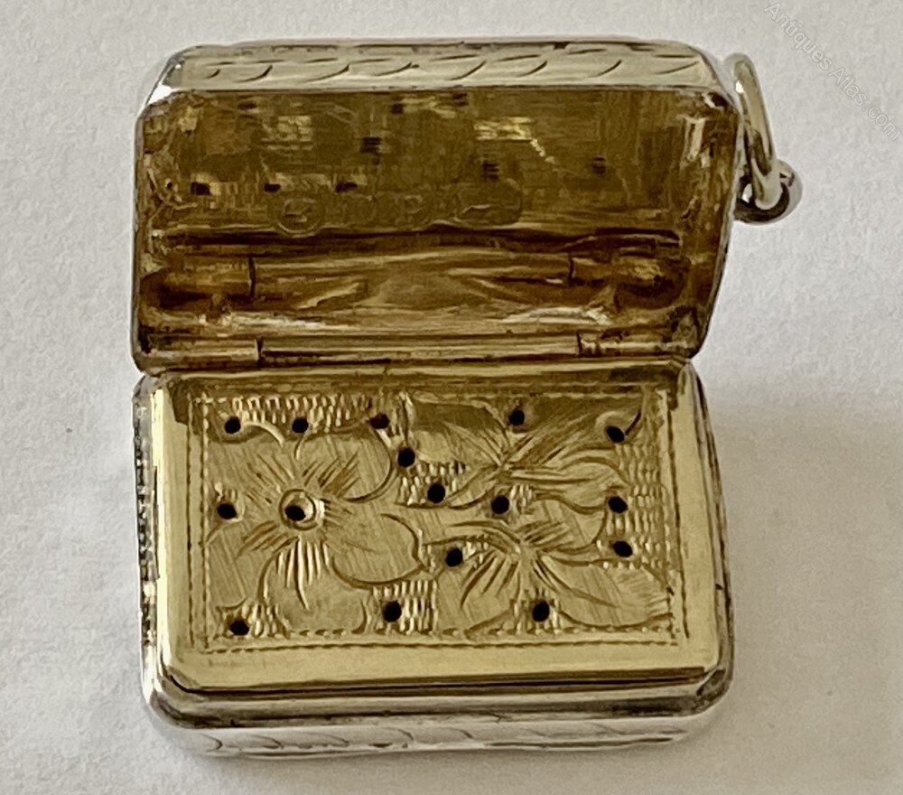 with blank 'Scroll' Cartouche.Jump ring for Chatelaine.Opens to reveal beautiful Gilt Pierced Grille.Interior Gilt throughout. Gilding still very bright.Original Sponge (Wrapped in cling Film to protect.)B'Hm 1856 for David Pettifer.Dimensions:-2,3 x 1.5cms. I am listed as a Private Dealer but some of my Stock can be viewed at The Antique Shop, 53, High Street Heathfield E.Sussex.If you wish, I am am able meet you there to discuss any items and also bring along any items which are not on Antiques Atlas but not displayed in the Shop.