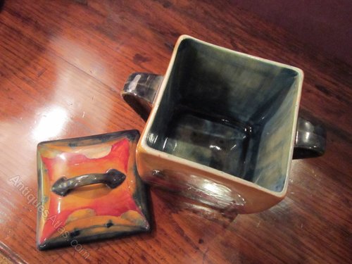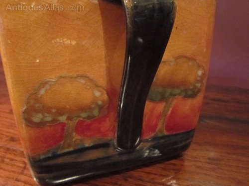 A Moorcroft Eventide pattern twin handled lidded box.c.1920. Ten trees in evening landscape to the surround. Signed William Moorcroft to the base. Measures 5"square x 6.5"high, 7"wide overall.