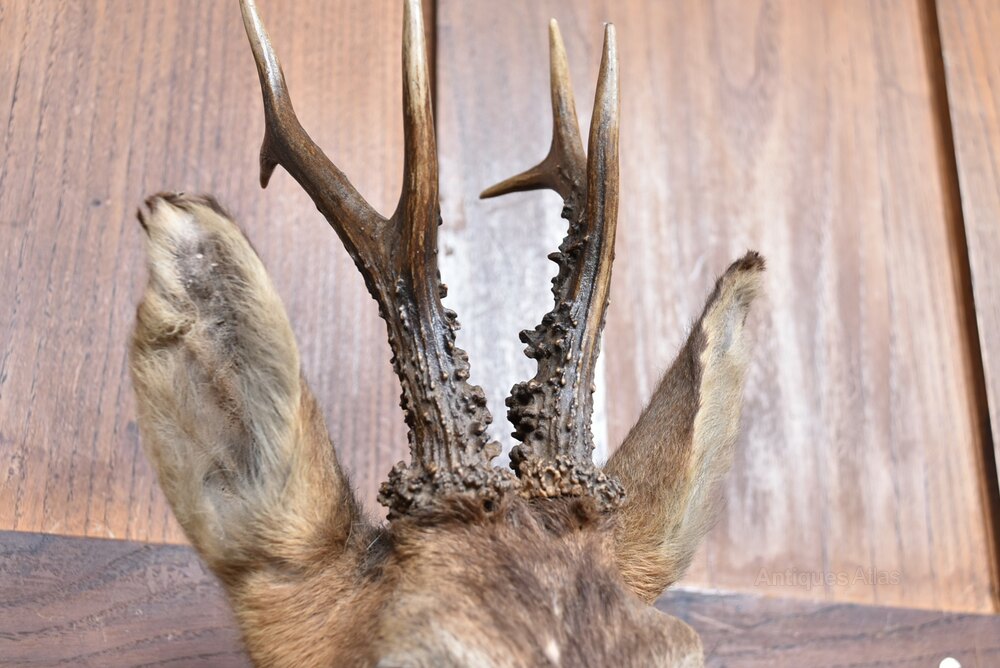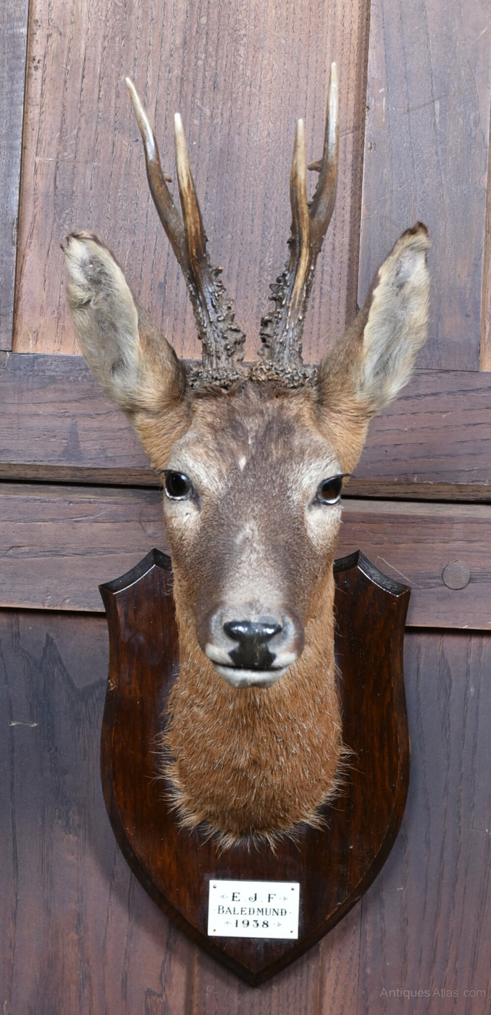 A classic example of traditional European taxidermy, this mounted roe deer head is presented on a shield-shaped wooden plaque, its antlers elegantly branching in a symmetrical six-point formation. The naturalistic pose and lifelike detailing evoke the quiet dignity of the roe buck, while the rich patina of the wood complements the warm tones of the preserved hide. Beneath the mount, a small engraved plate reads E. J. F. – Baledmund – 1938, offering a glimpse into its provenance, perhaps a commemorative piece from a notable hunt or a personal memento of place and time. Ideal for a country house interior, lodge, or collector’s wall, it carries both rustic charm and historical resonance.