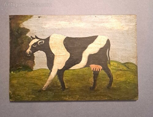 A charming example of early folk art, depicting a black and white cow standing on grassy hills beneath a pale sky. The artist’s simplified, almost silhouette-like treatment of the animal and the flat perspective lend the work a delightful primitive character typical of American rural painting of the period. Subtle craquelure and aged tones enhance its authentic patina.