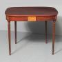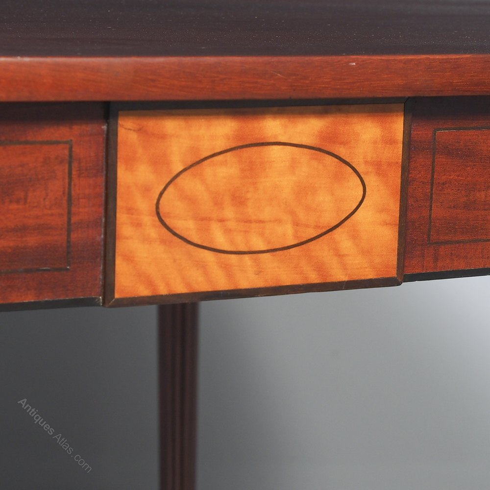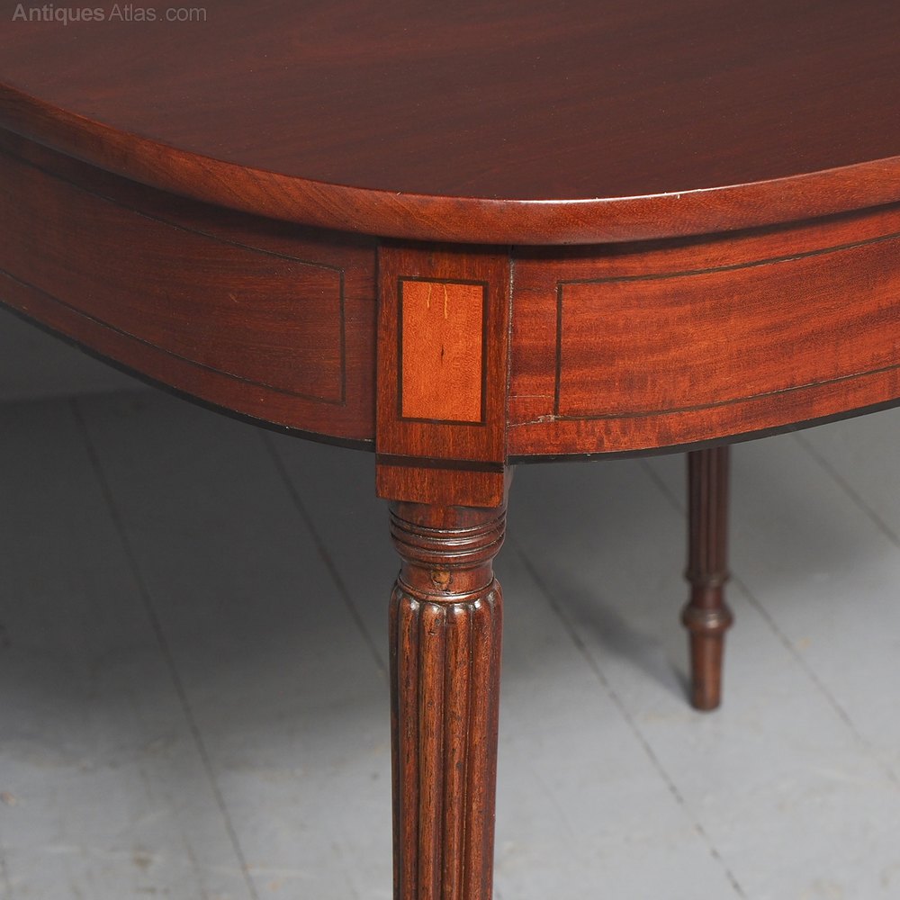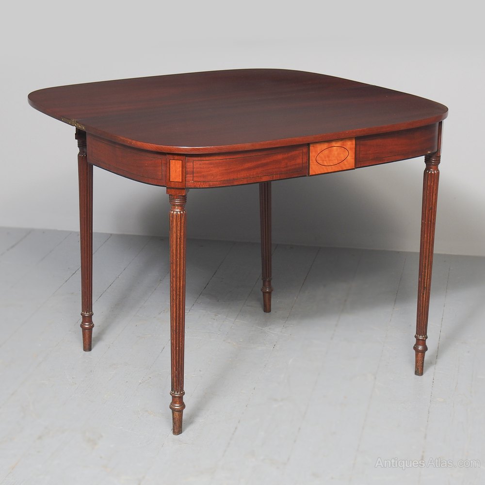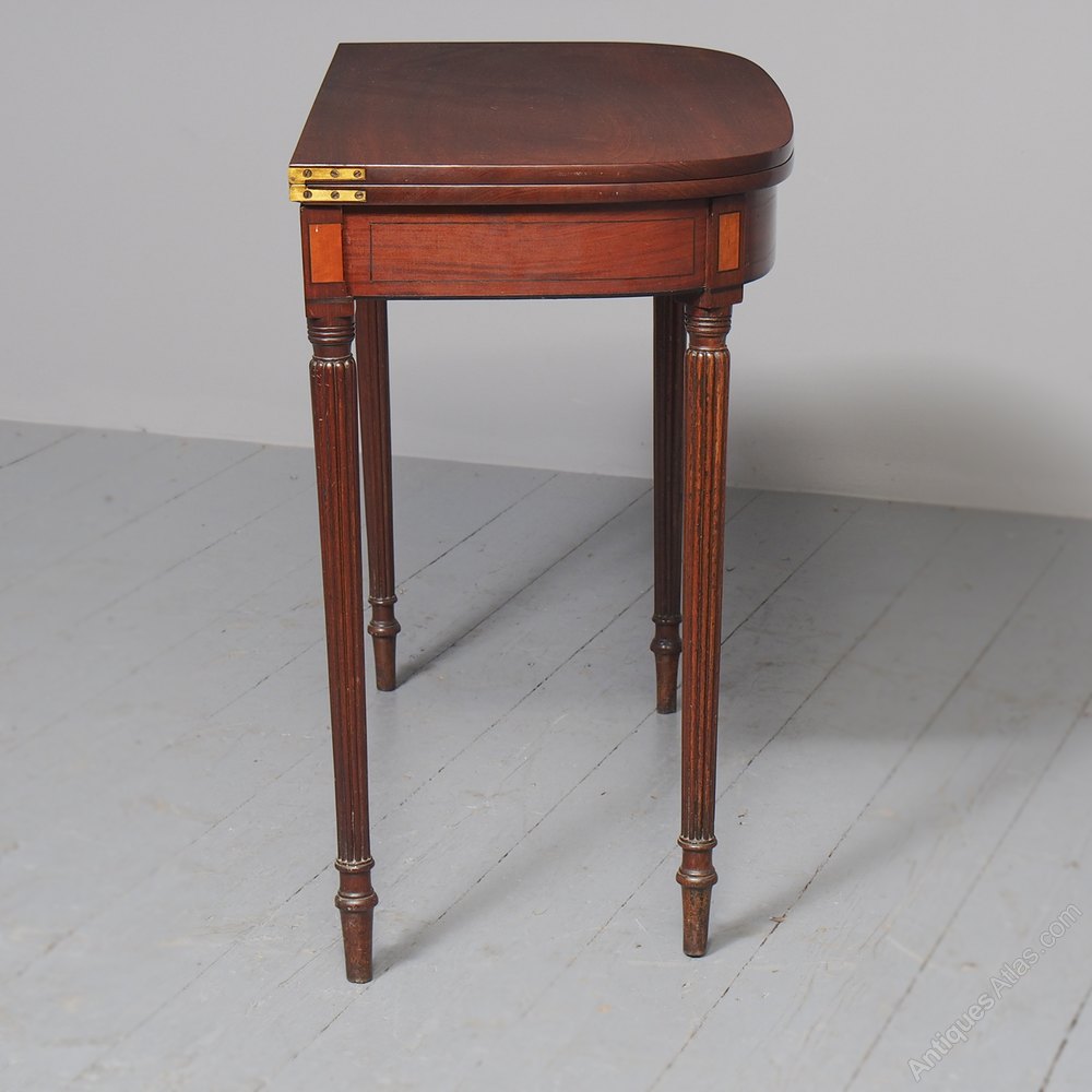 Circa 1800. A neat size late George III mahogany and inlaid fold over tea table. The D shaped top, which opens to a mirror matched interior, has a deep shaped apron with a satinwood plaque in the centre, ebony string inlay, and further inlay on the side panels. The back legs are hinged and swing out to support the table when it's open. There's a small inlaid panel on the top of each of the legs, the whole piece stands on 4 elegant Gillows style, turned, fluted and tapering legs which finish on an elegant toe.