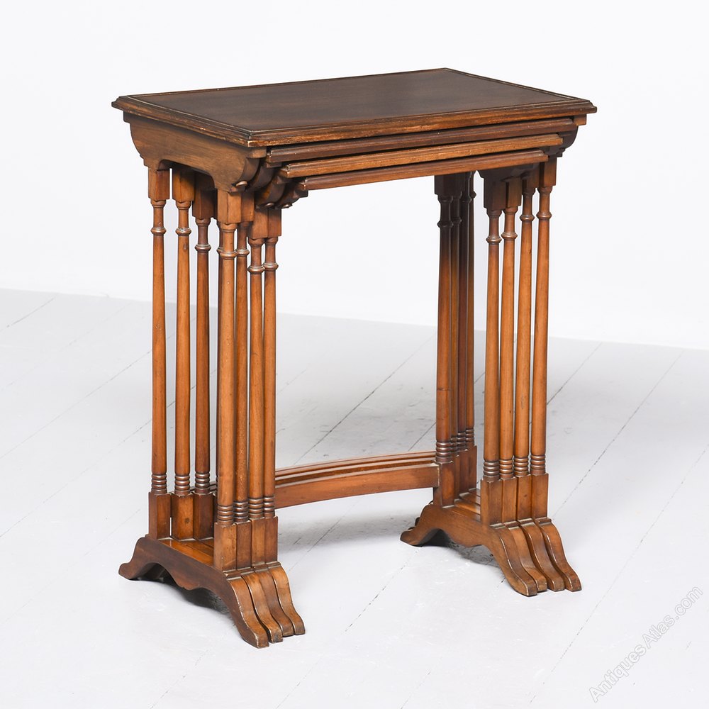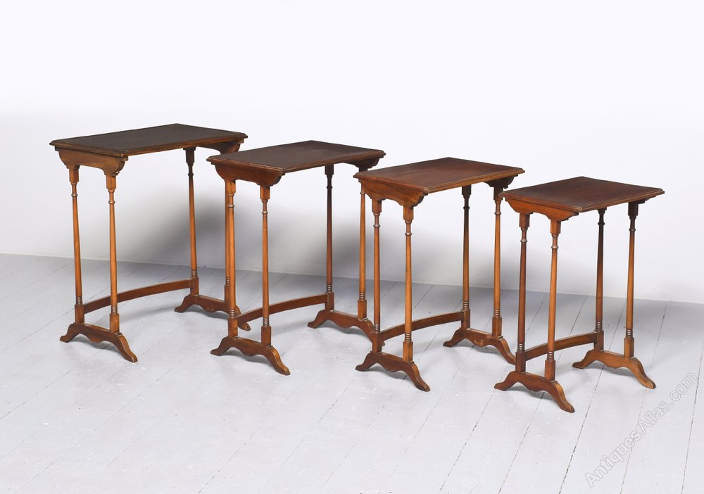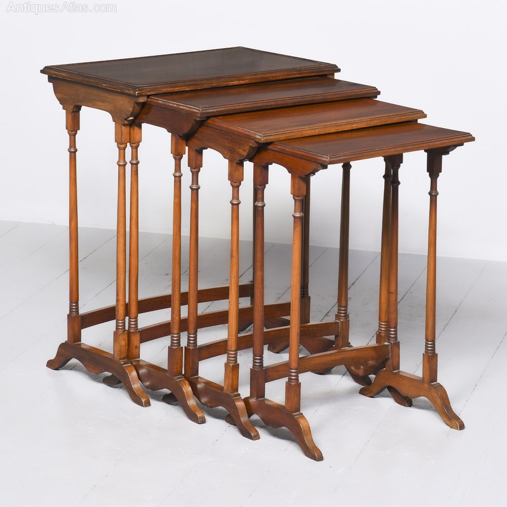 Circa 1910, a nest of 4 Georgian style Mahogany antique tables. The largest table has a rectangular top with beading on the flat surface and a moulded edge, and below are 3 further antique tables of smaller size. All the tables are standing on turned elegant legs, united at the back with a curved stretcher and finishing on a trestle end with splayed feet to the front and back.