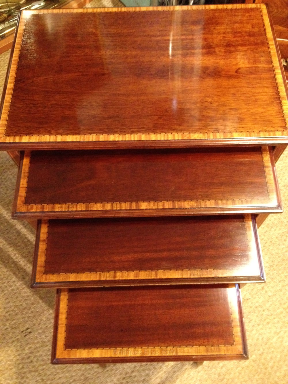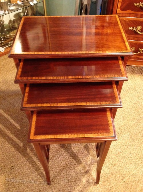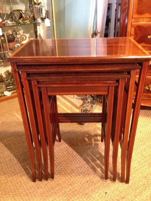 Most attractive nest of 4 Edwardian antique tables, cross-banded in satinwood. English c 1910
