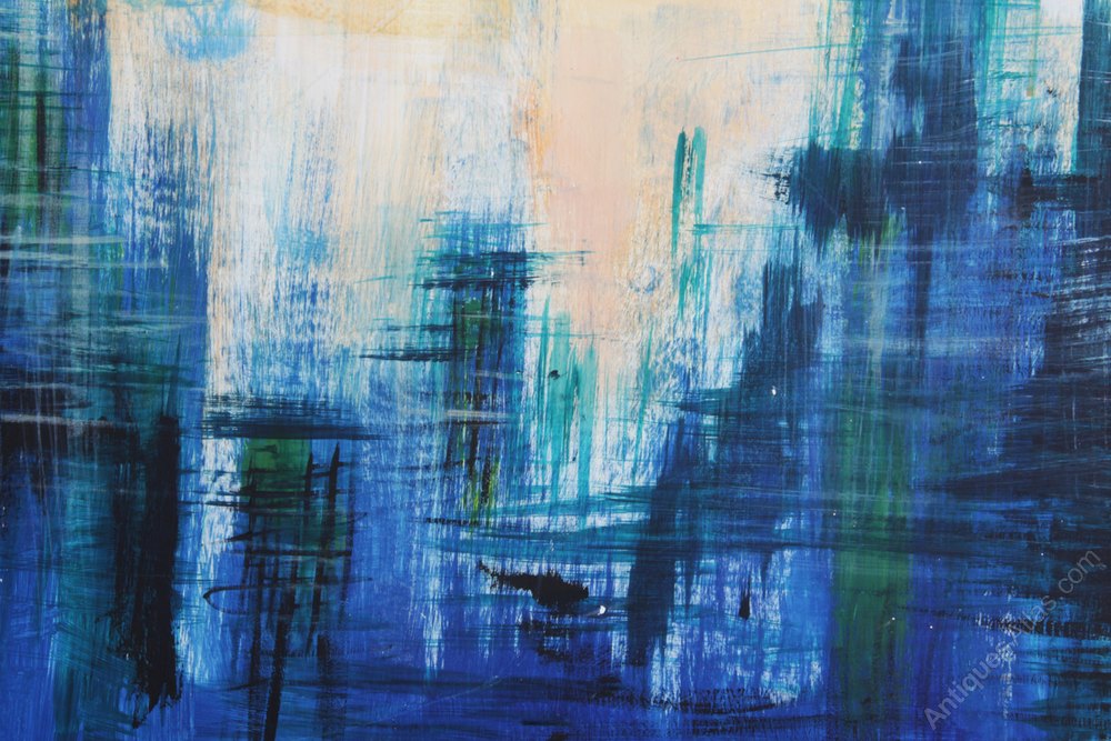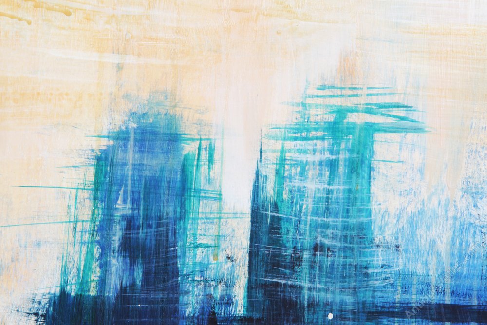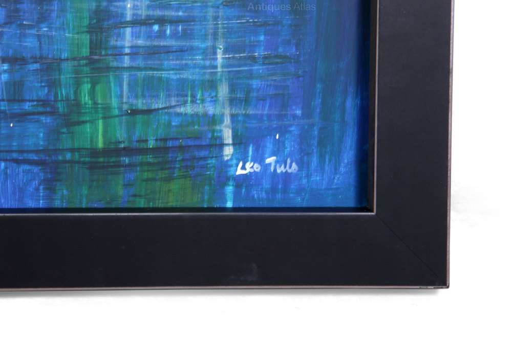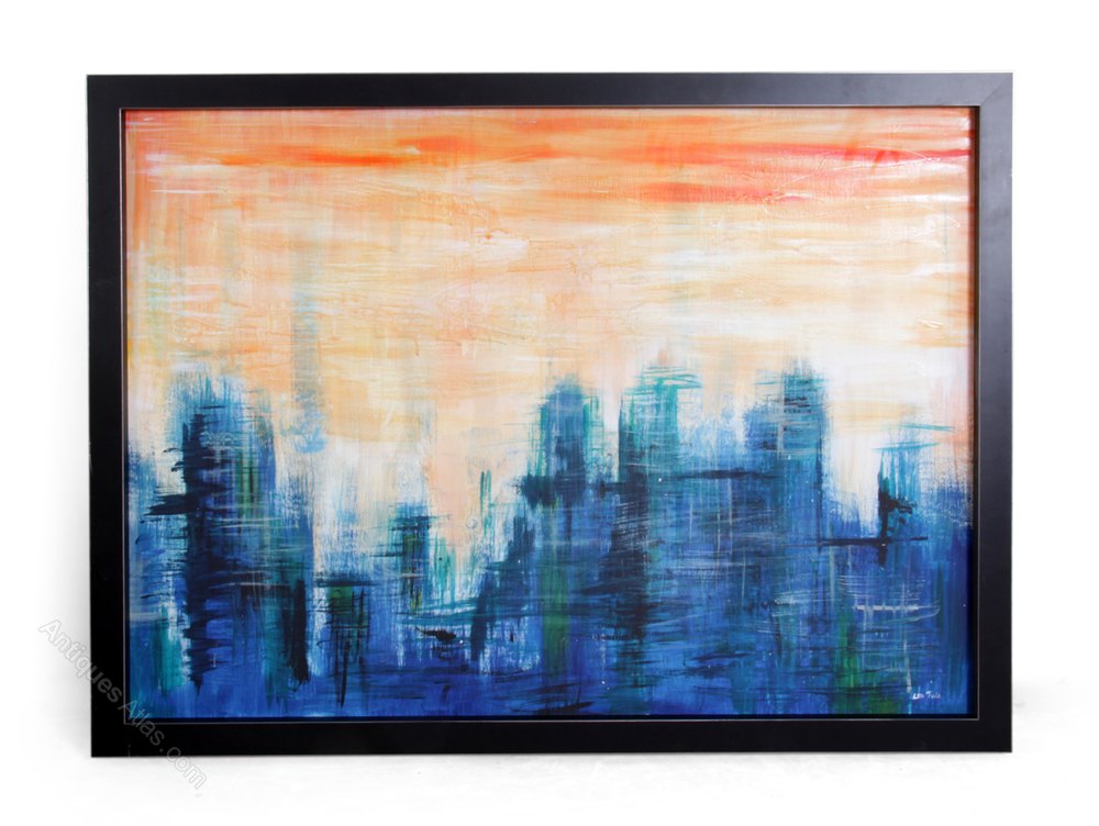 A large Contemporary New York skyline by Leo Tuls British born artist signed to lower right, this has thick textured paint on board and framed in a matt black solid wood frame with hanging wire to verso