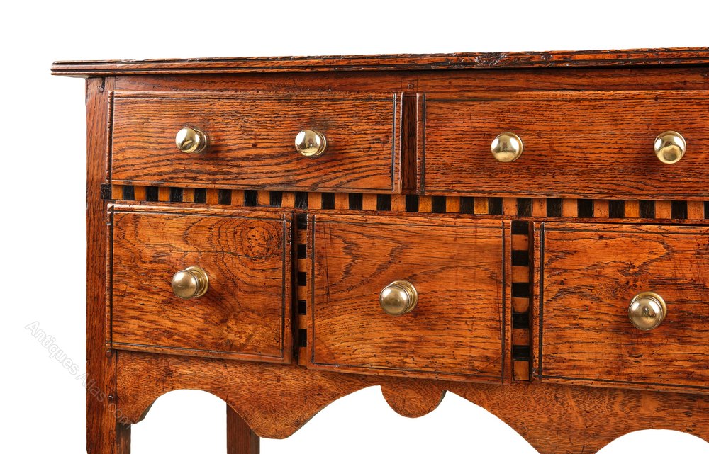A Georgian oak sidetable with unusual drawer arrangement, the twin plank top with a scratch moulded, flat edge. The drawers divided by bold, chequer inlaid stiles and rail above an undulating frieze. Perfect as a small sideboard or server. Circa 1800-20.