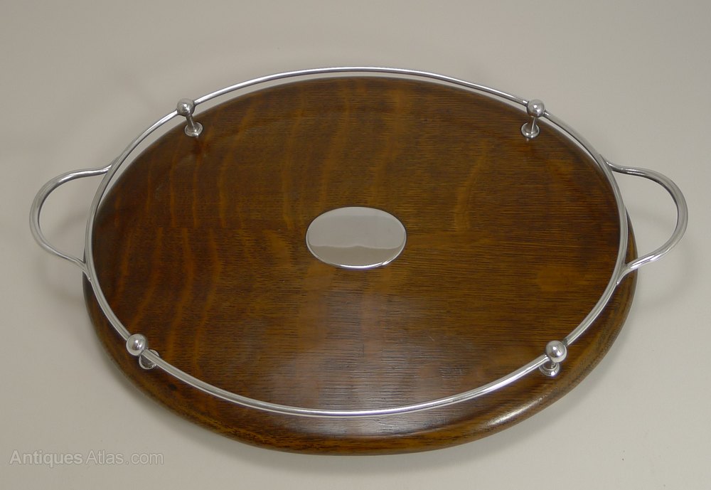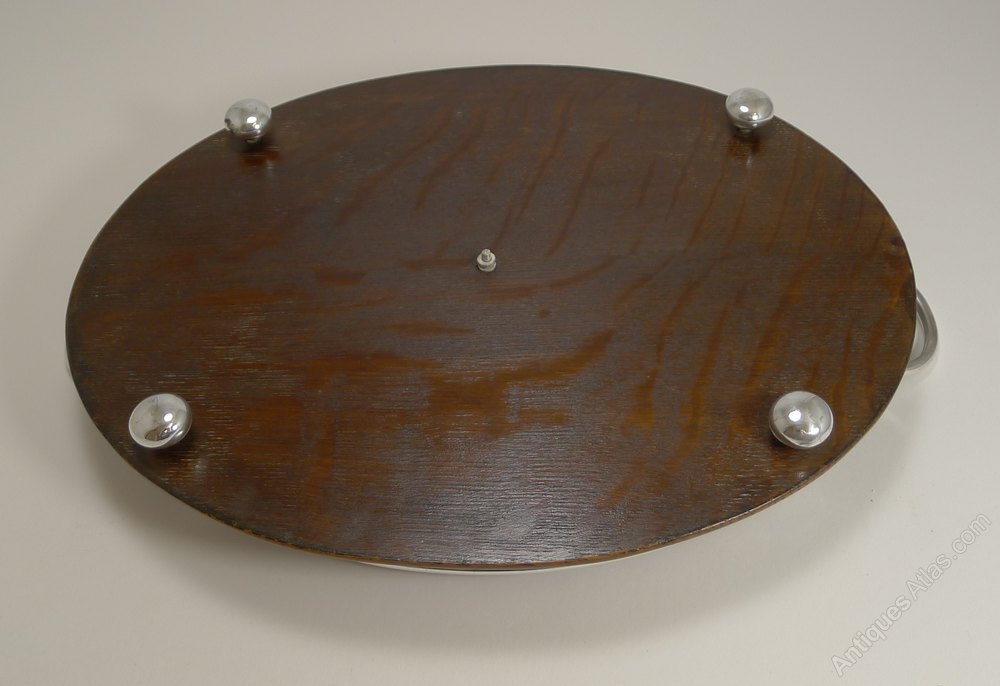 The solid Oak stands on it's four original bun feet and the gallery incorporates two carrying handles. There is a vacant oval mount to the centre of the tray.