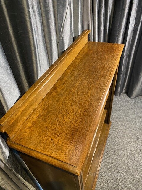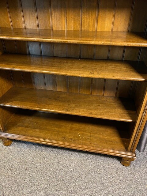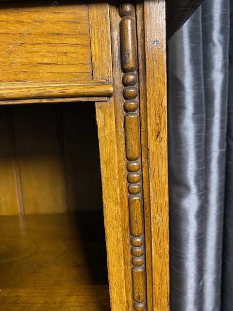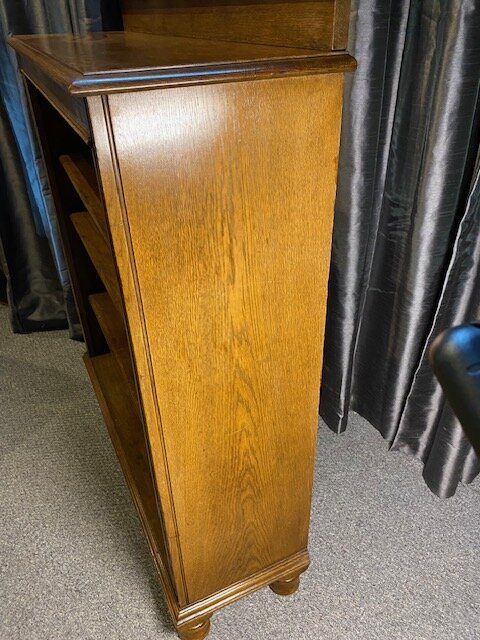 This very practical oak bookcase that has three adjustable shelves, standing on bun style feet. This bookcase is all in a wonderful colour with bead style decoration to the front edge.