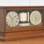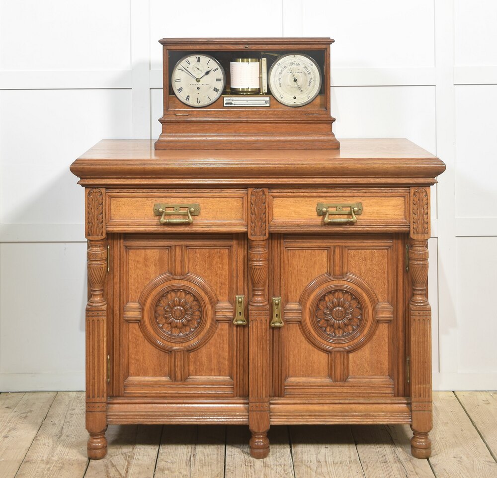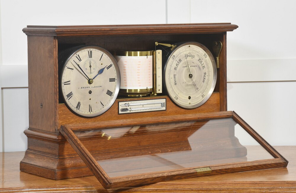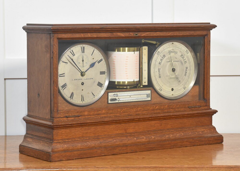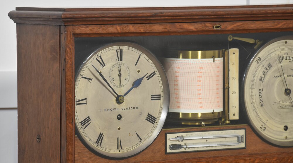 Oak-cased Weather station by James Brown Glasgow. with silvered dials comprising a clock set with Roman numerals and subsidiary seconds dial, barometer, and central barograph over thermometer, contained in a glazed oak case.