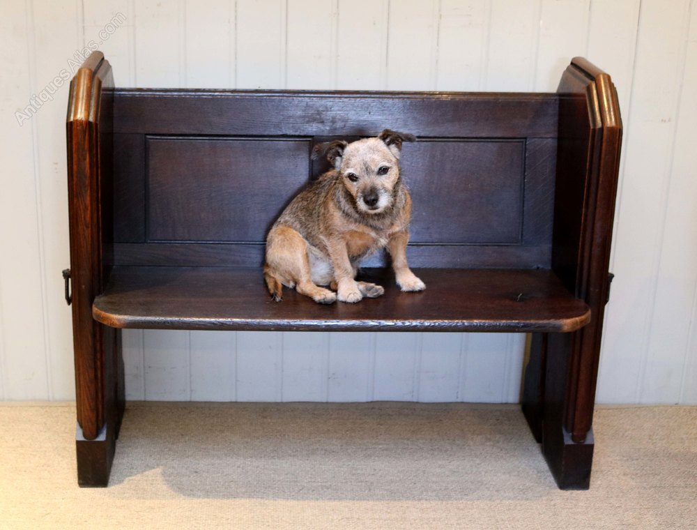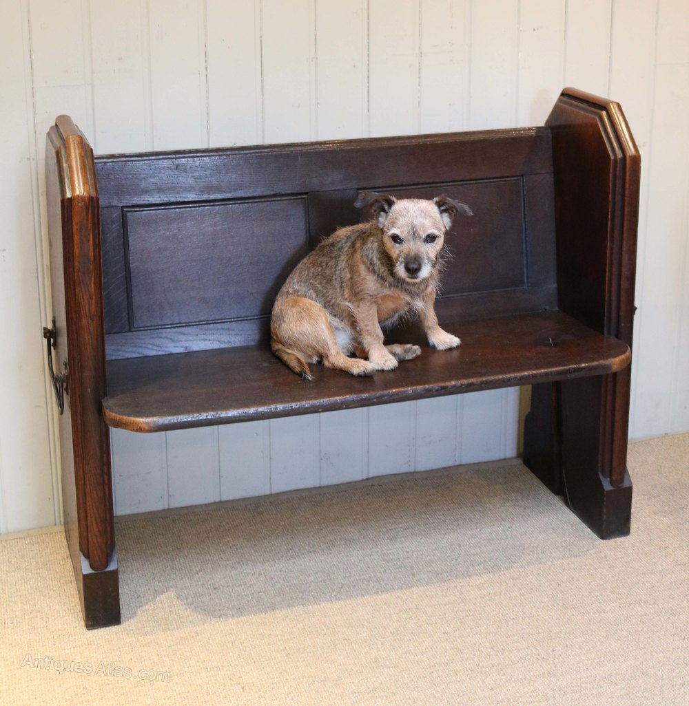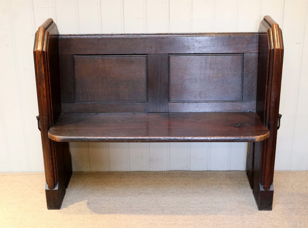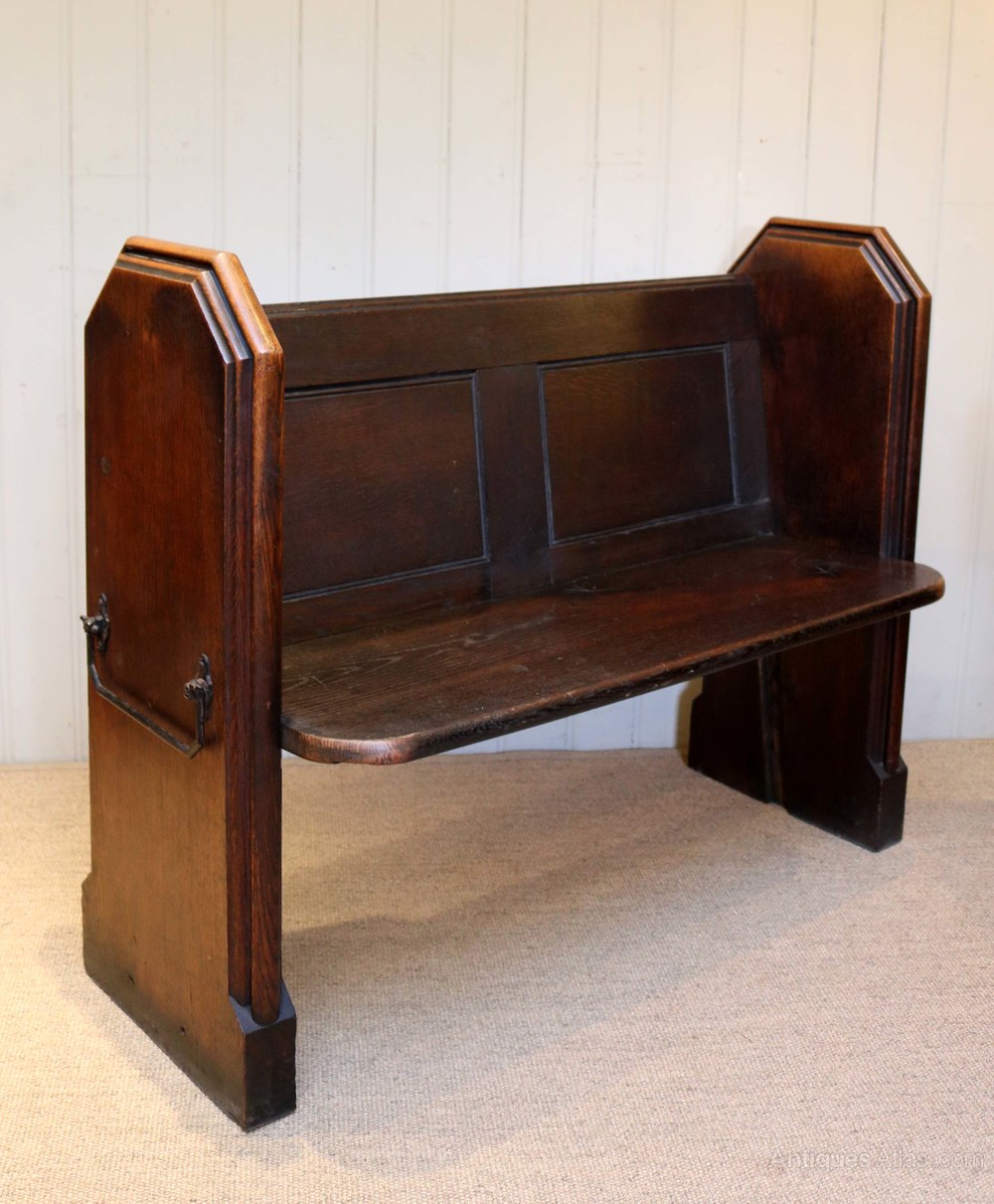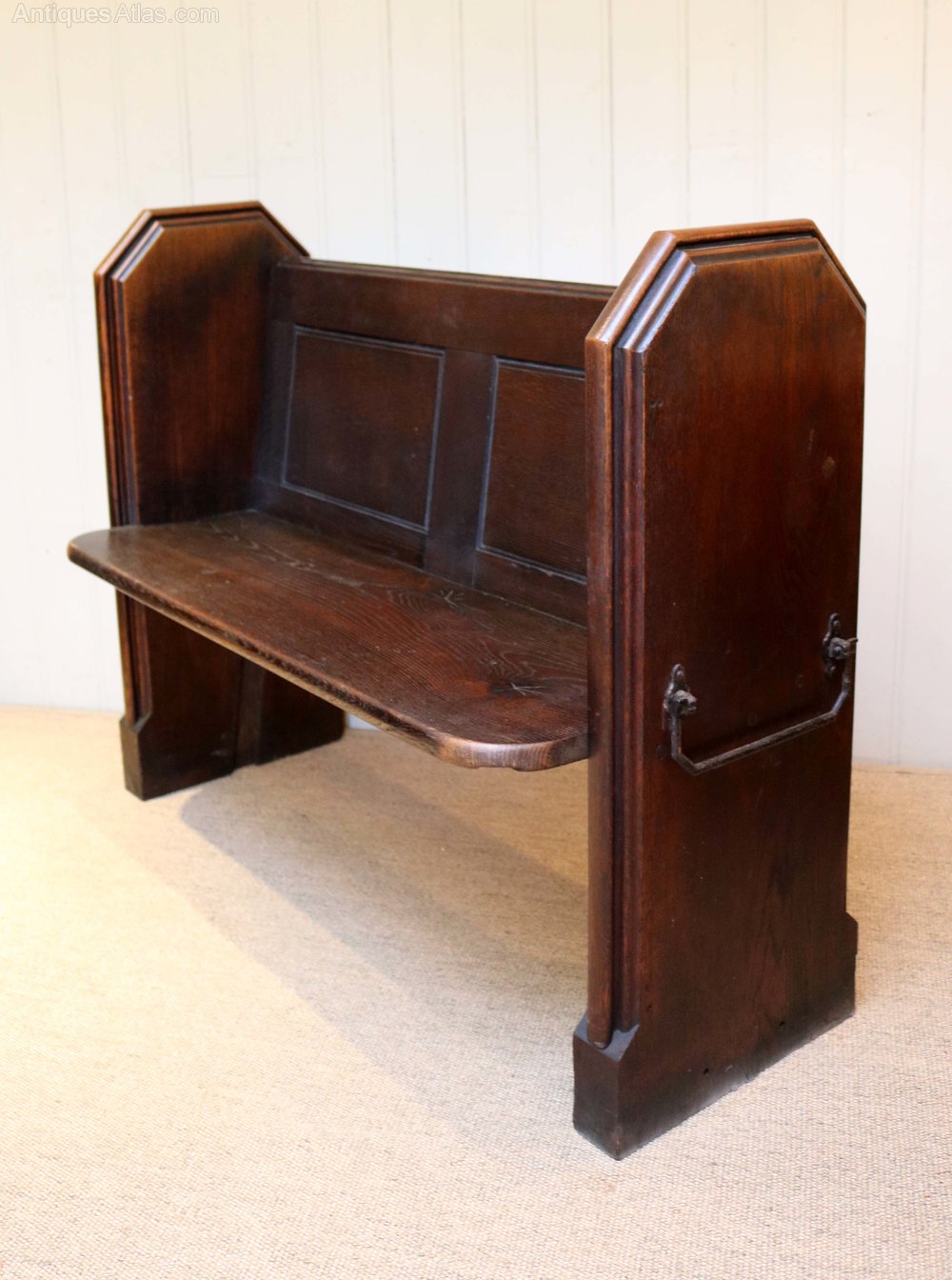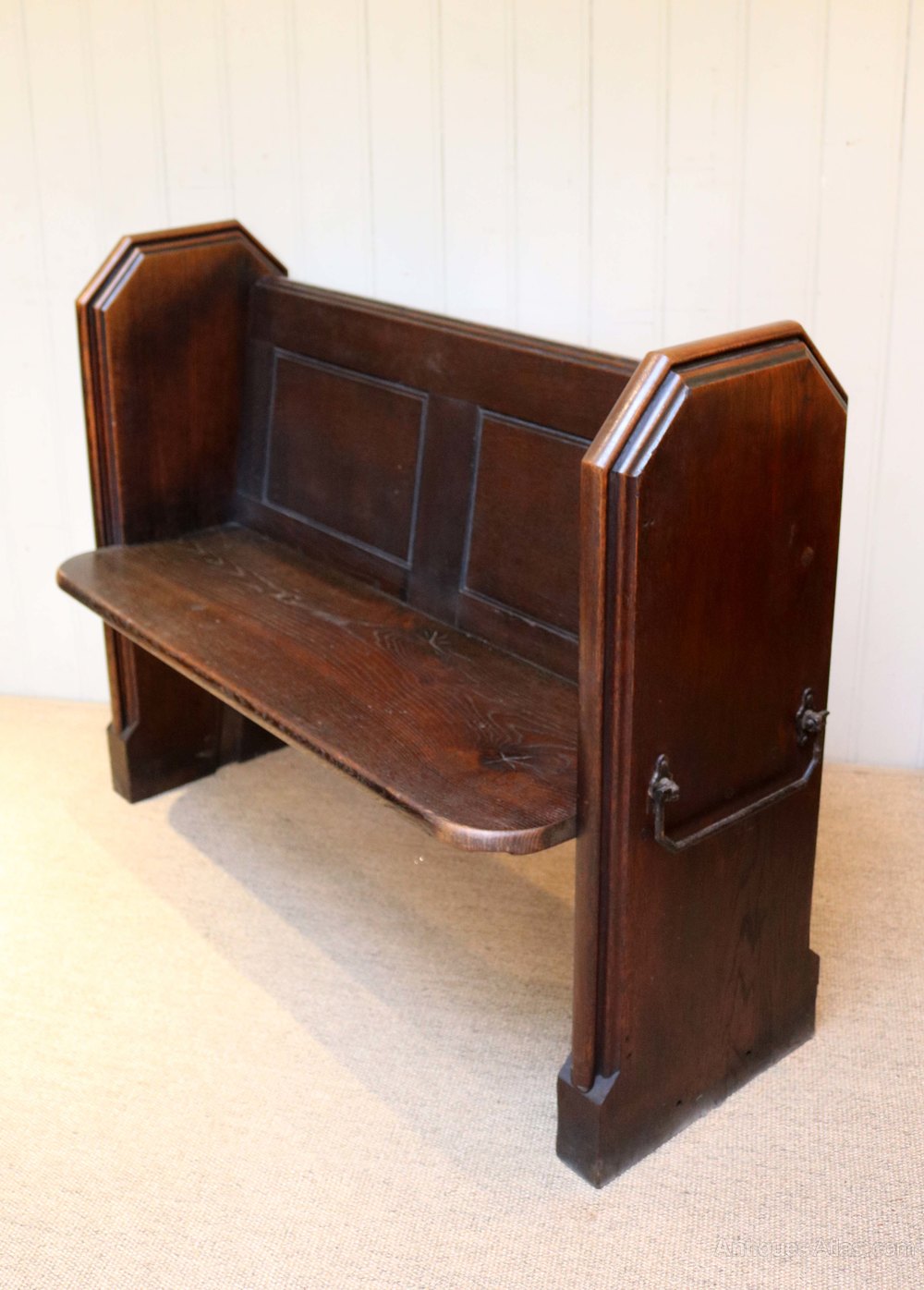 Oak church pew having a panelled back with original wrought iron handles to each side with angled ends and a curved seat, from a church in Eccles