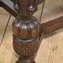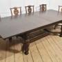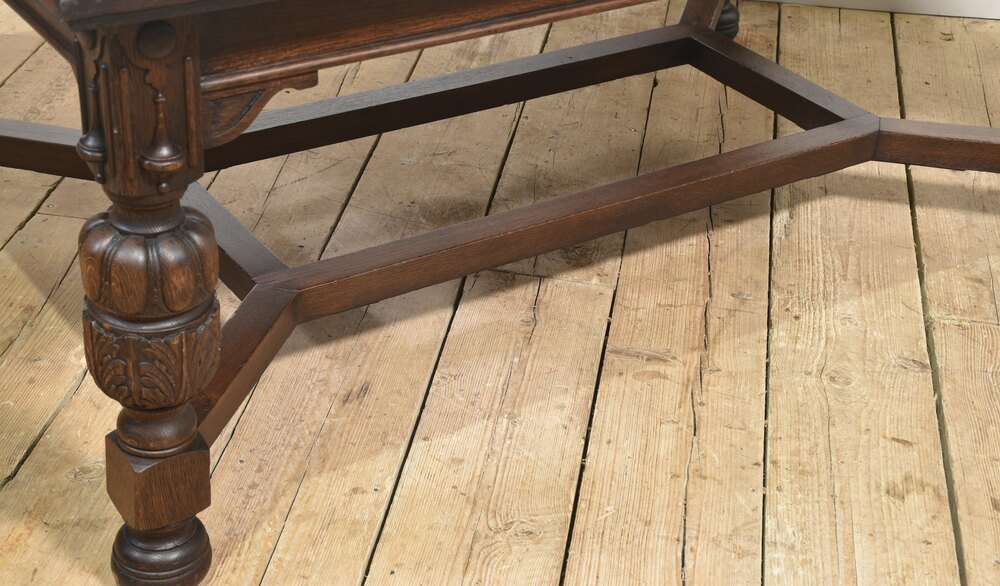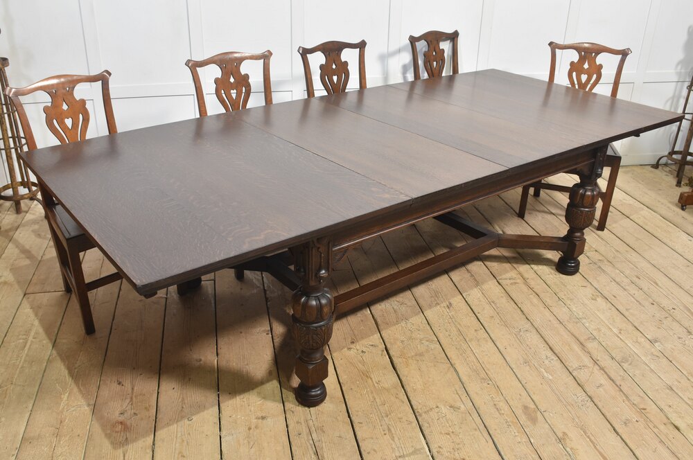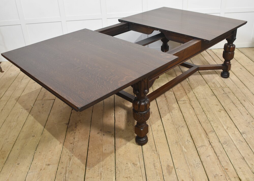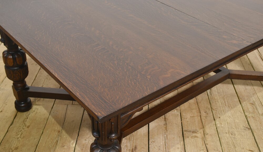 Oak Dining Table of generous proportions. The well-figured top has pull-out ends to incorporate two original oak leaves to the moulded freeze raised up on cup & cover legs leading down to bun feet united by stretchers.