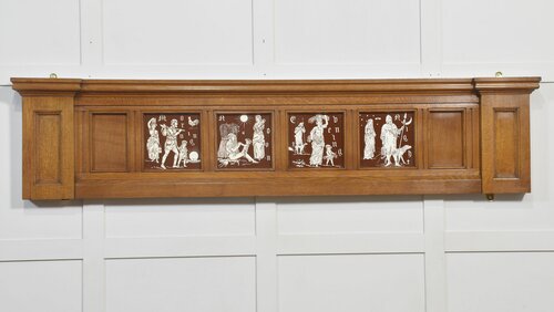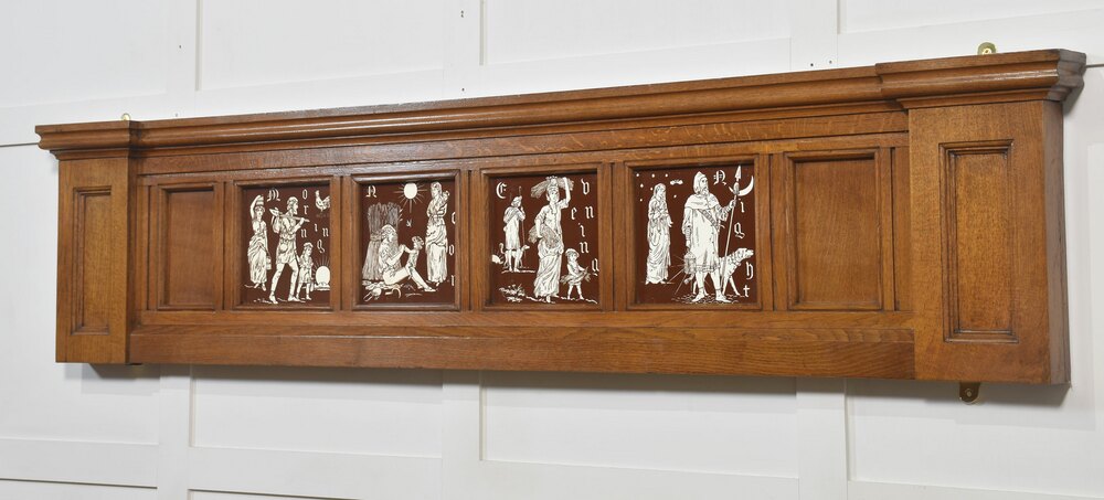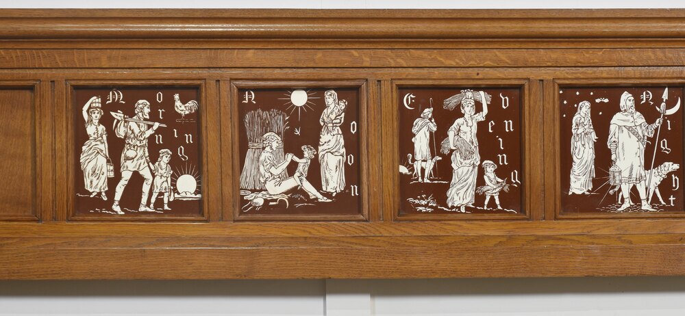 Set of four Minton holies tiles depicting Morning, Noon, Evening and night. Encased in solid oak frame.