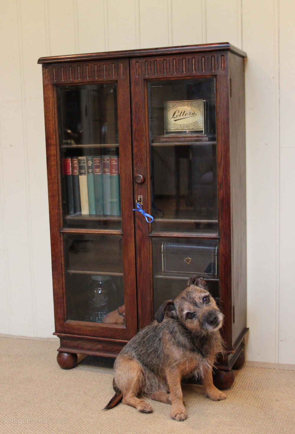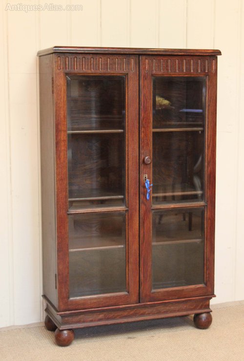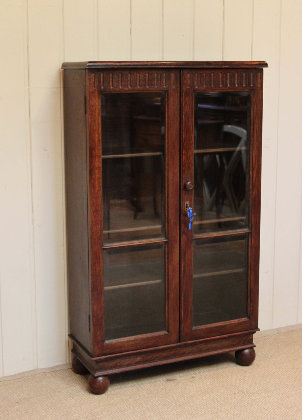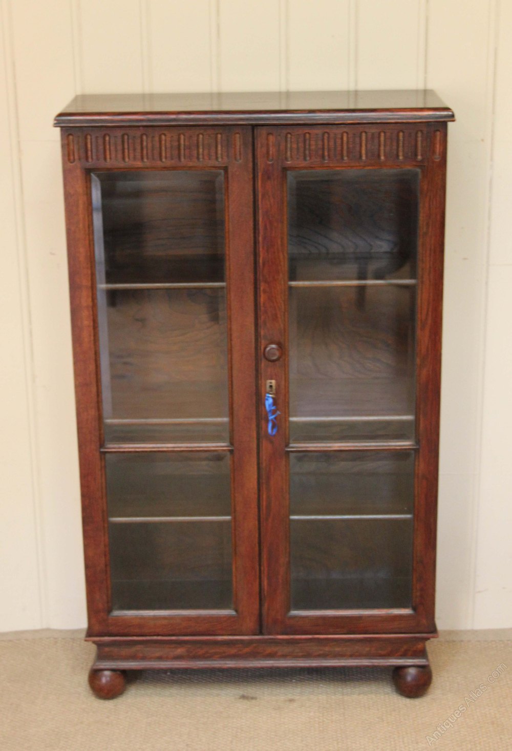 Oak two door bookcase having bevel edge glass doors with three internal adjustable shelves raised on bun feet
