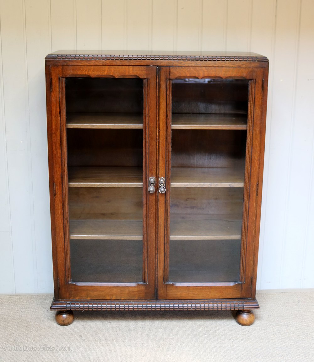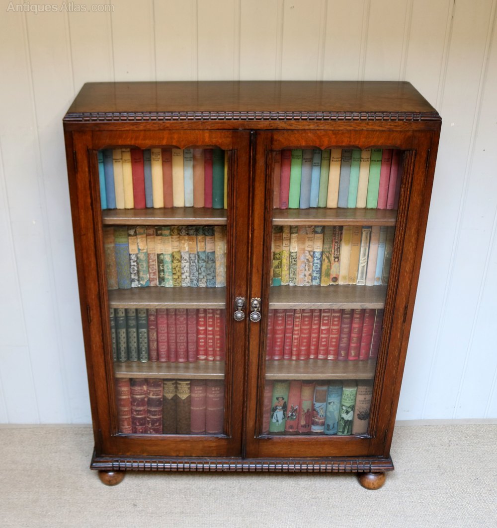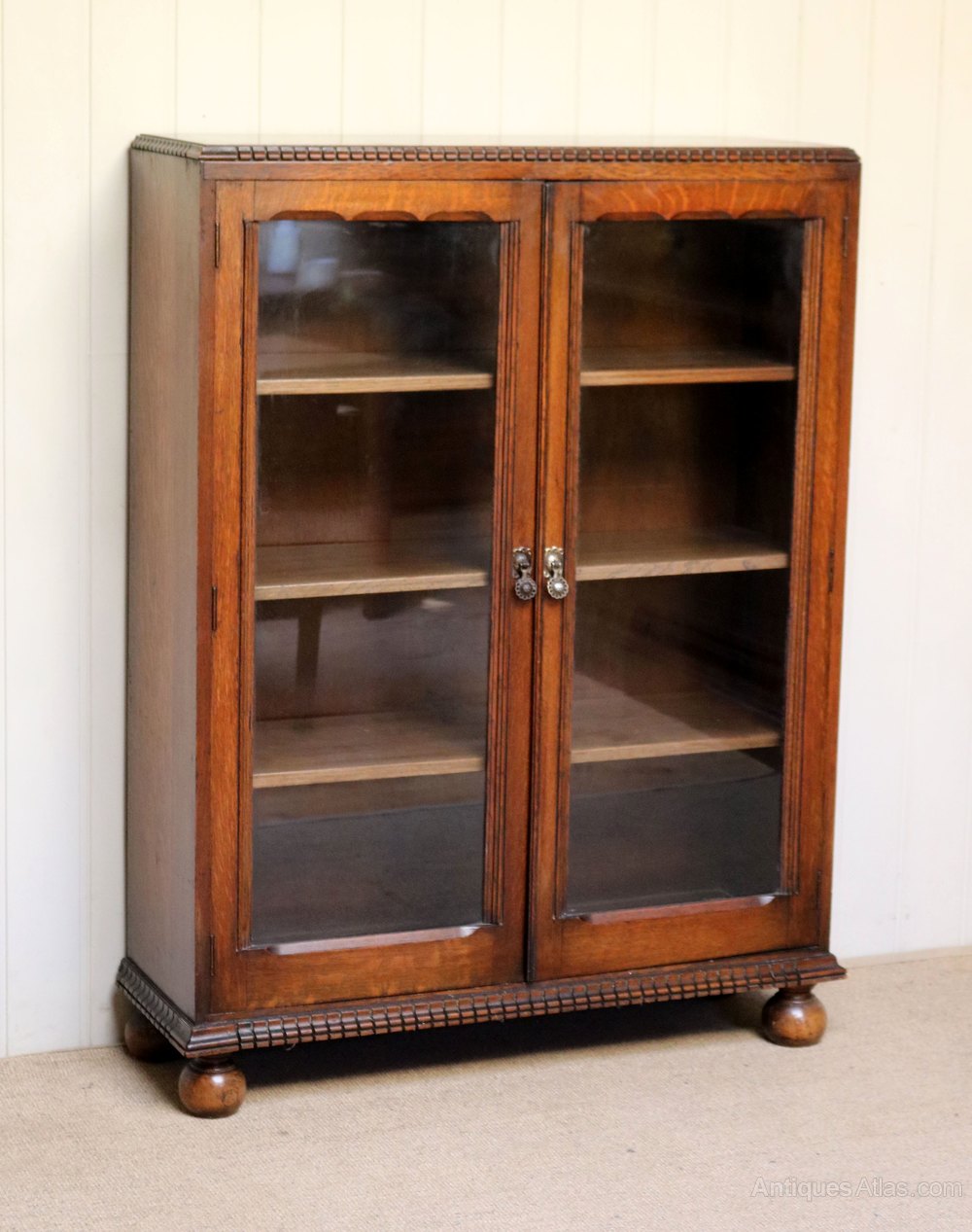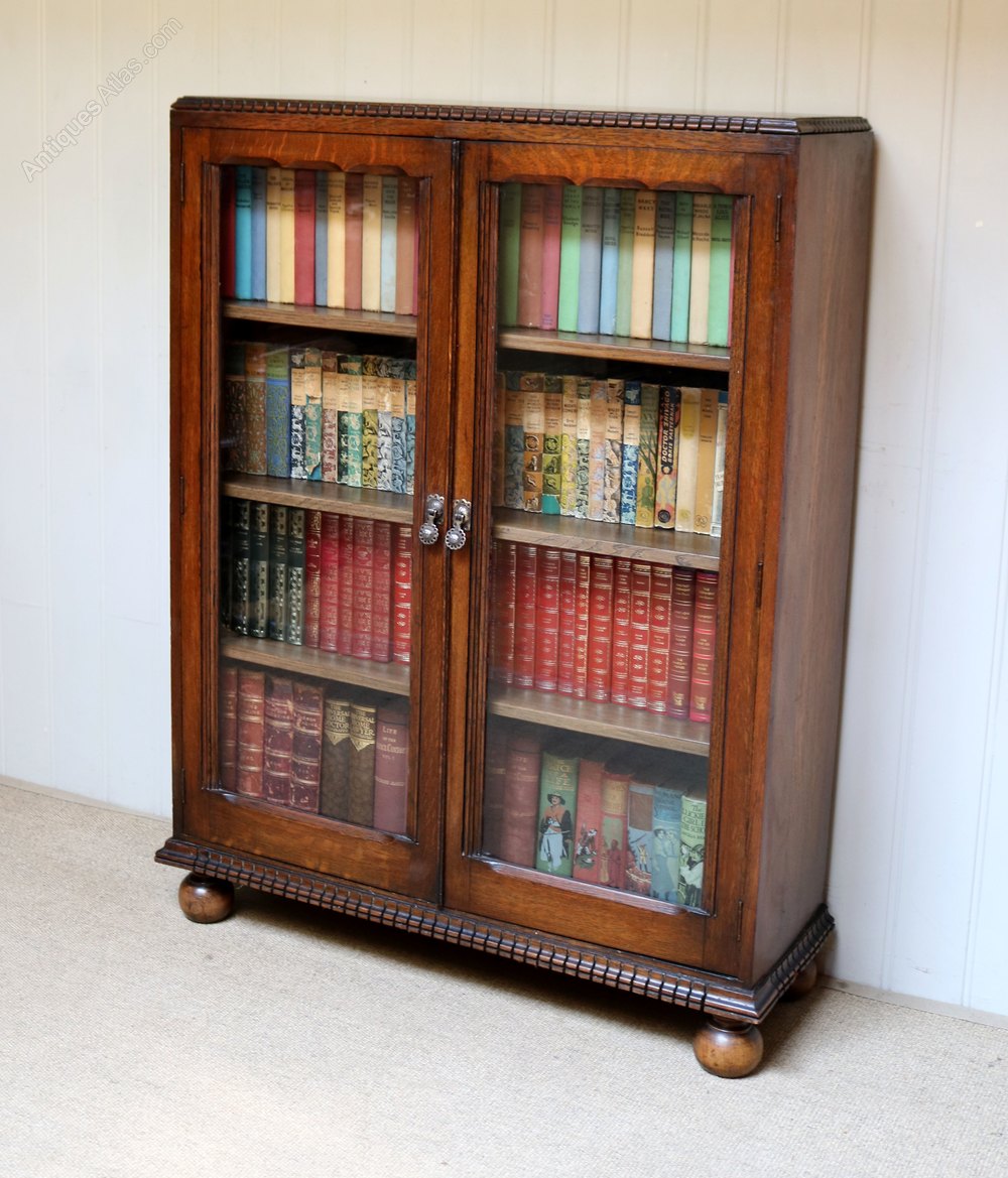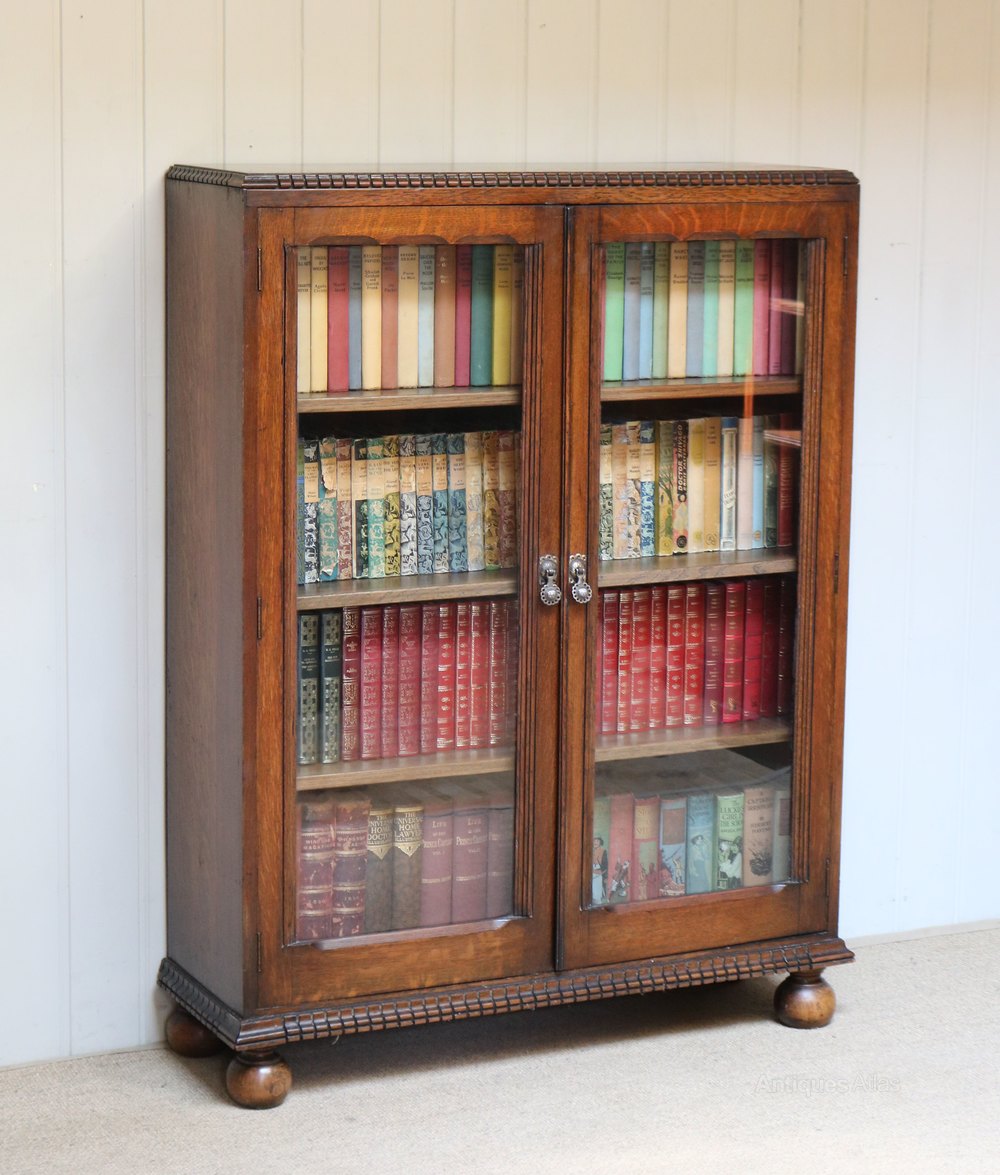1920s oak bookcase having two glazed doors with a dental moulded edge top and bottom ,having three internal adjustable shelves,raised on bracket feet. Each internal shelf is 26cm deep by 86 cm wide