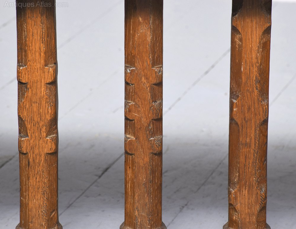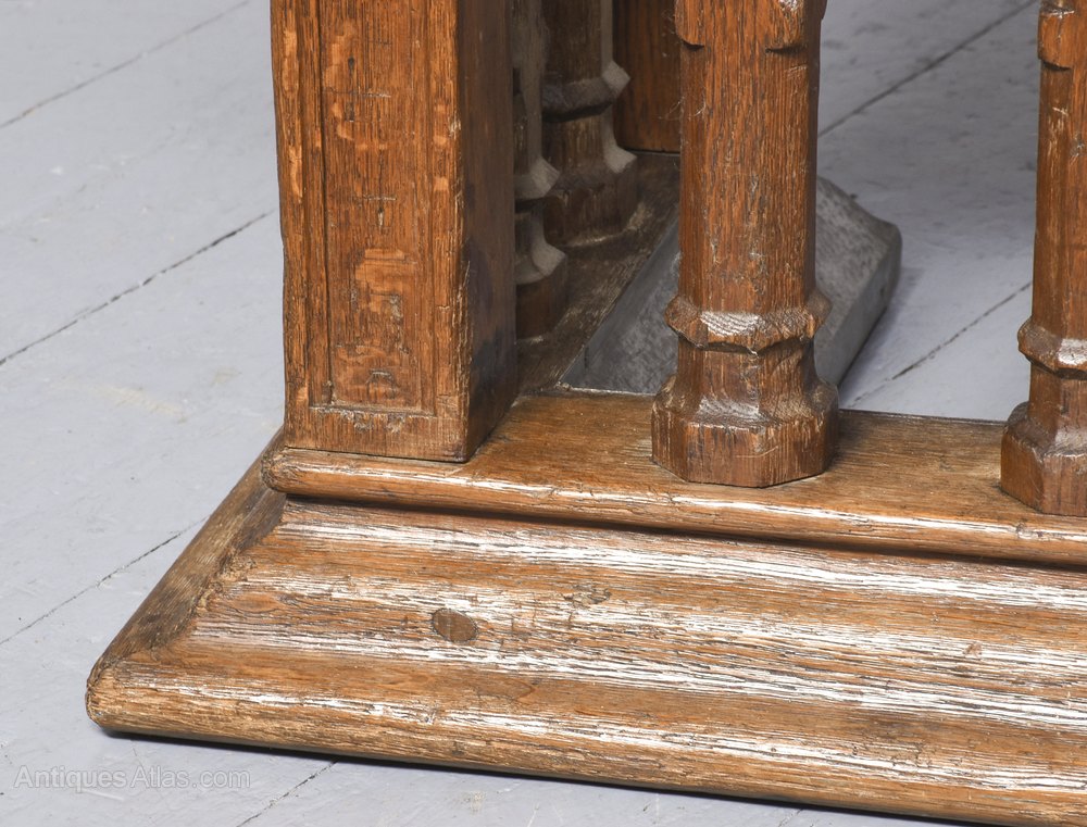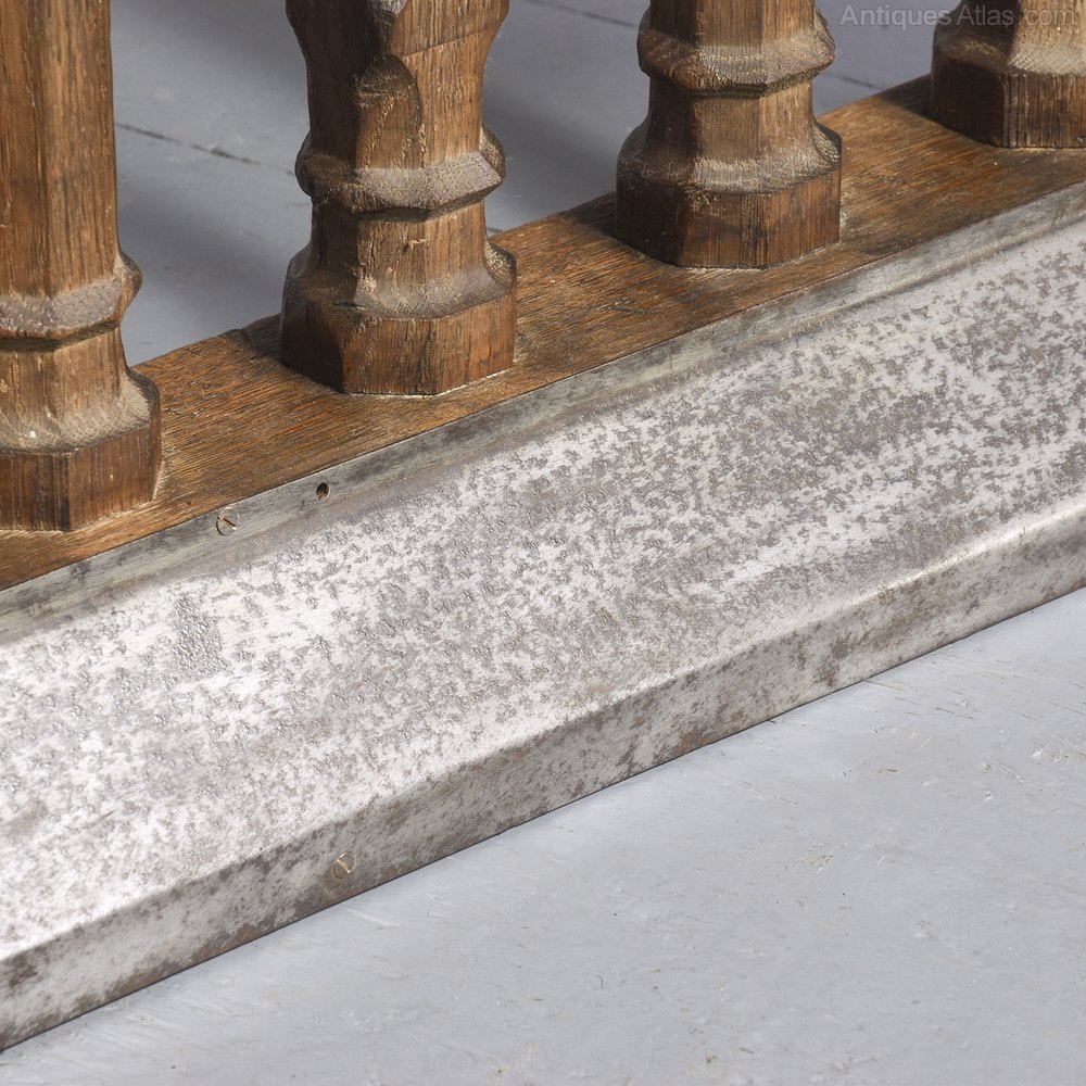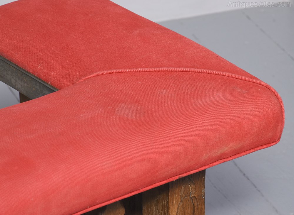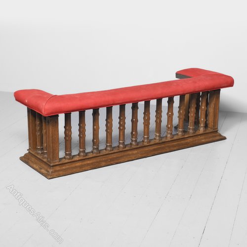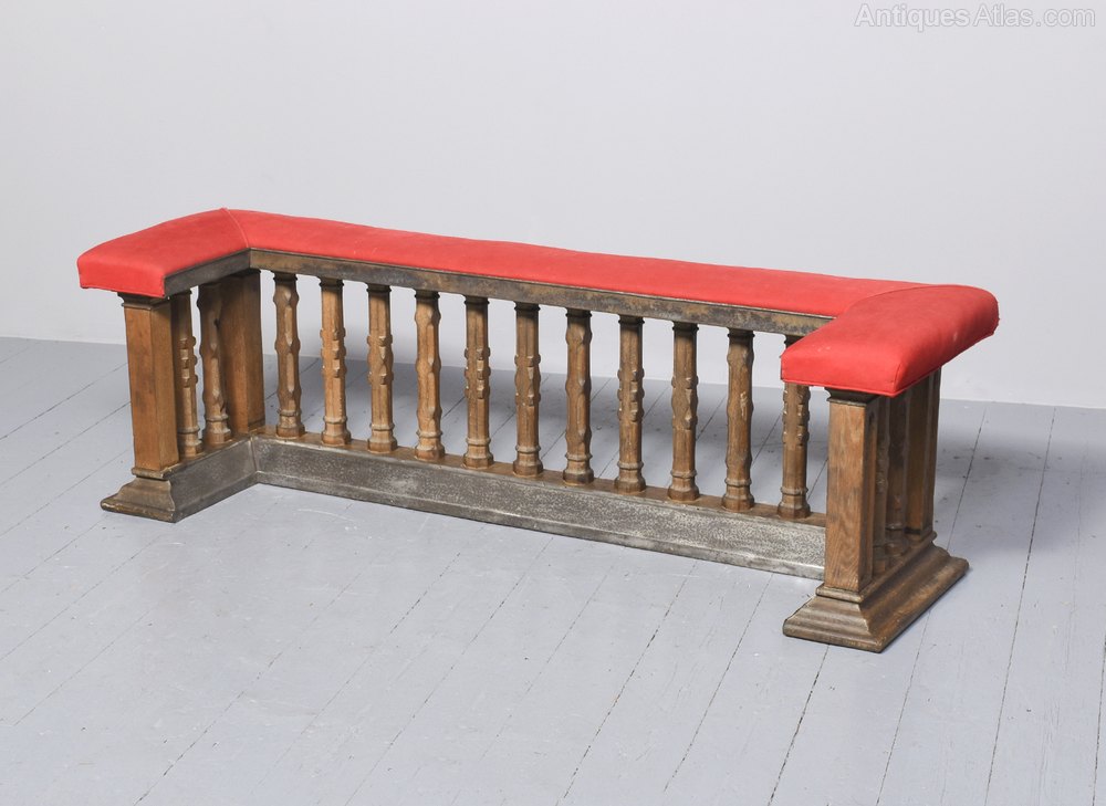 Circs 1880. An interesting oak Gothic revival club fender. The seat upholstered in red fabric with piping to the fore-edge and protective metal banding on the inside, this occurs at the base also. The fender is supported on fourteen turned and faceted uprights and four larger square columns with Gothic tracery on the facings. All the uprights are resting on a substantial base with stepped ogee mouldings and finishing as an enclosed moulded base.