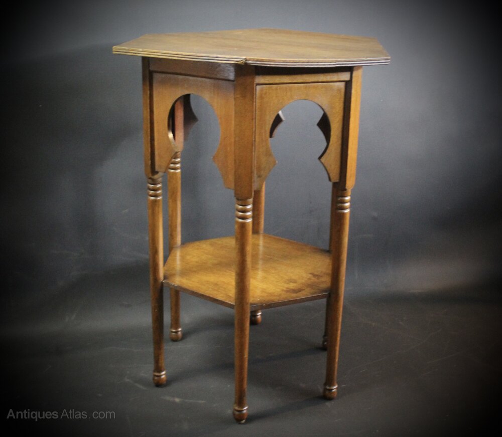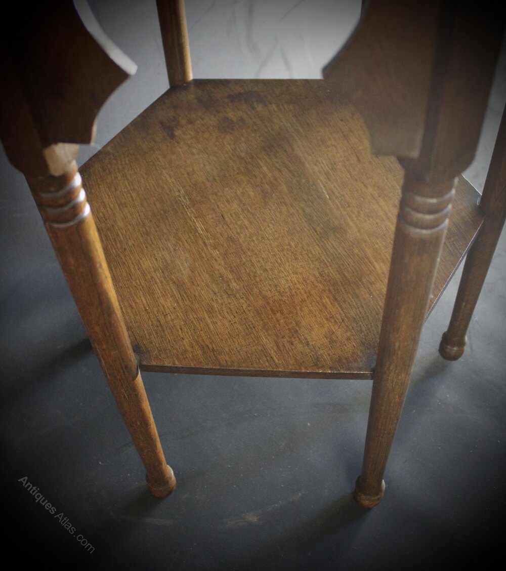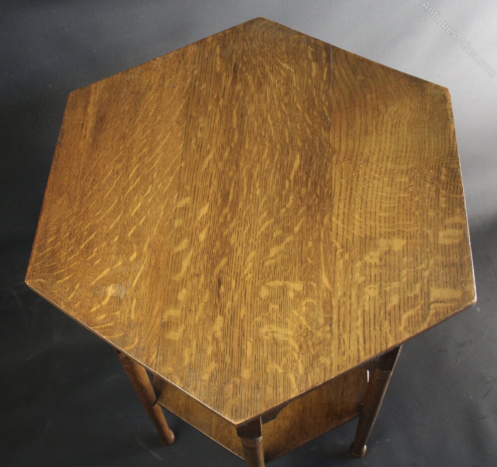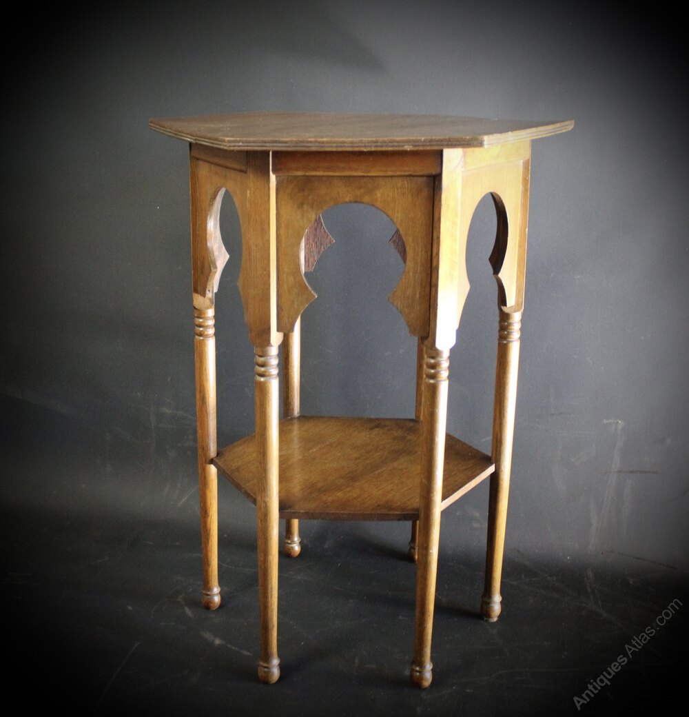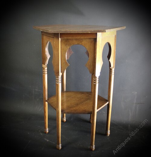 Oak hexagonal side table in the Moorish style retailed through Liberty & Co. Slight warp to top. Measures 71.5 cm high x 54 cm x 47 cm