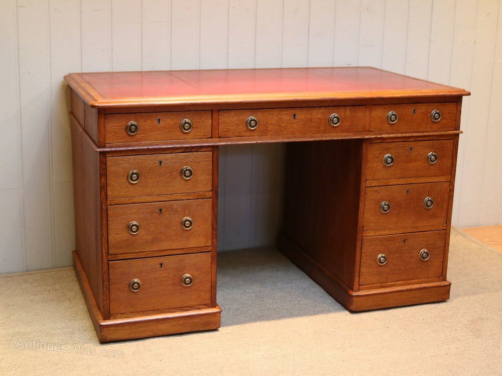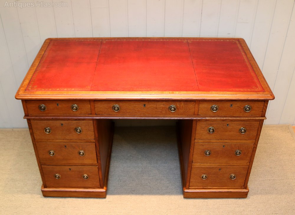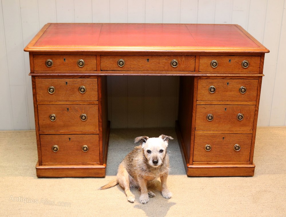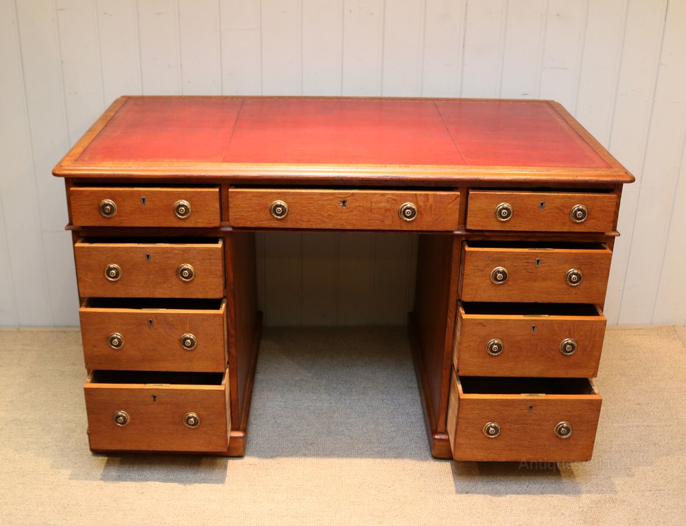 Oak pedestal desk having a red leather top with a central drawer flanked by a further four drawers to each side,having brass ring handles ,raised on a plinth base with original ceramic castors.The dimensions of the kneehole are 48.4 wide by 61cm high