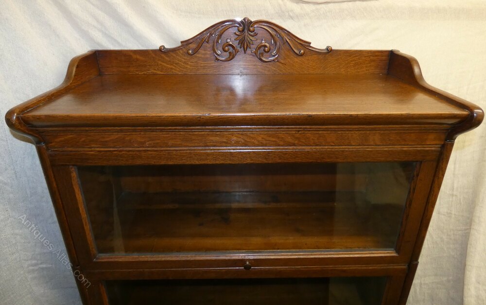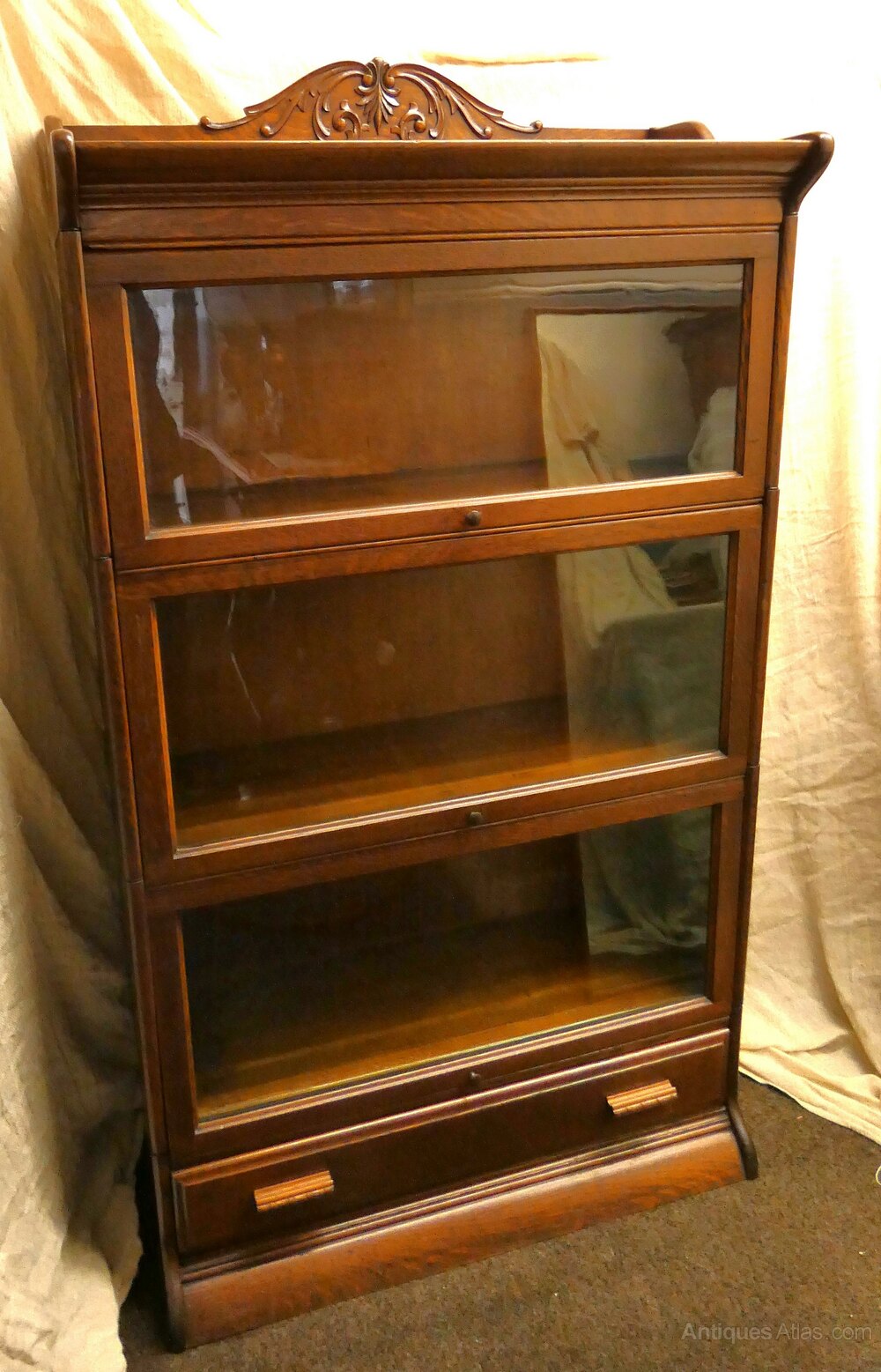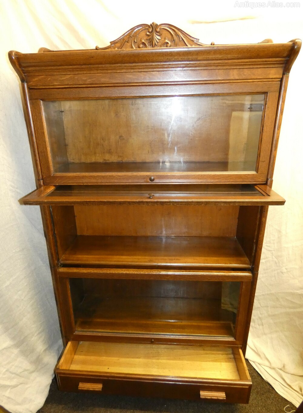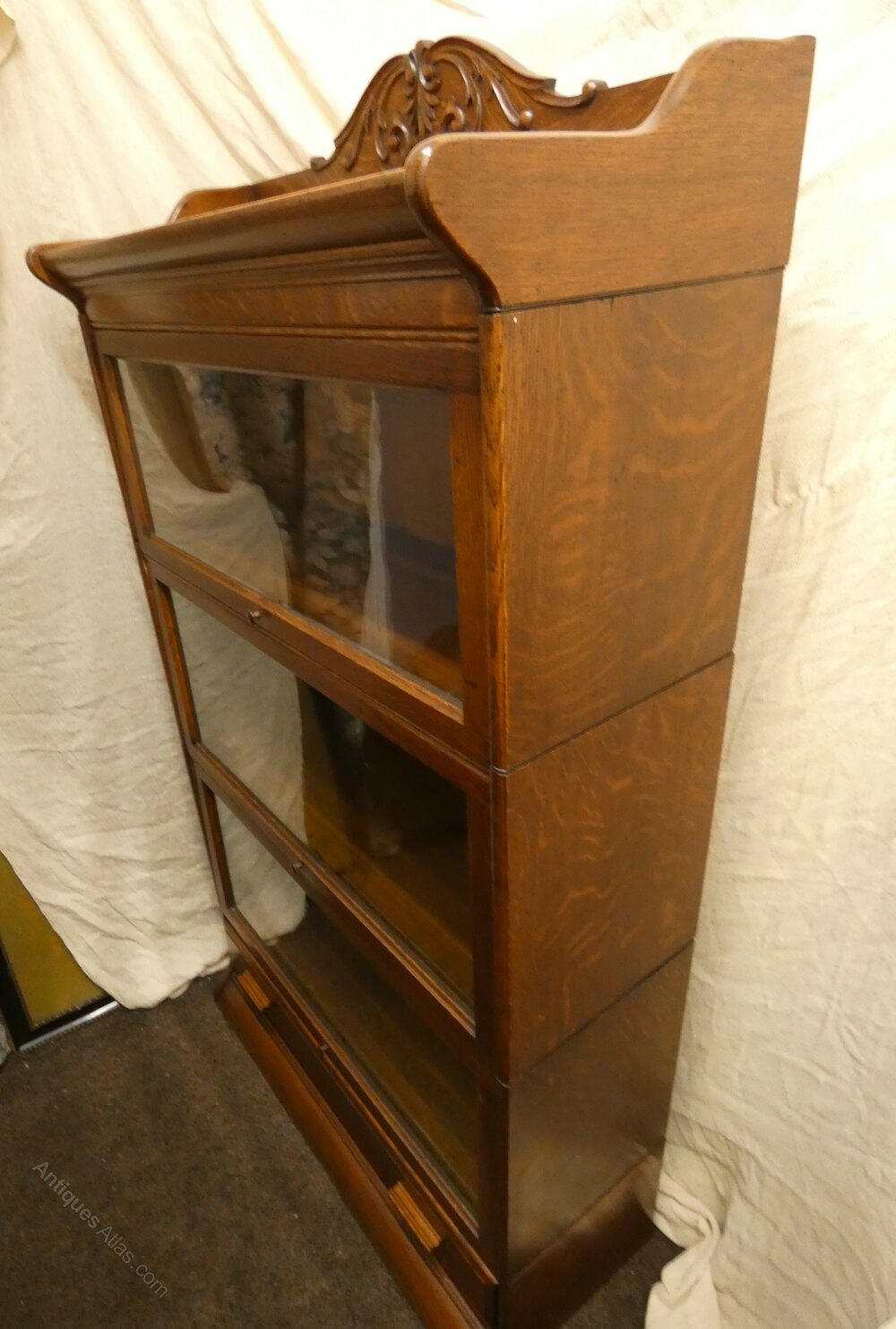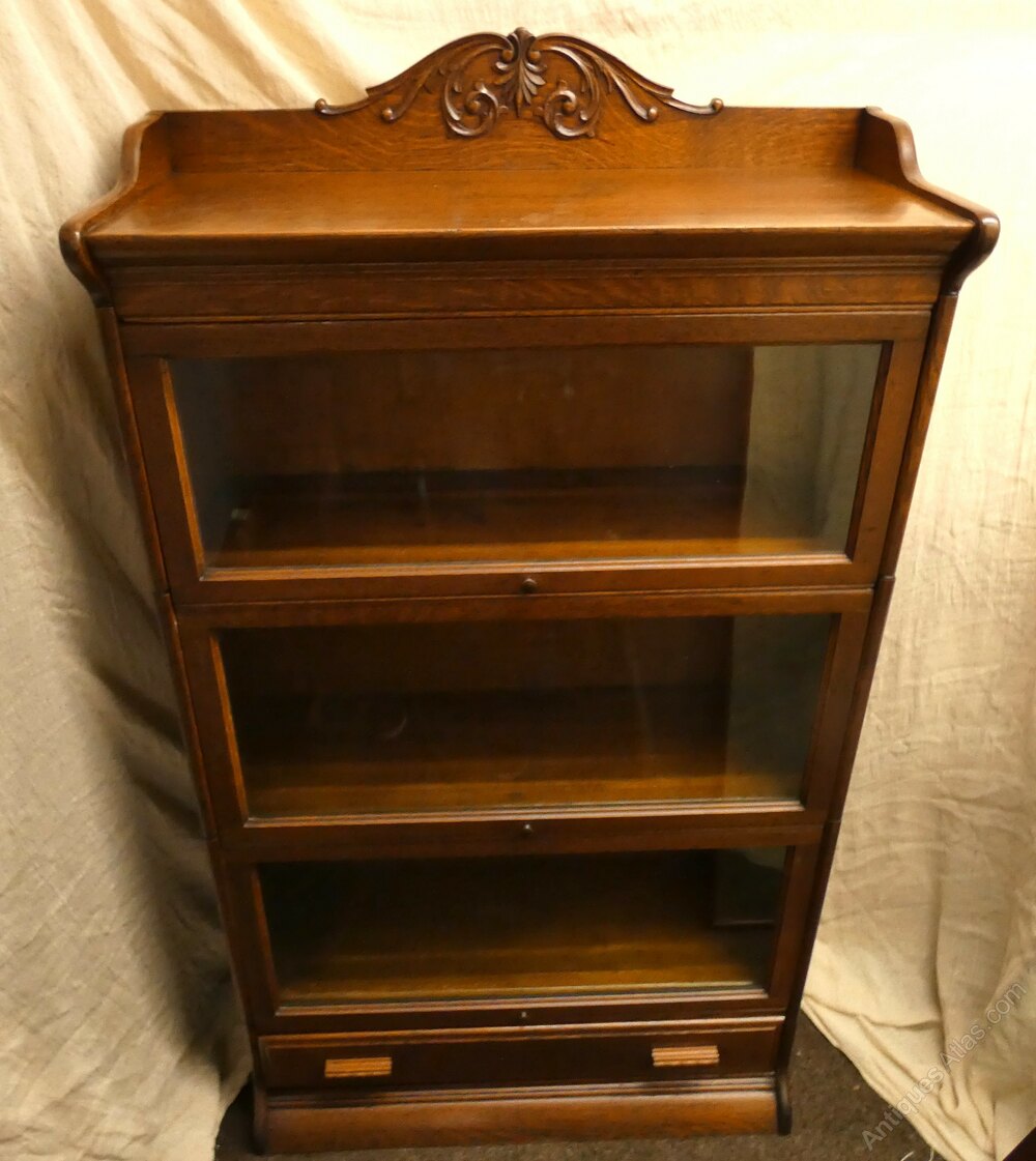 Very handsome oak stacking bookcase with lovely shaped , carved back and three deep sections with drawer to the base.