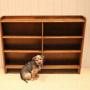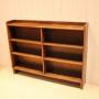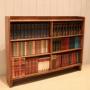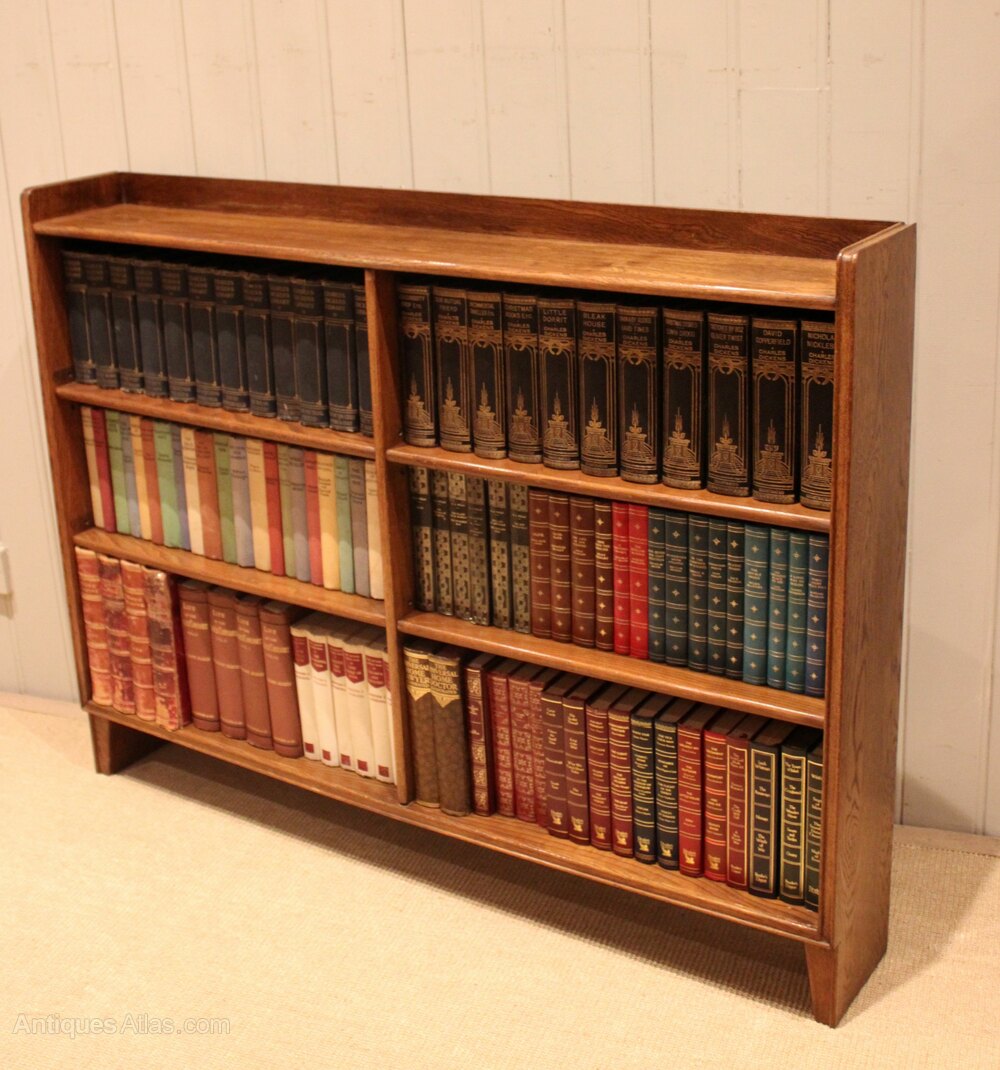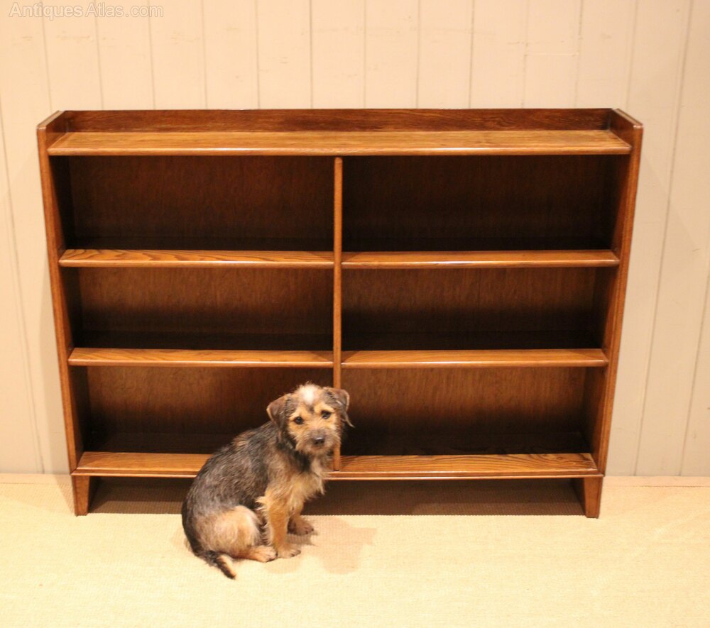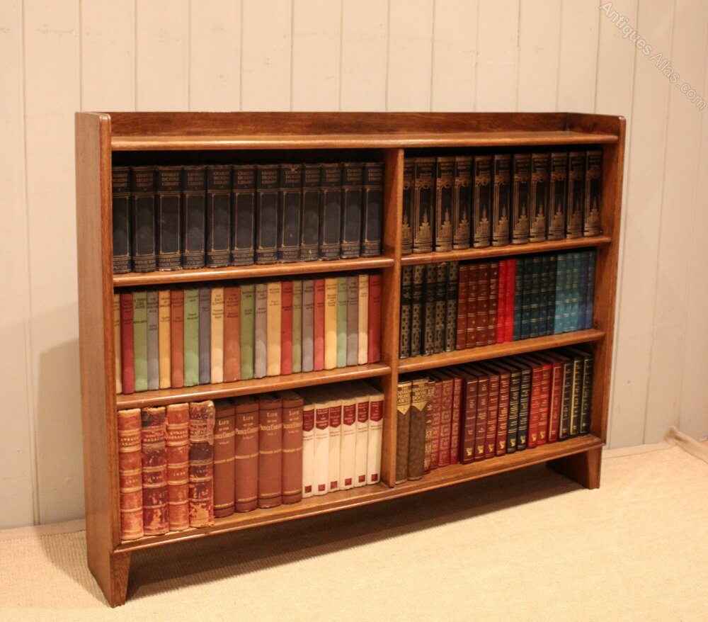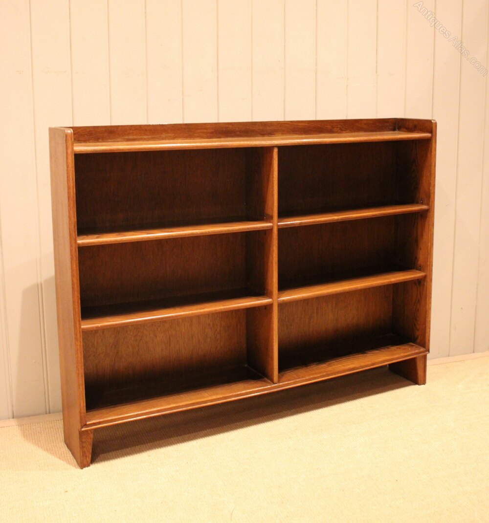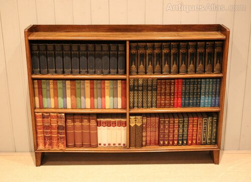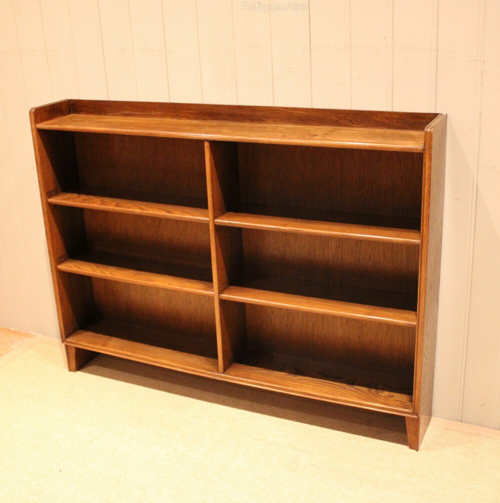 Oak open bookcase having two sections with reeded outer edges , each with two adjustable shelves , raised on short shaped feet .