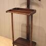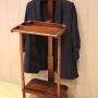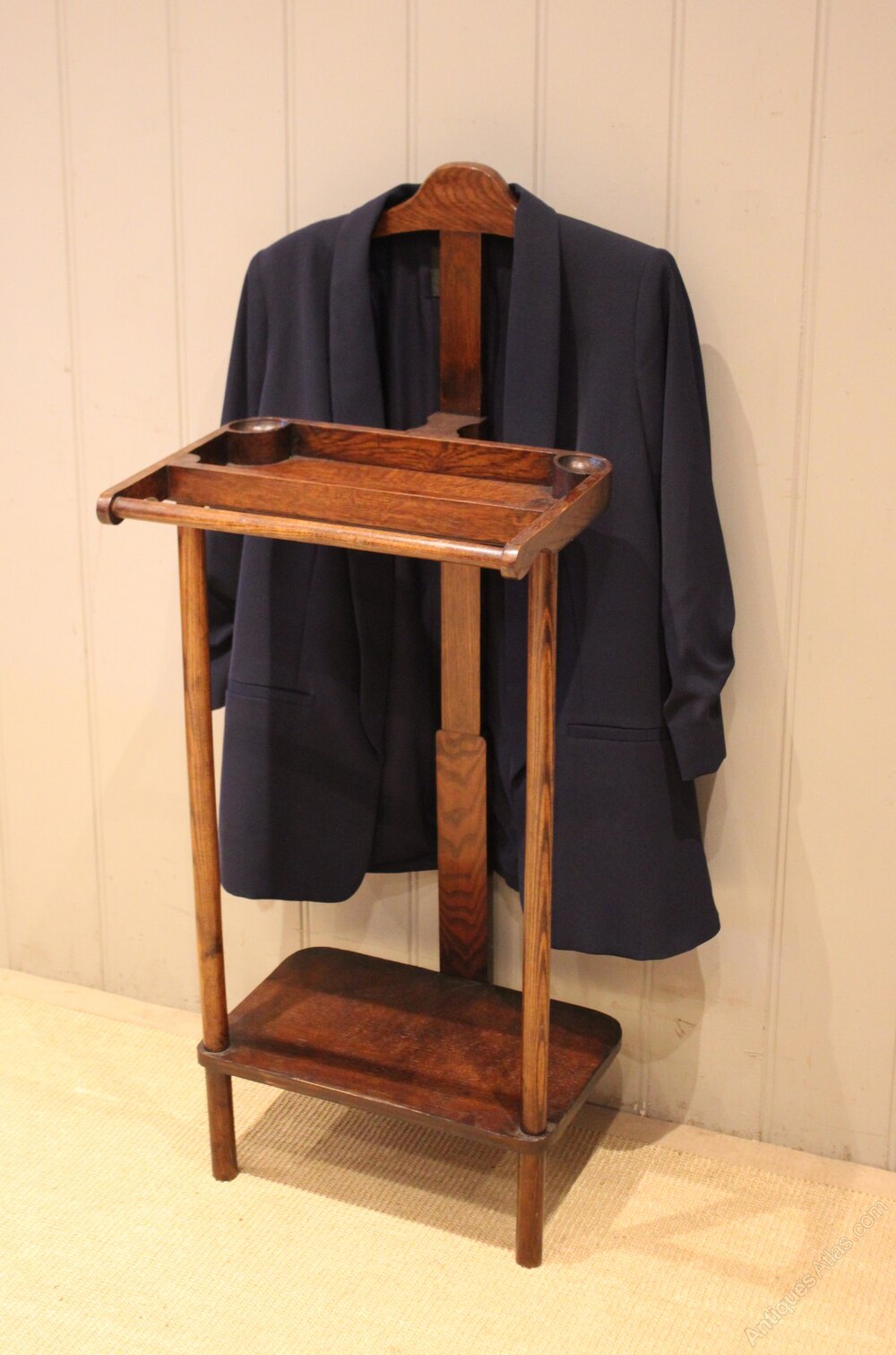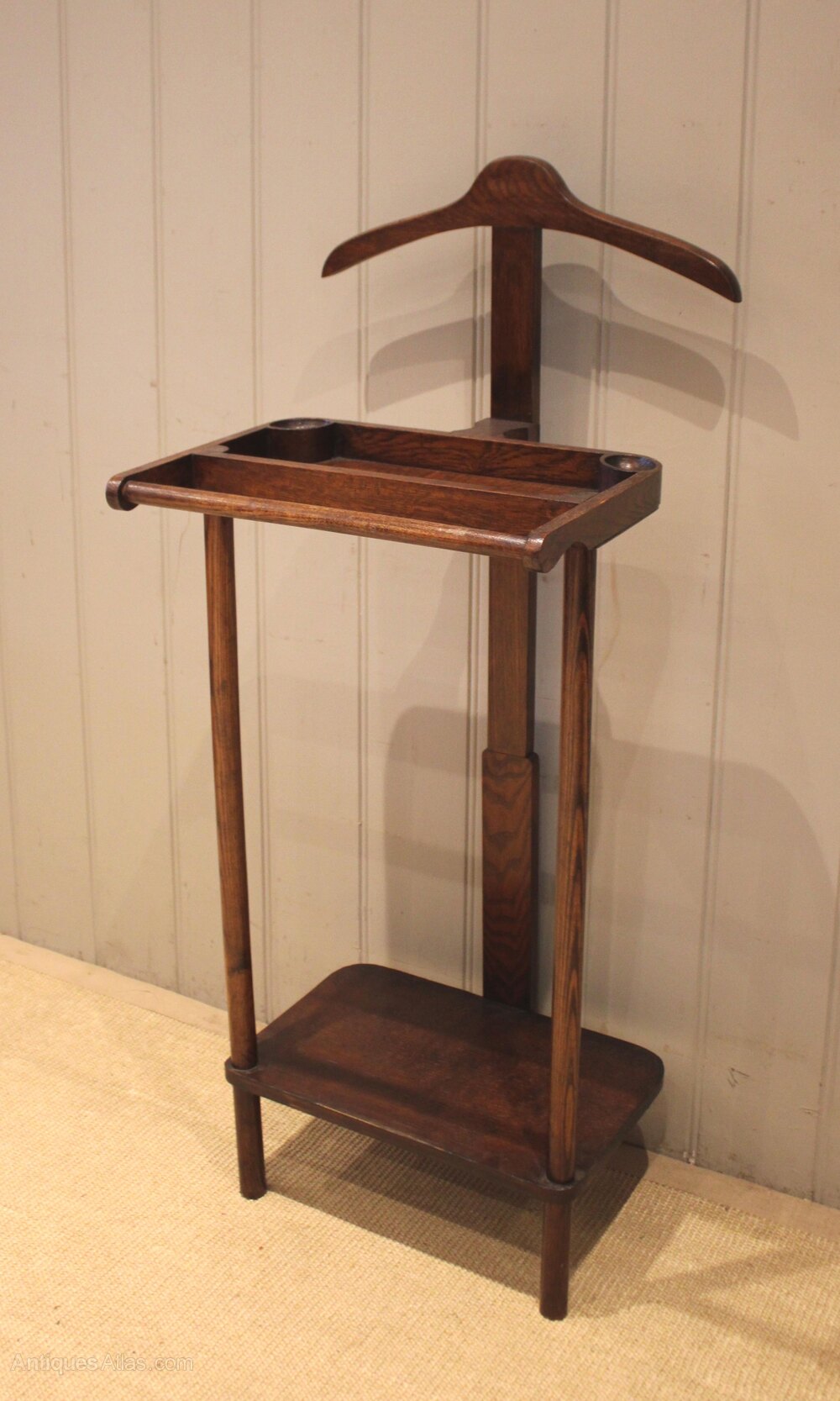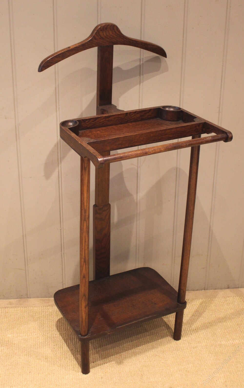 Unusual Oak valet stand having a hanger attached to a frame comprising of a sectioned tray with a trouser rail to the front and a shoe rest to the base