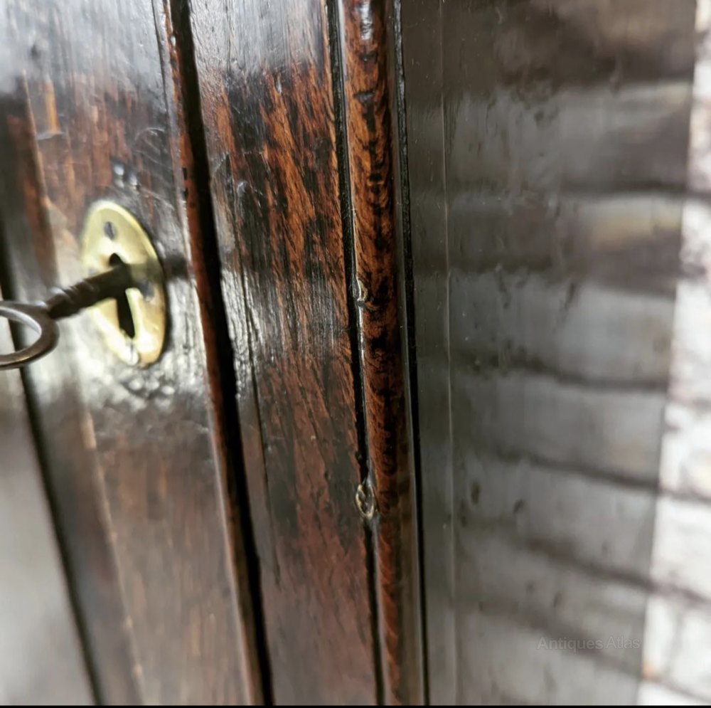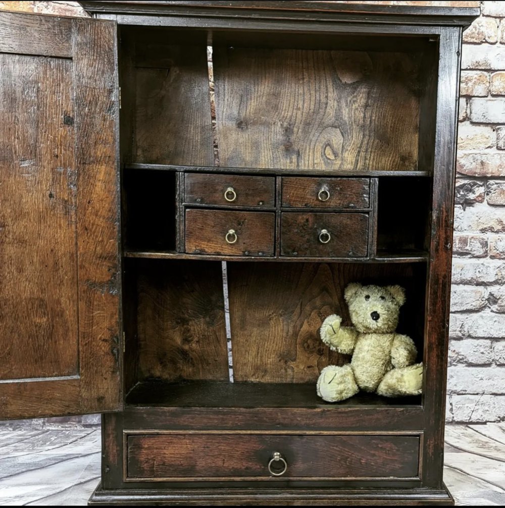 Simply beautiful, please swipe through the pictures to see the interior of this. A mid 18th century oak wall hanging cupboard, with elm back boards. Fitted inside with spice drawers and cubby holes,. Bottom drawer, working lock and key. Great patination, no restoration. 32" high and 24" wide. Roughly 9" deep.