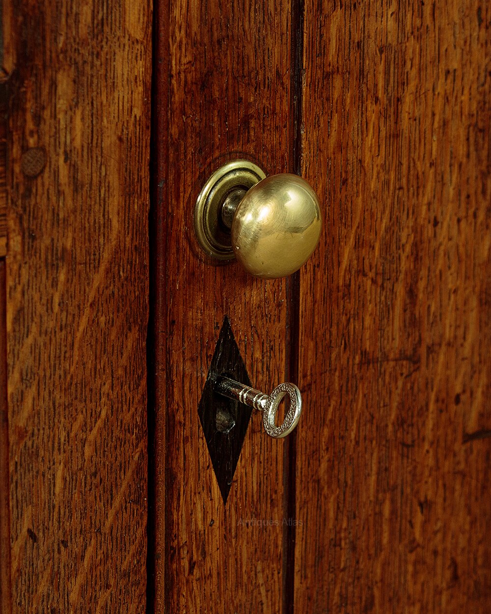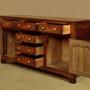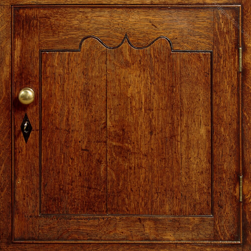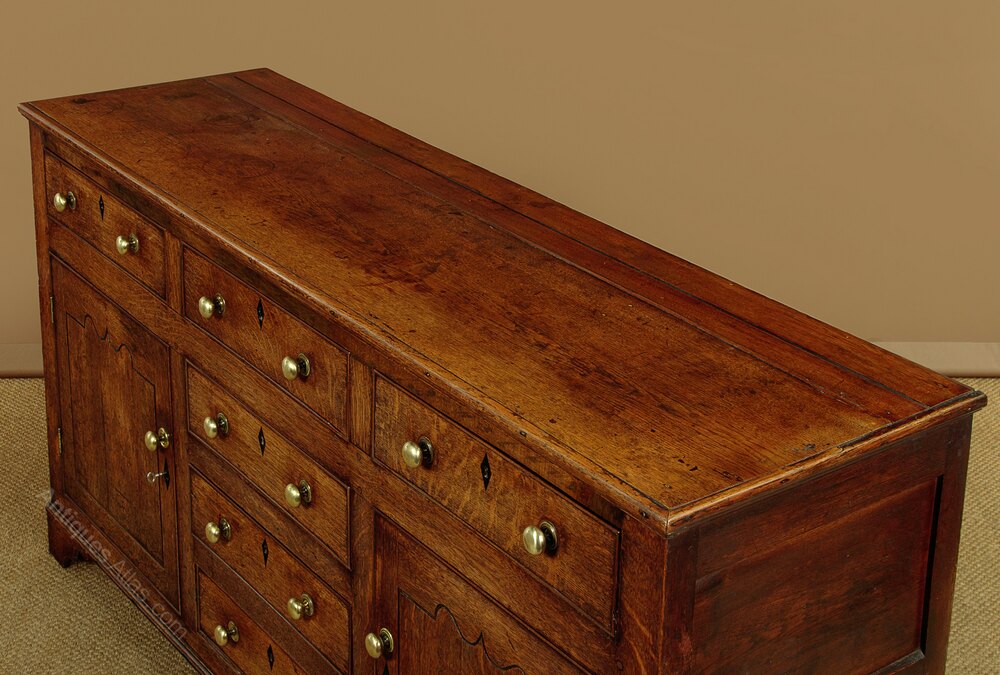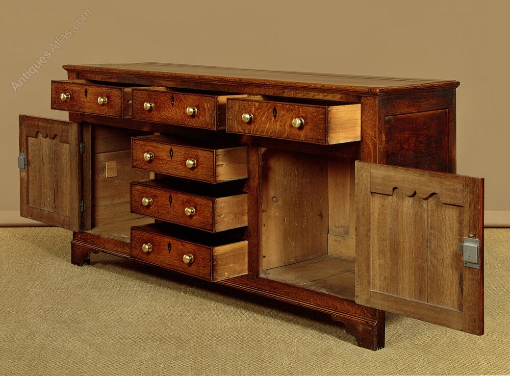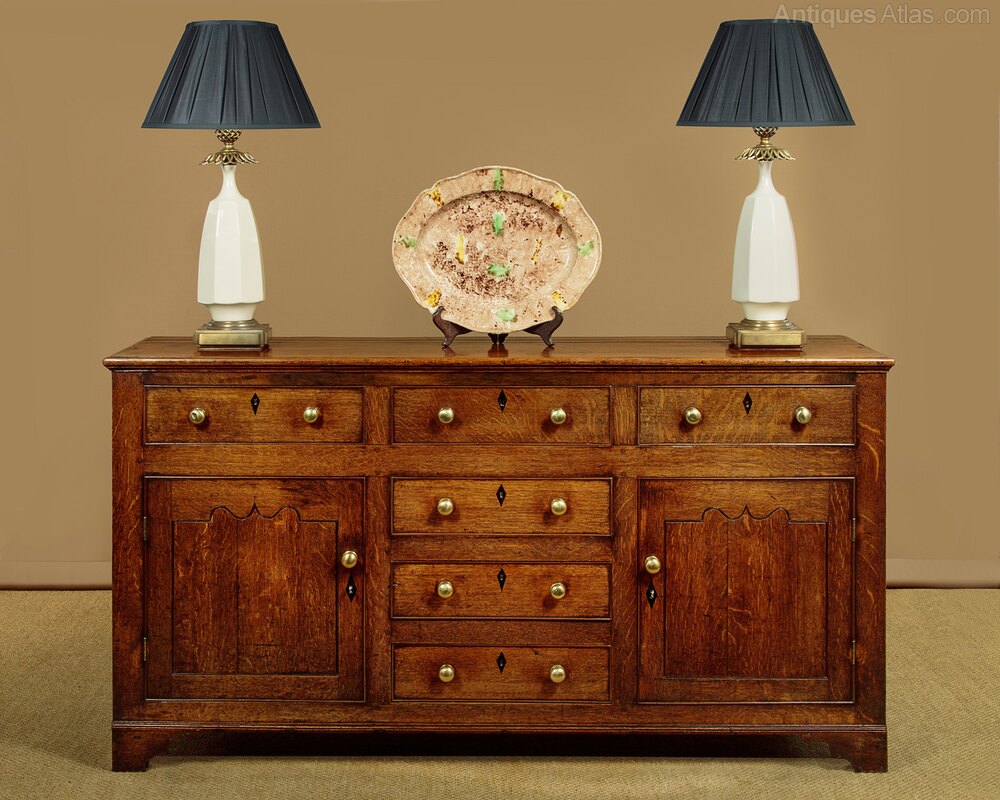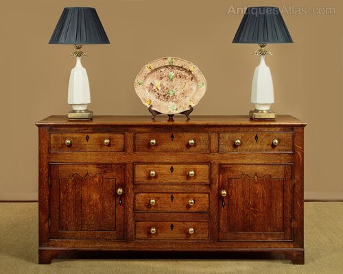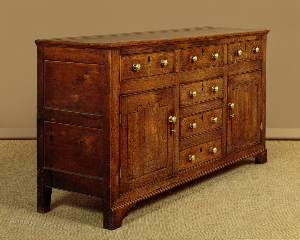 Early 19th.c. oak Welsh dresser base Caernarfonshire c.1820. Solid oak top with a plate groove at the back and an applied moulding to the edges at the front and sides. Over six working drawers and two cupboards (internal depth 17"). Attractive shaped detail to the door panels, cockbeaded edges to the drawers and doors, inlaid ebony escutcheons and the original brass knobs. Moulded base trim at and shaped bracket feet to the front. Oak panelled sides, deal back panels. Excellent colour and condition, cleaned and waxed in our workshops. Keys supplied for both doors.