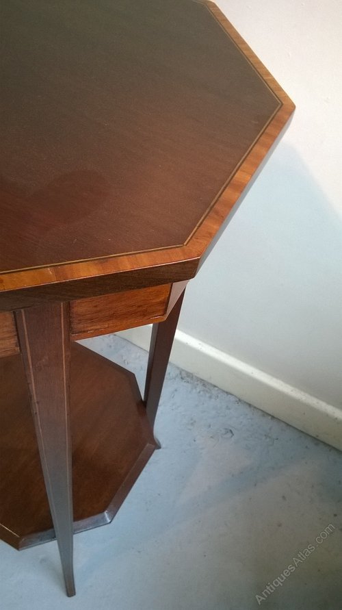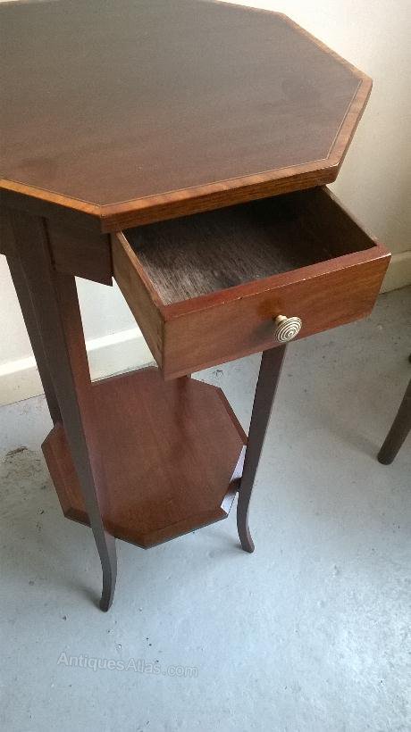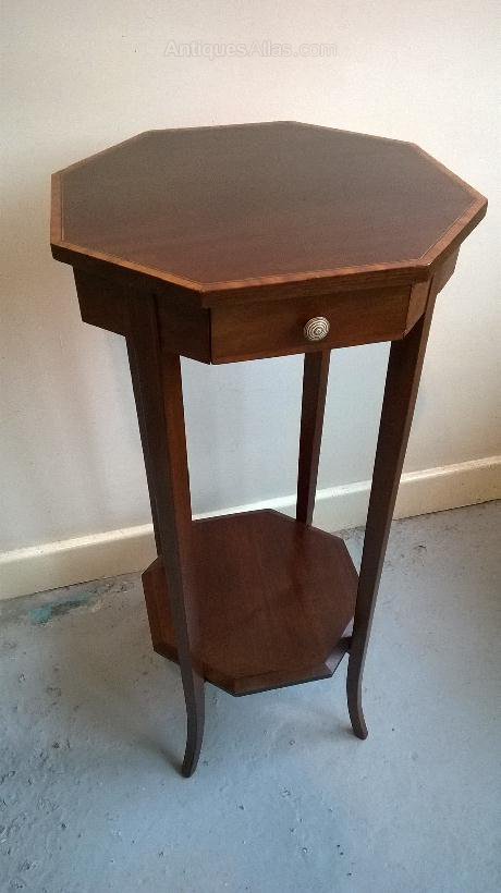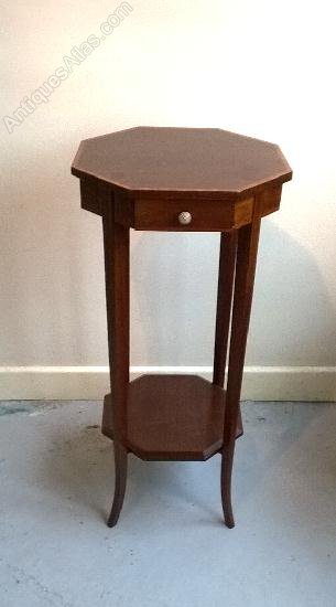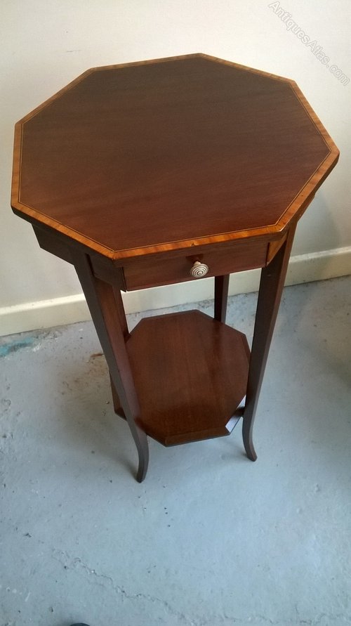 A pretty little occasional table from circa 1900. This inlaid mahogany example has the useful little drawer with a neat turned handle. The top is inlaid around the octagonal top and the legs have a stringing detail down the length. This would make a great lamp table as it takes up little space, could carry a decorative ornament or anything similar, could even be a bedside table. So much versatility in a neat little package at a price that should have everyone rushing to the cash machine.....Sorry sold