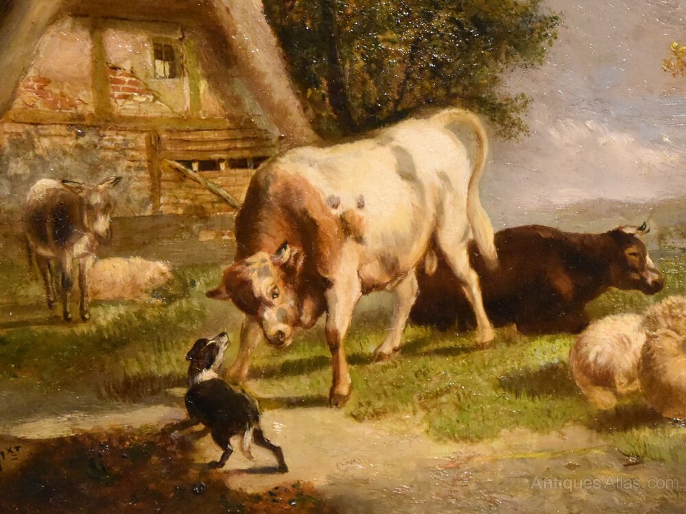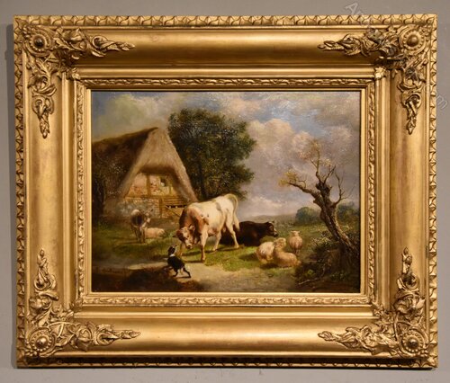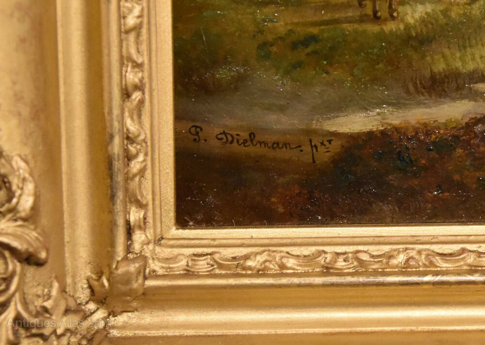 Oil Painting by Pierre Emmanuel Dielmans "A Farmyard Scene" 1829 - 1902 Son of Pierrw Emmanuel Dielmans, senior 1800-1858, a Belgian artist who Belgian artist who painted rural landscapes set in the low countries. Oil on panel. Signed and fine original frame.