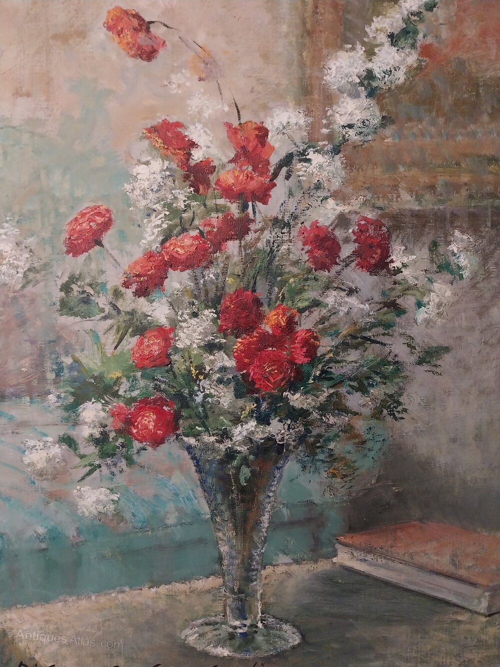 The impressionist artist Giuseppe Cavasanti has used lively strong colours in this very fine still life floral interior scene flowers in a glass vase next to a book in the foreground and a painting hangs on the wall in the background.