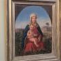 The baby Jesus is depicted naked holding the Salvator Mundi in his left hand, his mother Mary with halo, seated in foliage with Bethlehem in the distance.