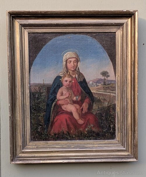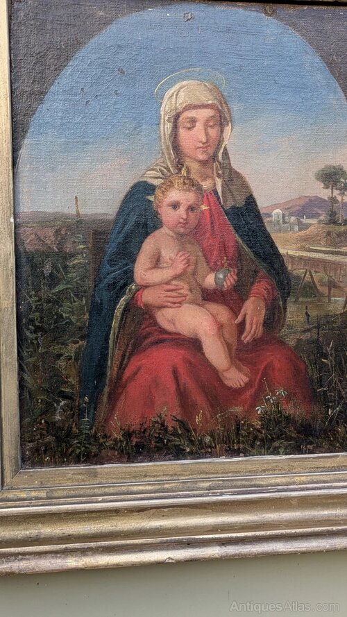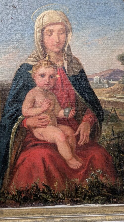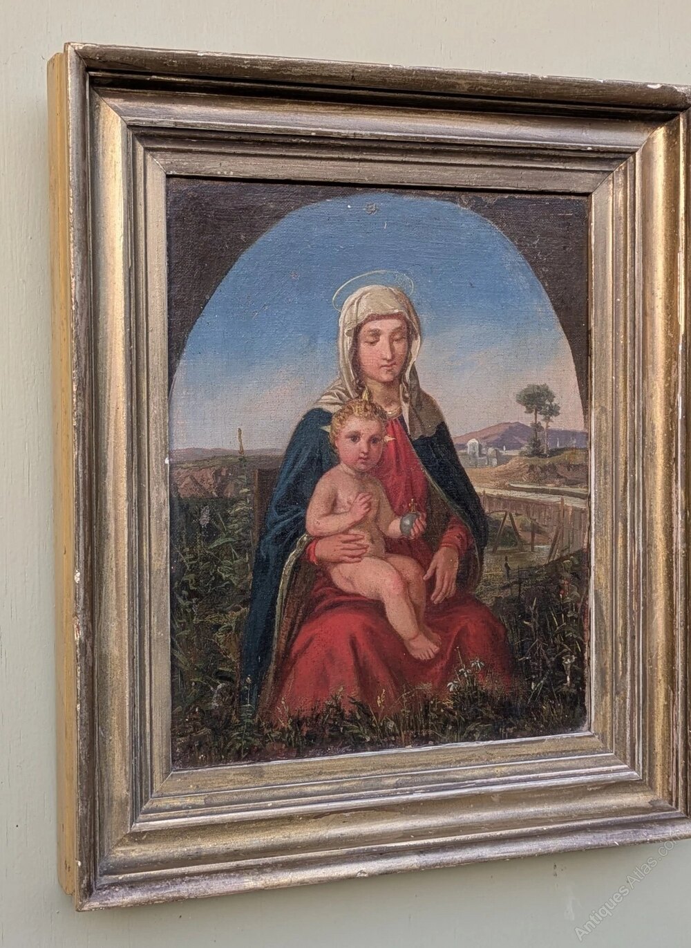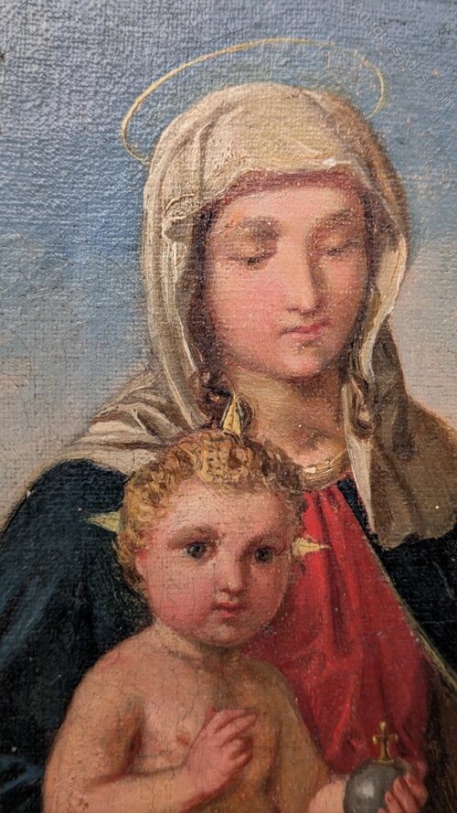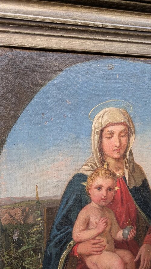 This is a charming 19th century oil painting of the Madonna and child painted on canvas circa 1890.