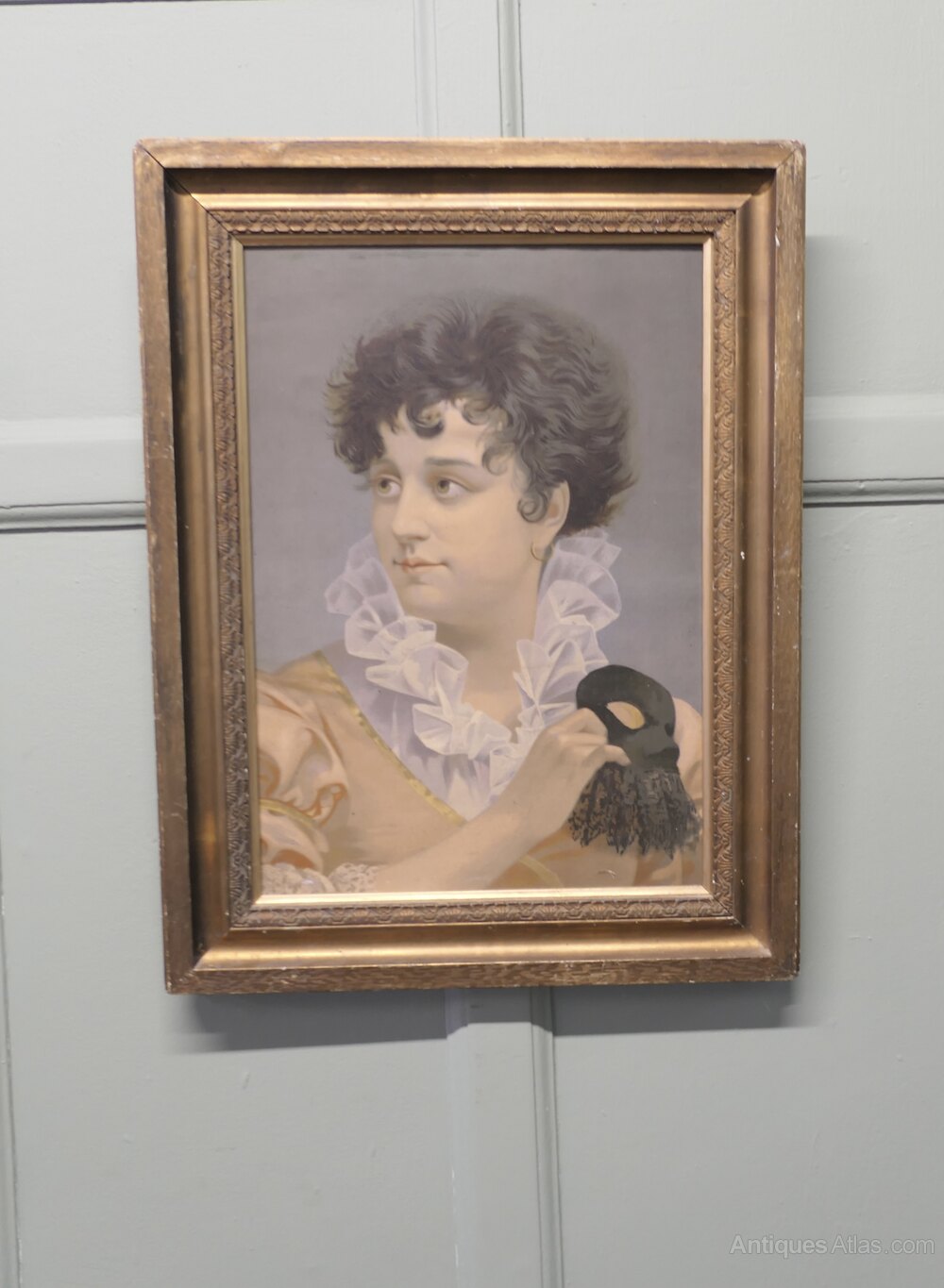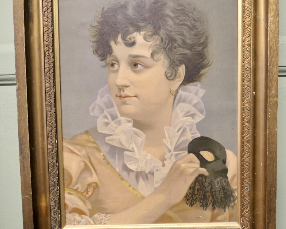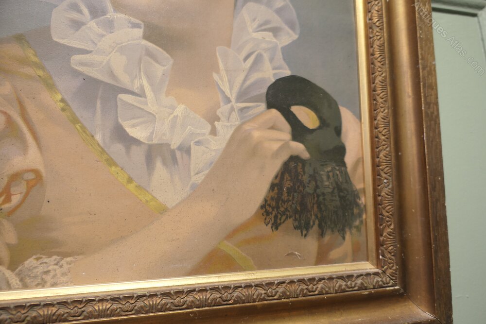A delightful portrayal of a playful young lady she is dressed wearing Satin, Silk and Ruffles she is holding a black Lacy mask, going by the costume we can take the date to be around 1the late 18th century